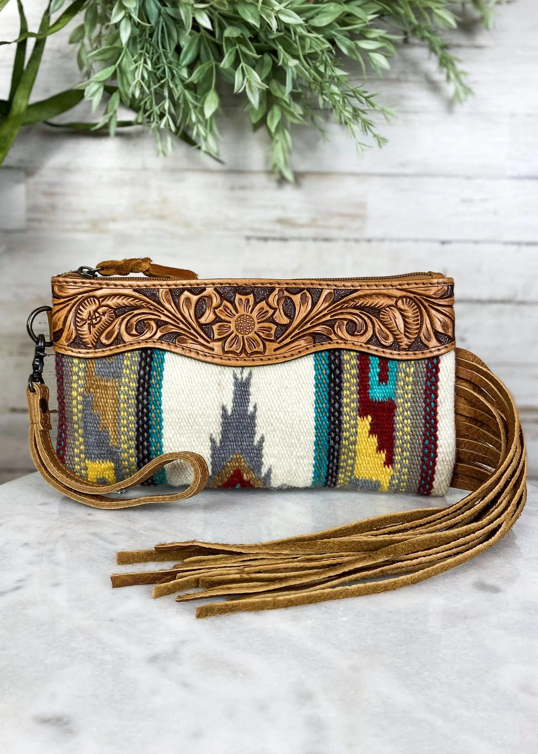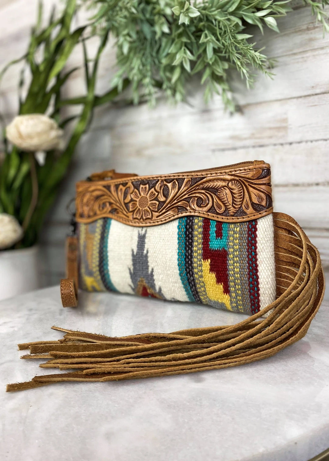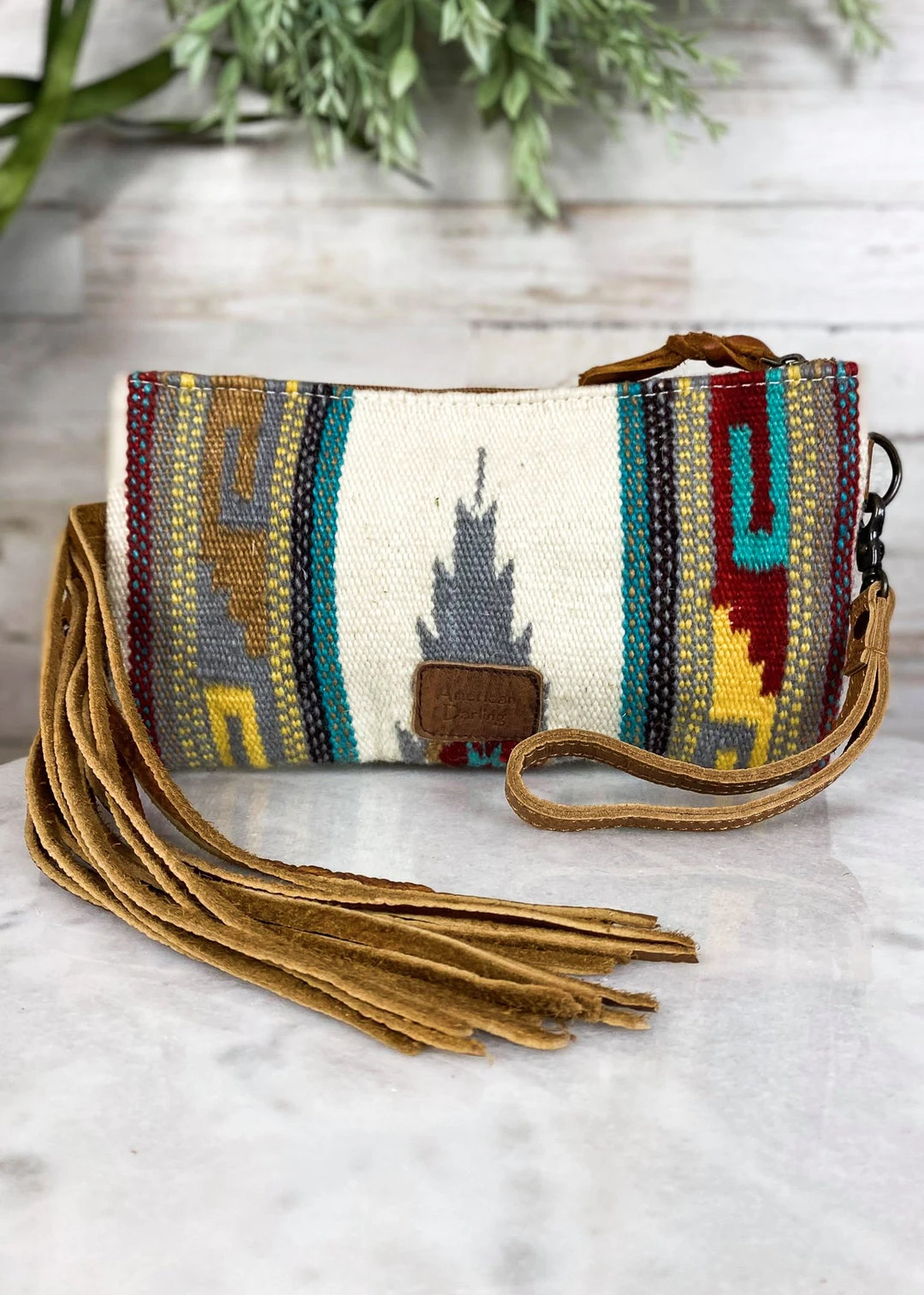 - Elevate your accessory game with the American Darling Aztec Saddle Blanket Wristlet/Clutch. Its unique Aztec design adds a touch of bohemian charm to any outfit.
