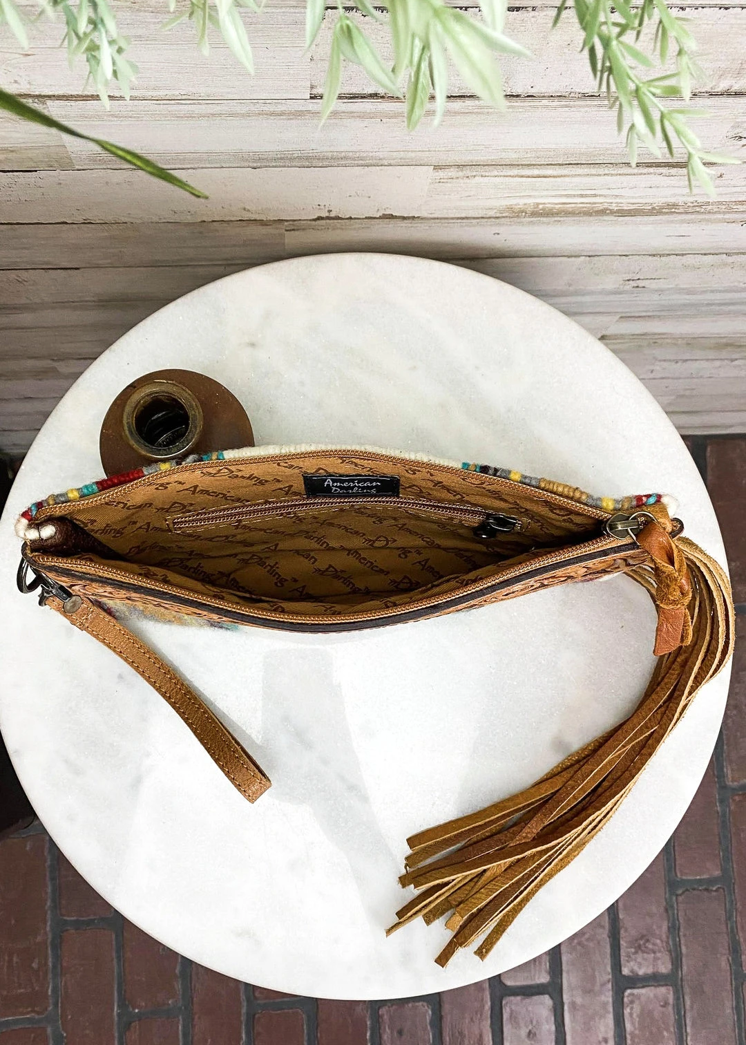 - Crafted with high-quality materials, the American Darling Wristlet/Clutch ensures durability and long-lasting use. The saddle blanket texture adds a rustic yet elegant appeal.
