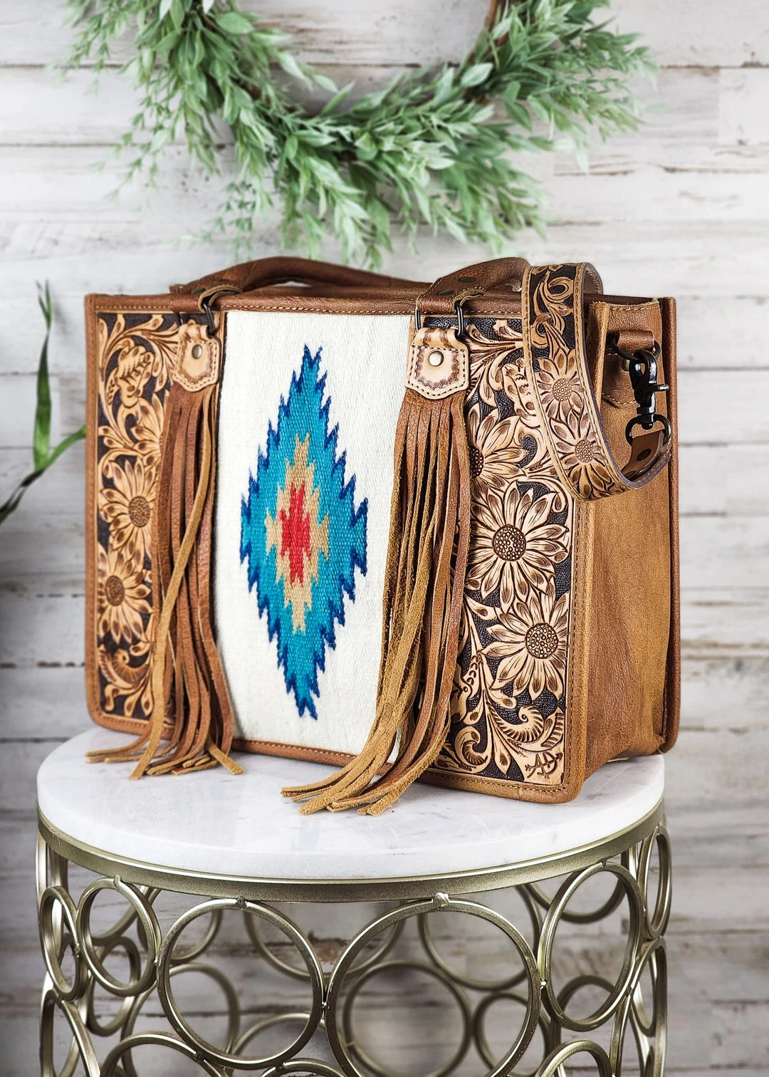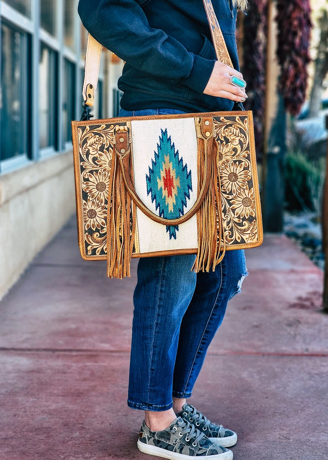 - Stylish and Functional: The American Darling Aztec Tooled Tote Handbag is designed for women who value both style and functionality. Its cream color and Aztec tooled design make it a fashionable accessory for any outfit.