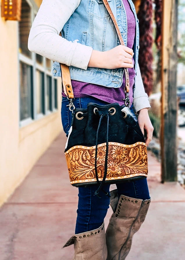 - Perfect for any occasion, this handbag is a must-have addition to your collection. Order now and elevate your style with the American Darling Cowhide Tooled Bucket Handbag.