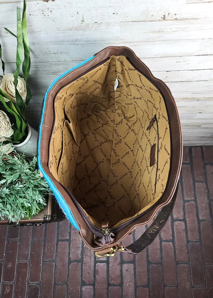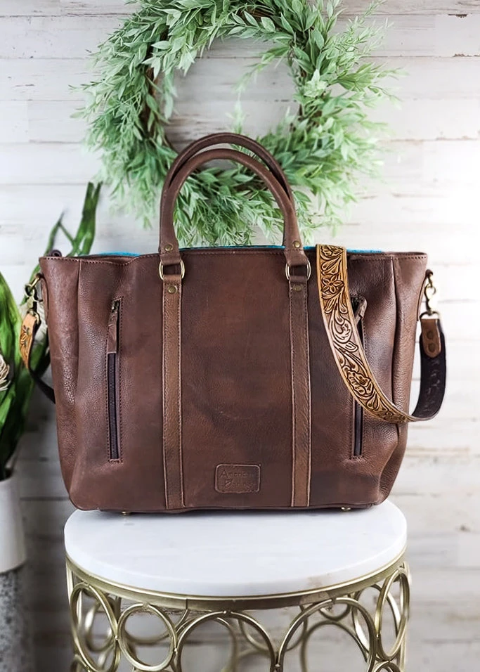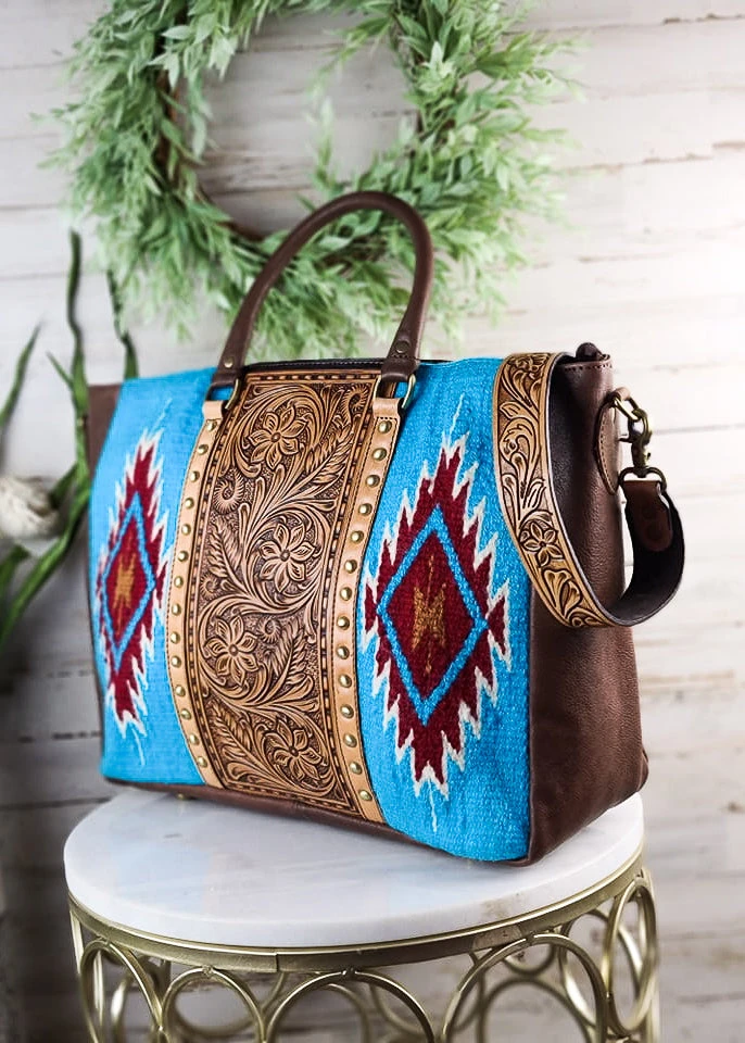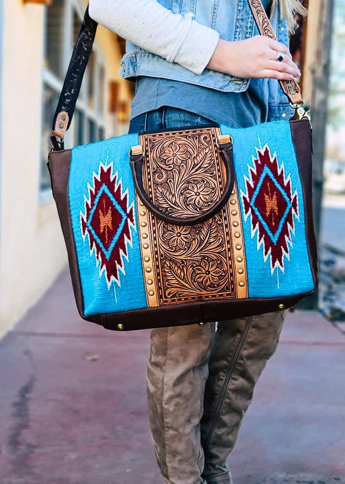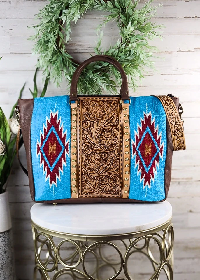 - Stay stylish and secure with the American Darling Blue Aztec Elvira Concealed Carry Tote Handbag. Designed for the modern woman who values both fashion and safety.