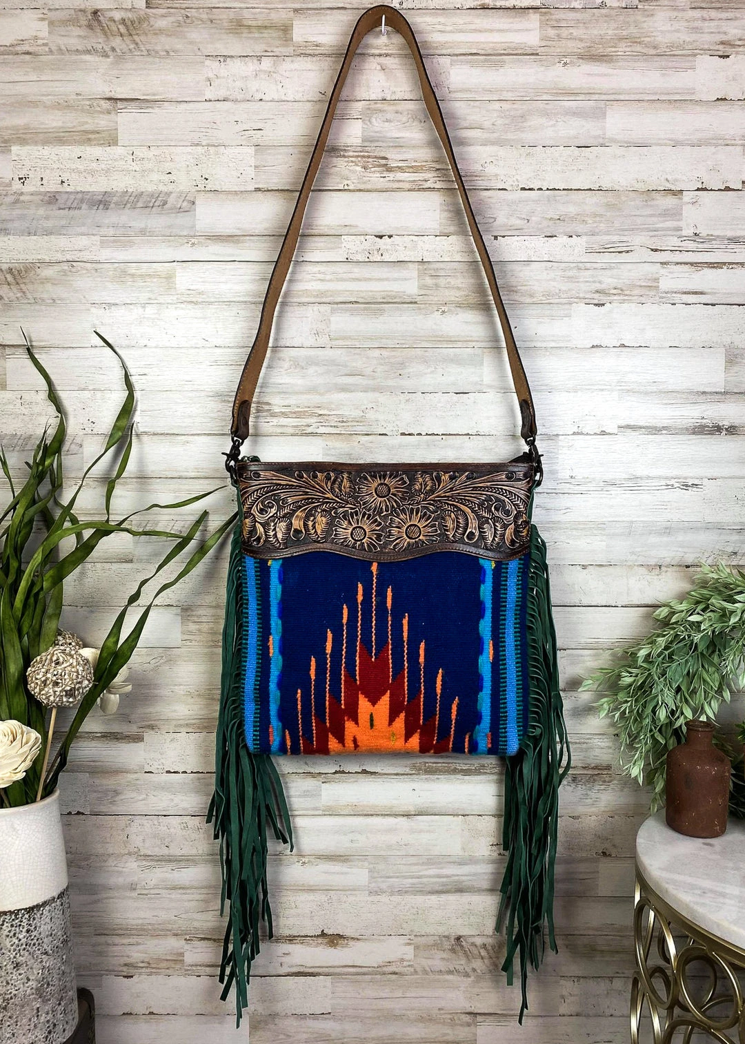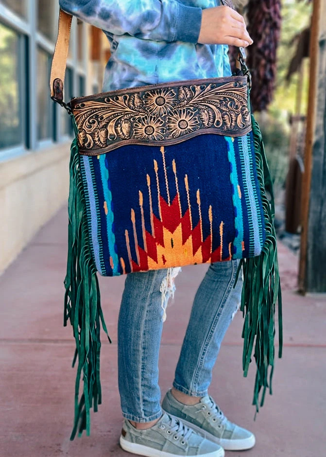 - Elevate your style with the American Darling Blue & Green Aztec Fringe Crossbody Handbag. Its vibrant colors and unique Aztec design make it a standout accessory for any occasion.