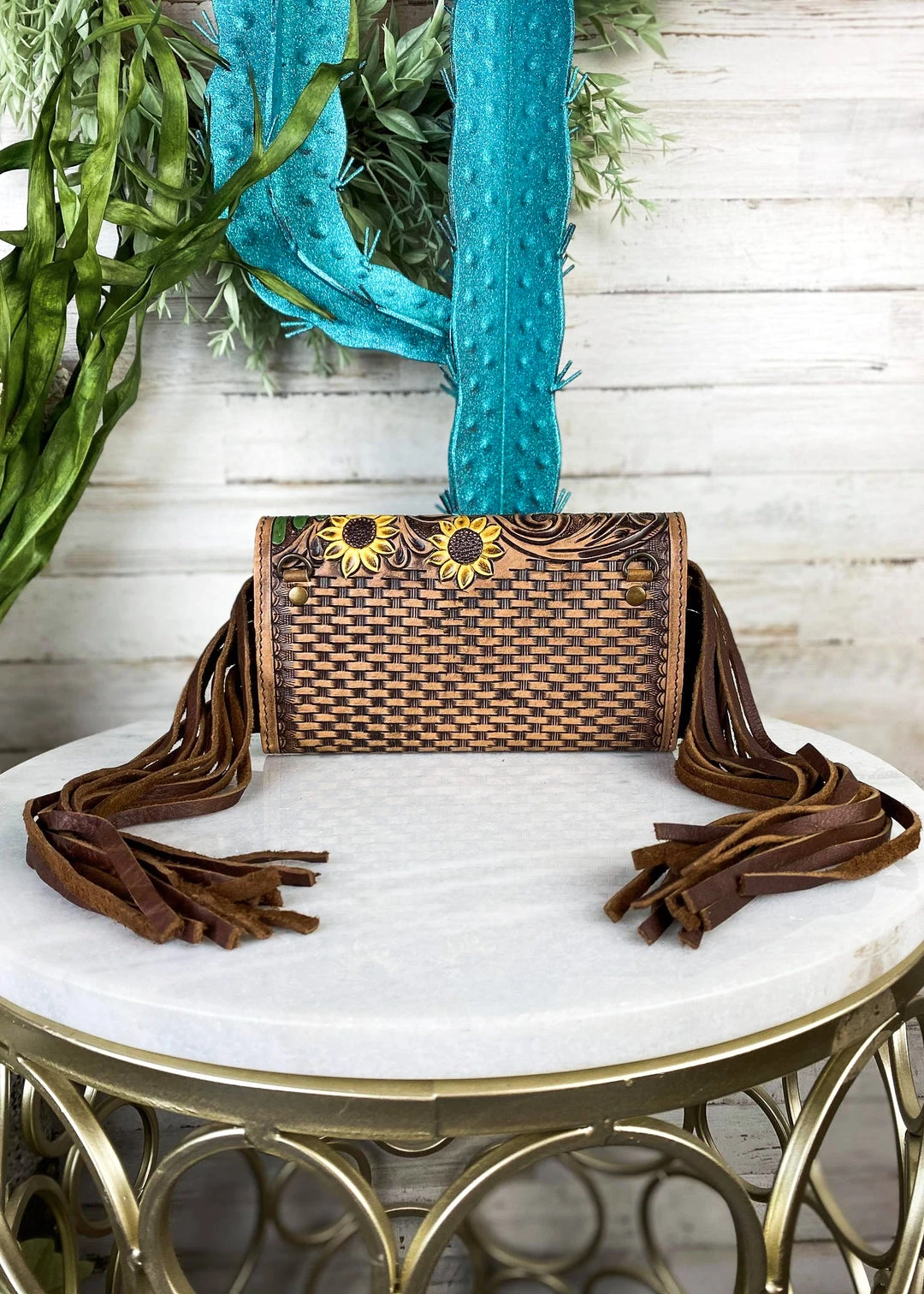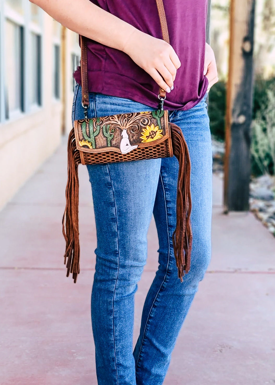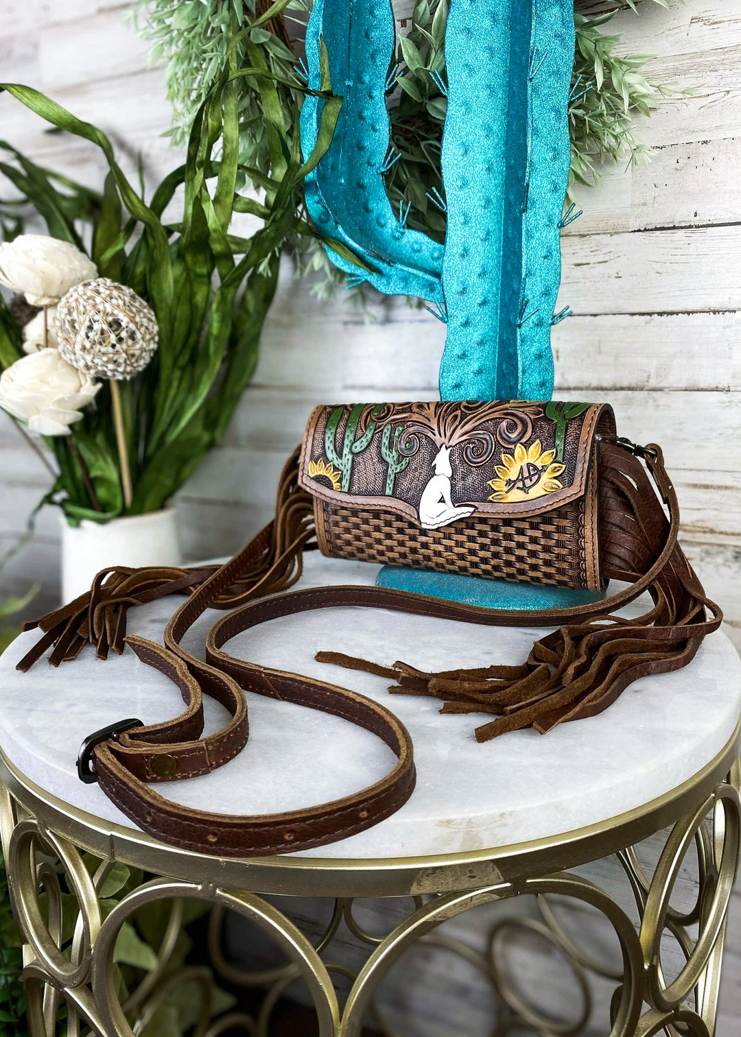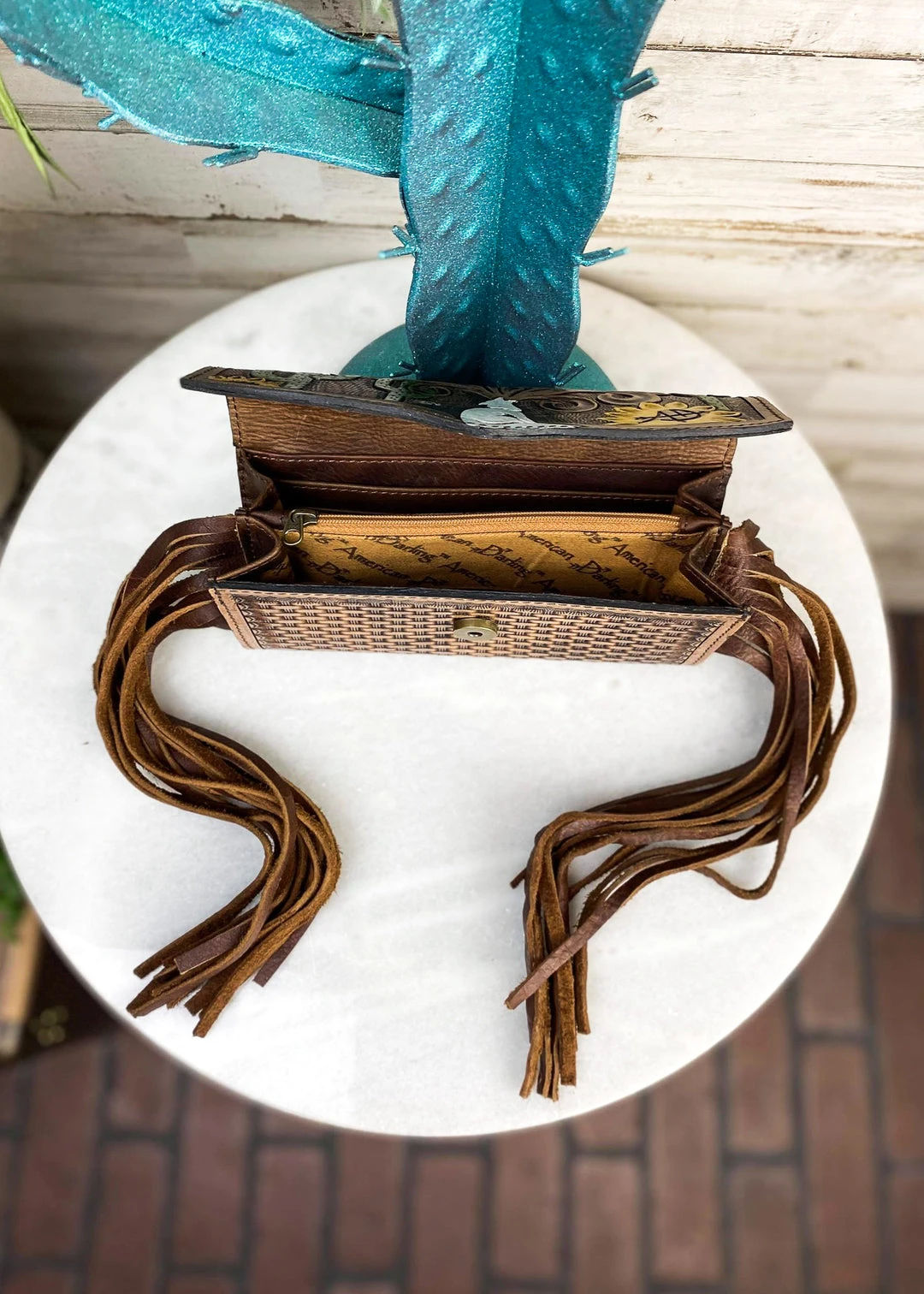 - Crafted with exquisite Southwestern tooled leather, this American Darling handbag features a stylish brown finish and chic fringe details.