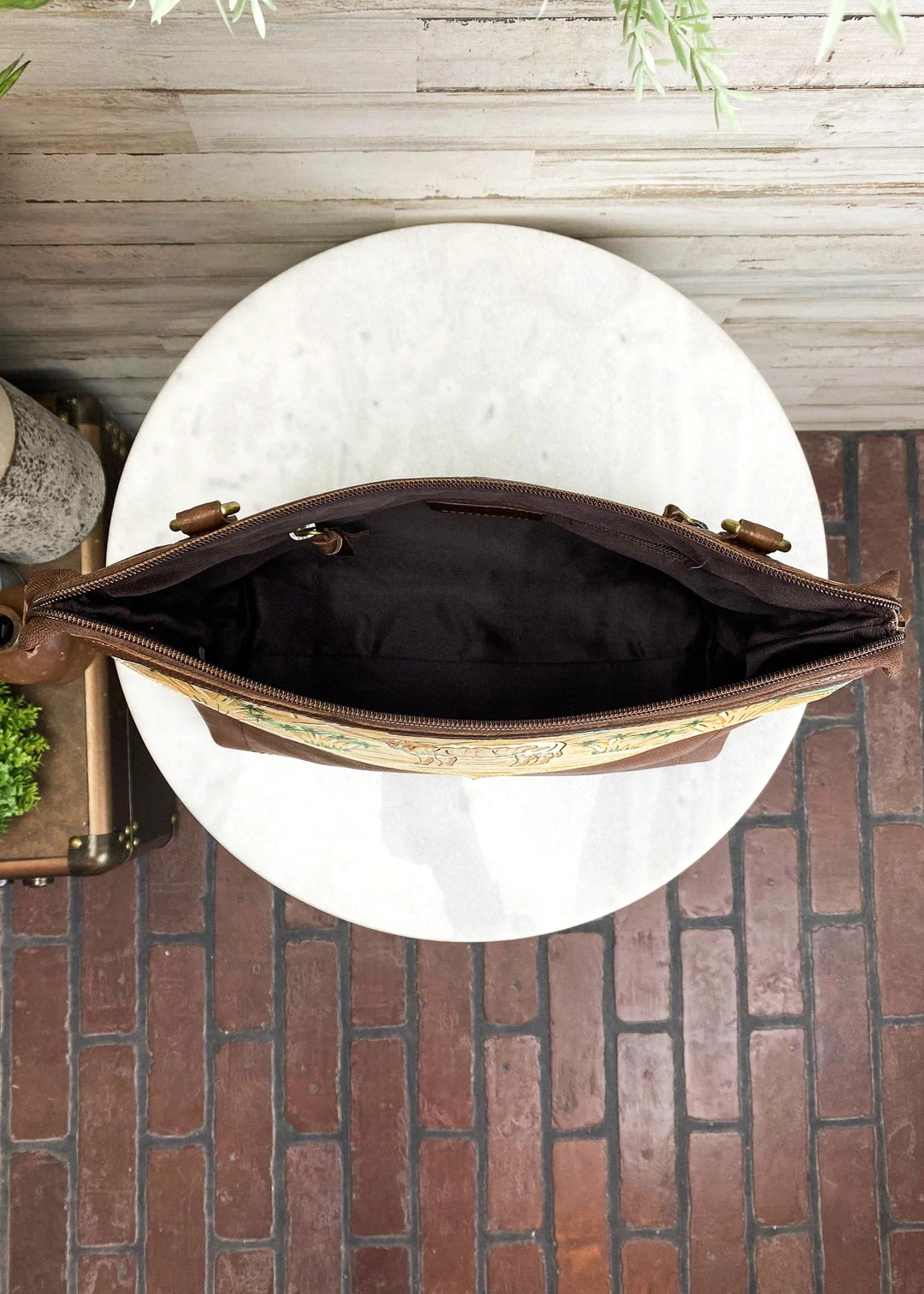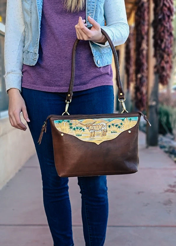 - Made from 100% genuine brown leather, this handbag combines durability with a classic western design.