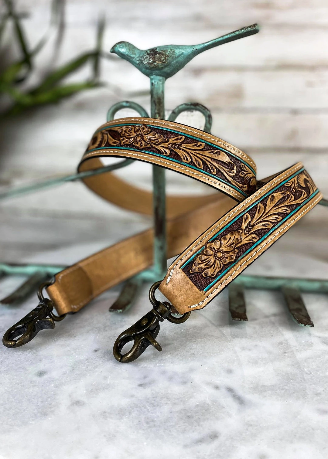 - The American Darling Brown & Teal Floral Garland Purse Strap is a stylish and functional accessory designed to elevate your handbag game. Featuring a beautiful floral garland pattern in brown and teal, this strap adds a touch of elegance to any outfit.