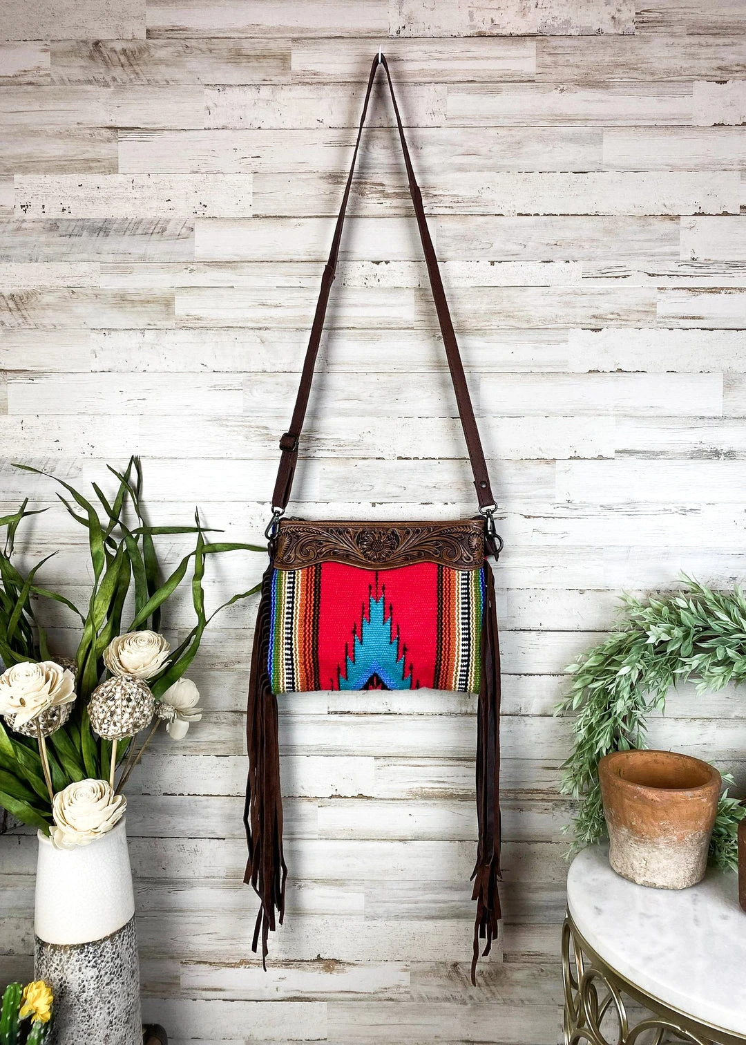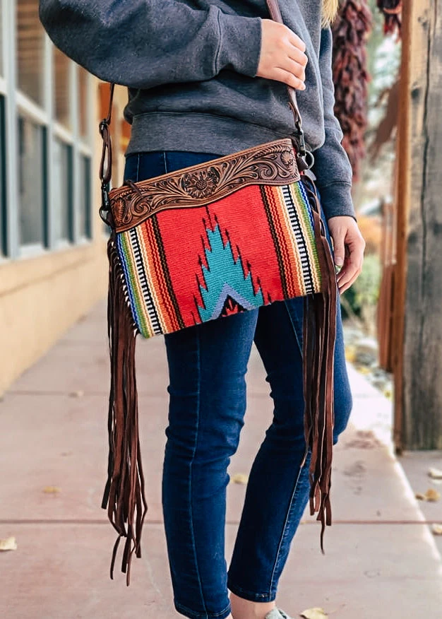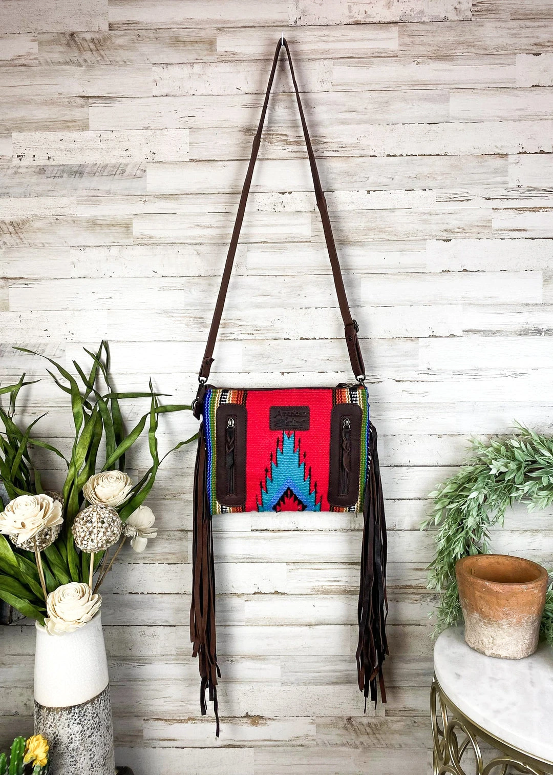 - The American Darling Concealed Carry Crossbody Handbag features a unique saddle blanket design with fringe detailing, offering a stylish yet functional accessory for women.