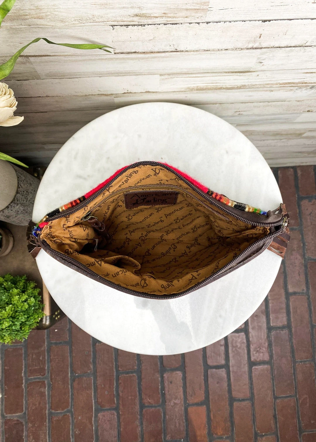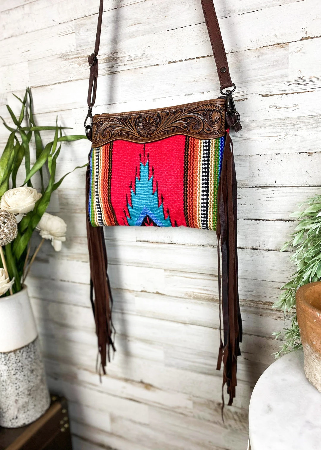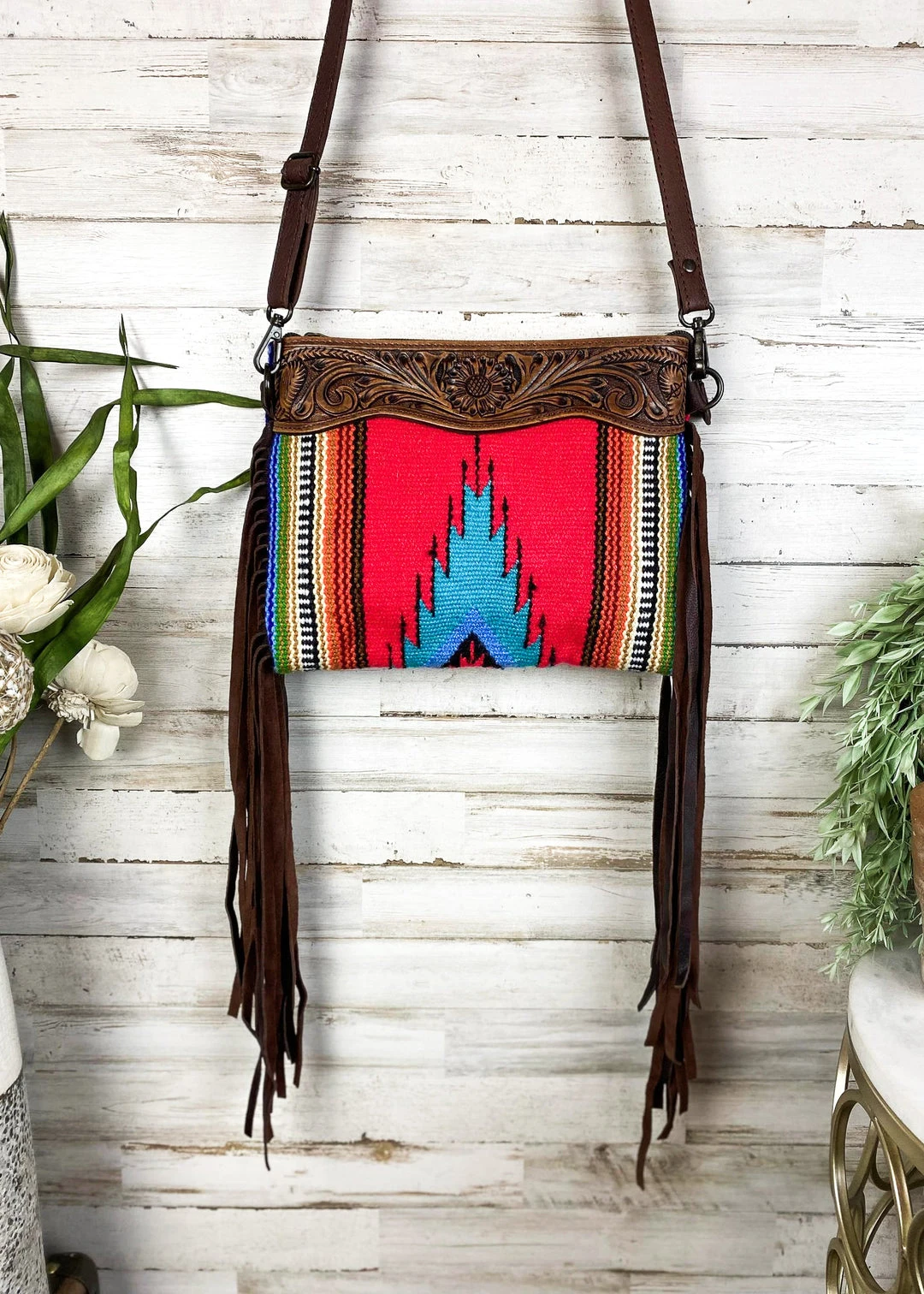 - The American Darling Concealed Carry Crossbody Handbag features a unique saddle blanket design with fringe detailing, offering a stylish yet functional accessory for women.