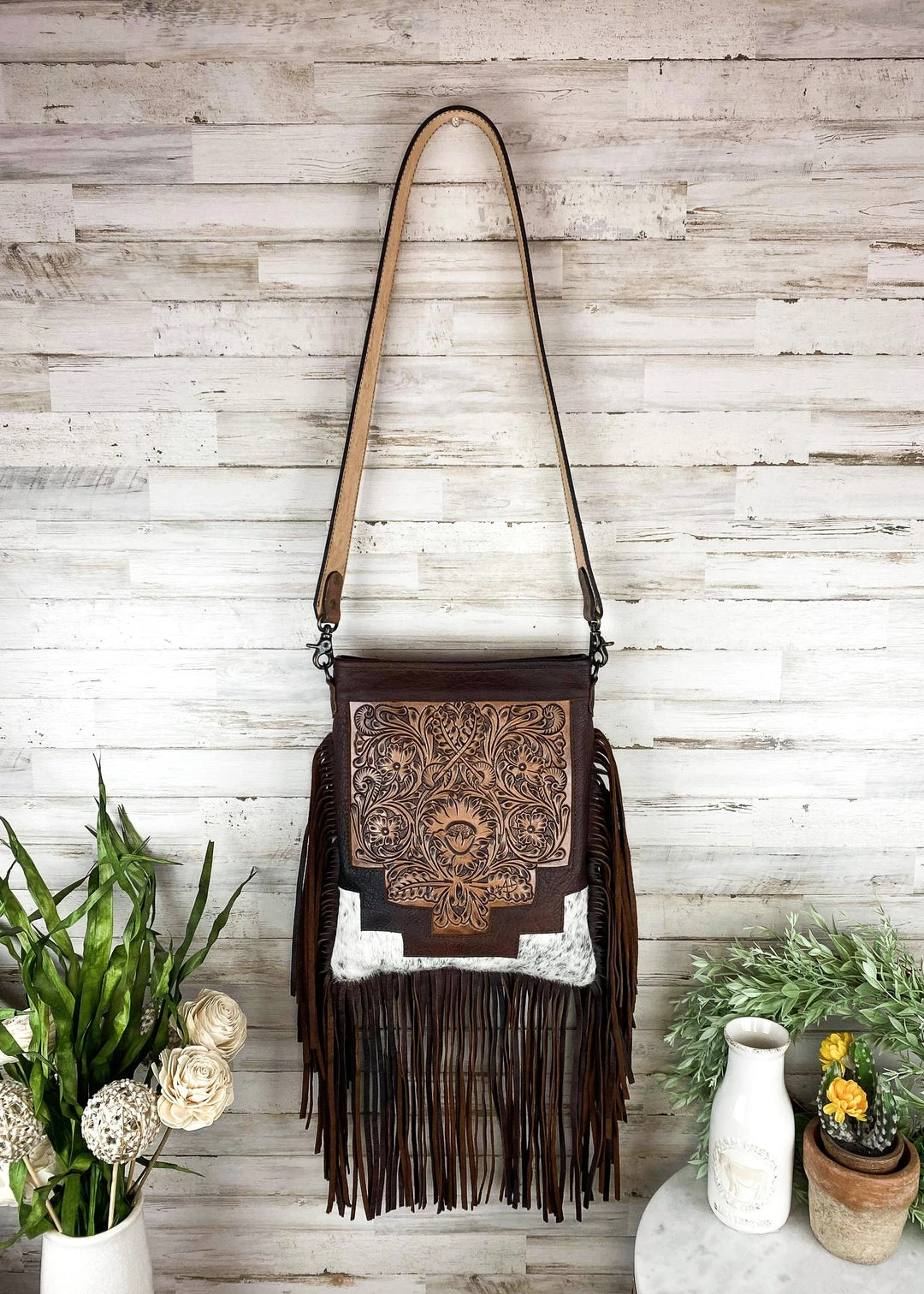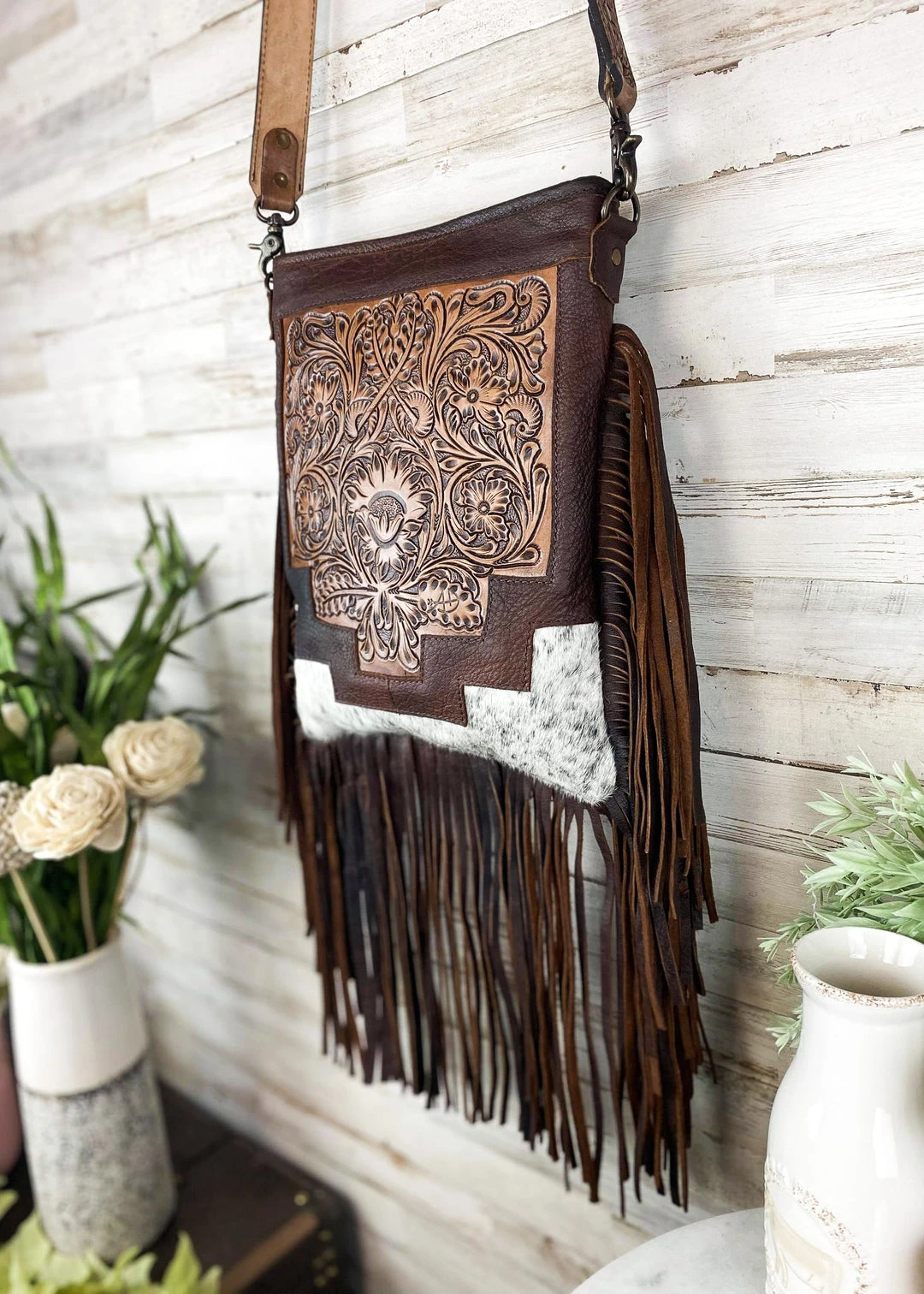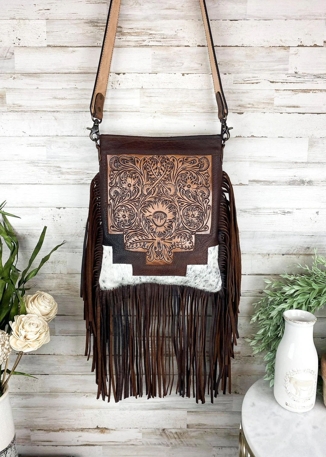 - Crafted from premium cowhide leather, this handbag features intricate floral tooling and fringe detailing, adding a touch of bohemian charm to your outfit.
