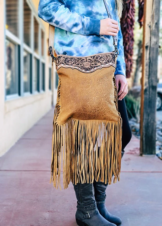 - Featuring a chic fringe design and a rich brown color, this handbag adds a touch of elegance to any outfit while providing ample space for your essentials.