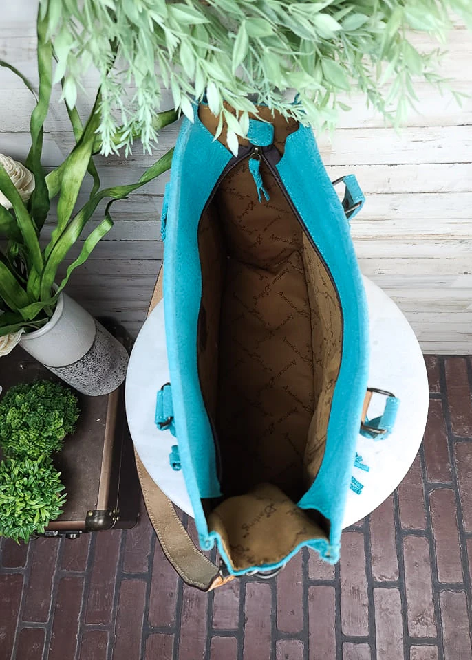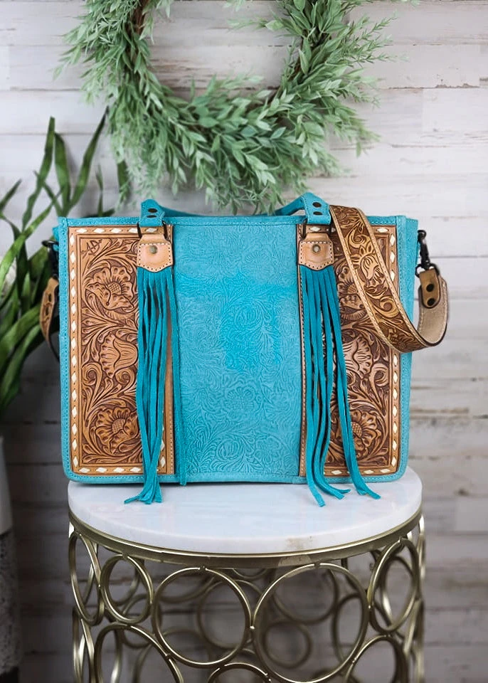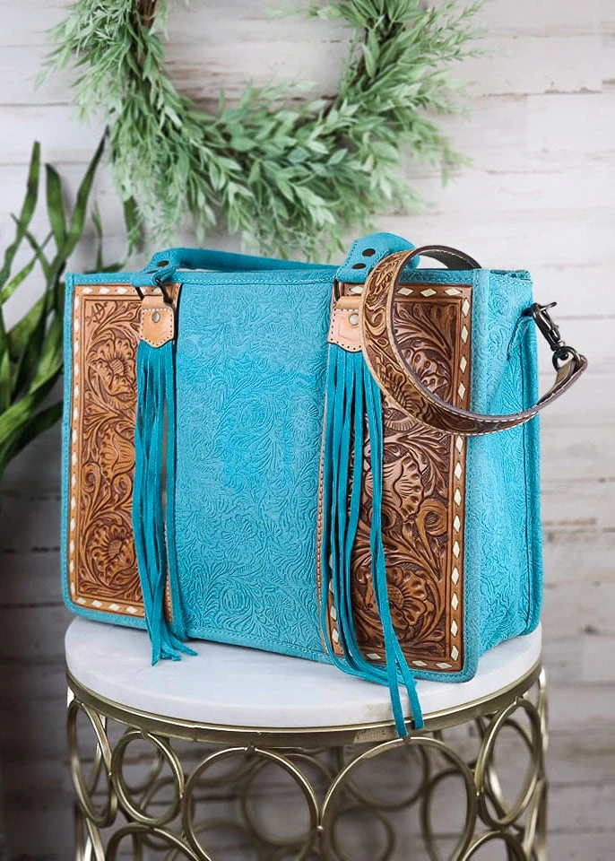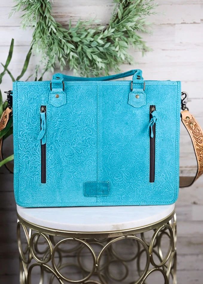 - The American Darling Concealed Carry Turquoise Tooled Tote Handbag combines style and functionality. This handbag features a unique turquoise tooled design, making it a standout accessory for any outfit.