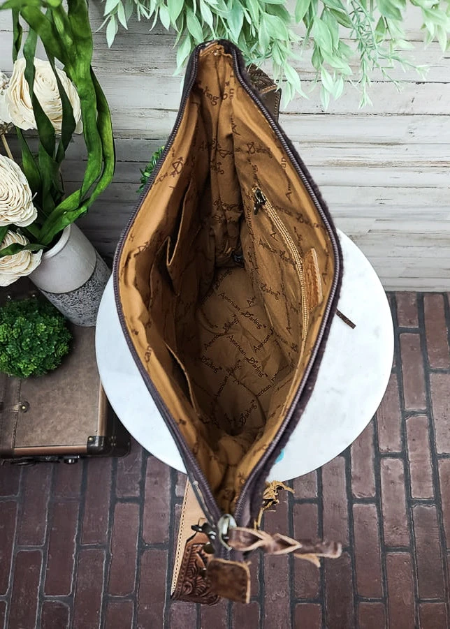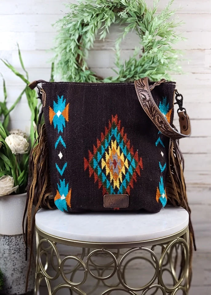 - The American Darling Dixie Dolly Aztec Crossbody Fringe Handbag features a unique Aztec design with fringe detailing, perfect for adding a boho touch to any outfit.
