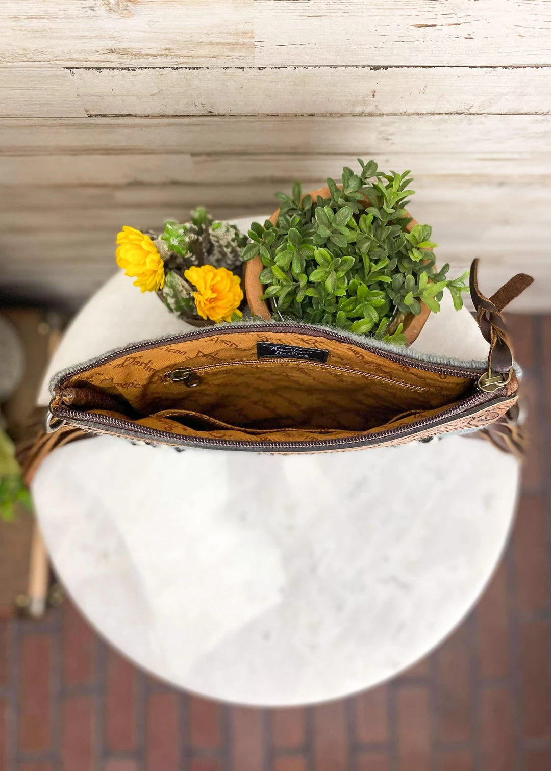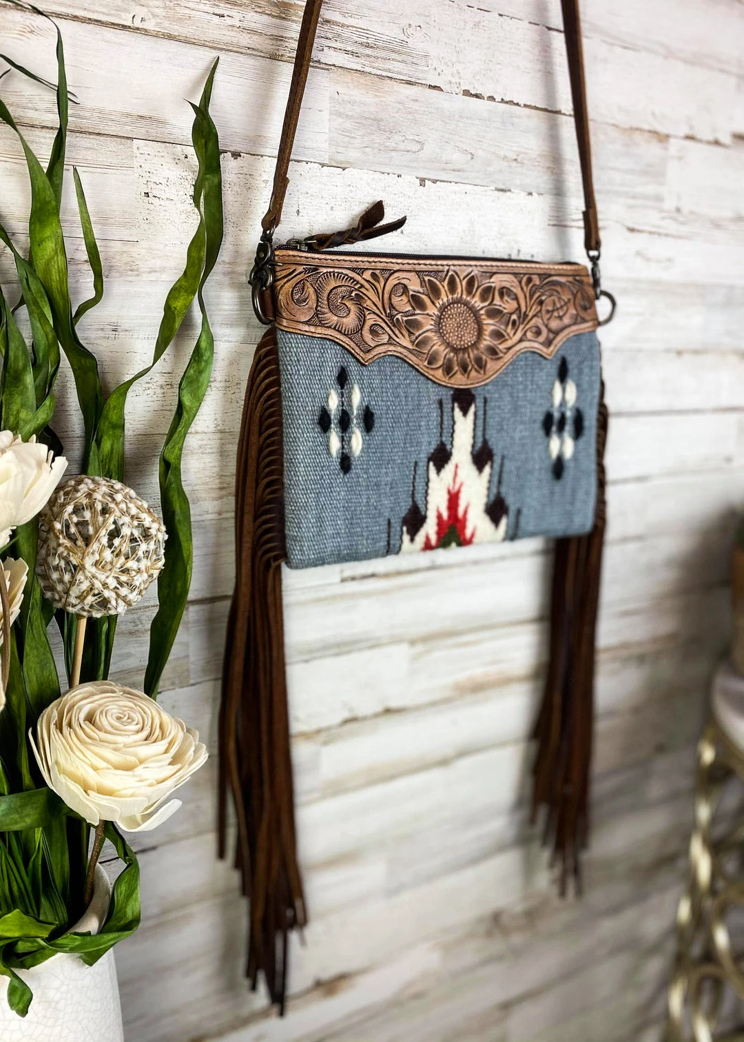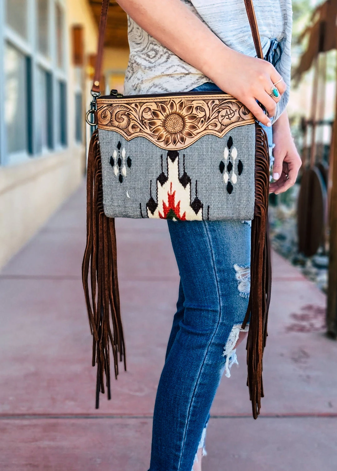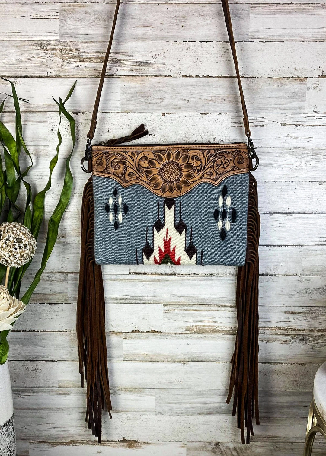 - Elevate your style with the American Darling Grey Aztec Saddle Blanket & Floral Tooled Leather Crossbody Bag. Featuring a unique Aztec pattern and intricate floral tooling, this bag is both fashionable and functional.