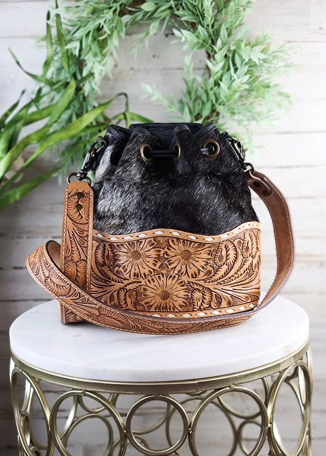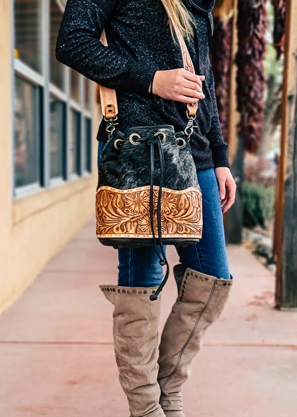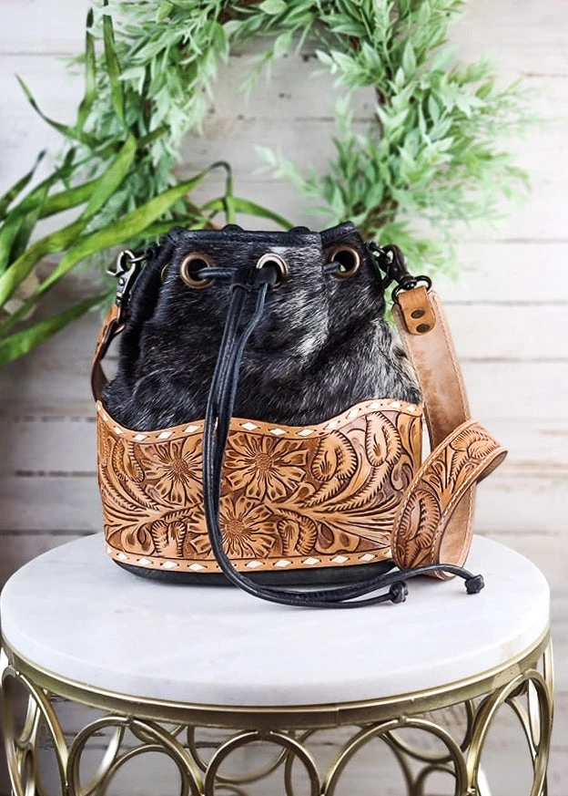 - Elevate your style with the American Darling Salt N Pepper Tooled Bucket Crossbody Handbag. Its unique tooled design and salt n pepper color make it a standout accessory.