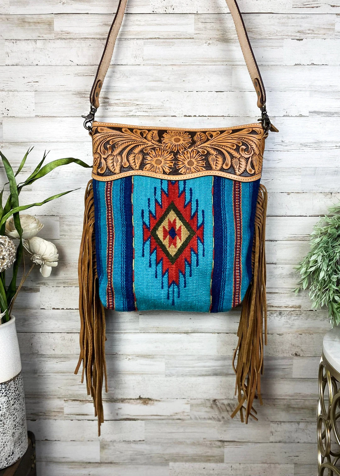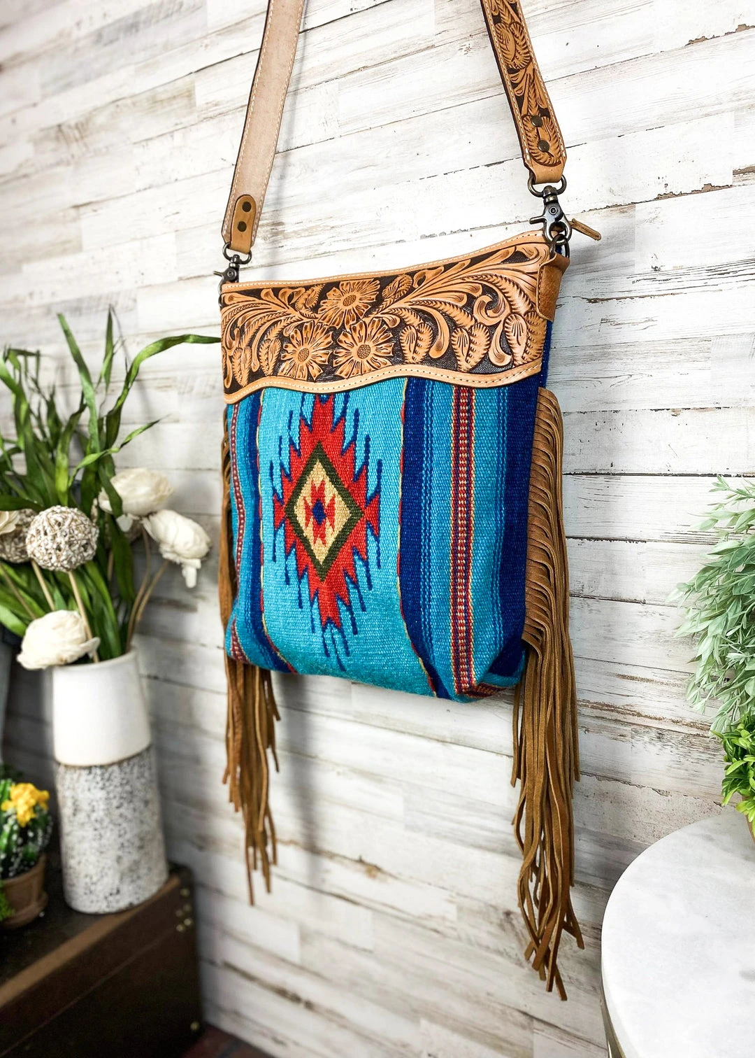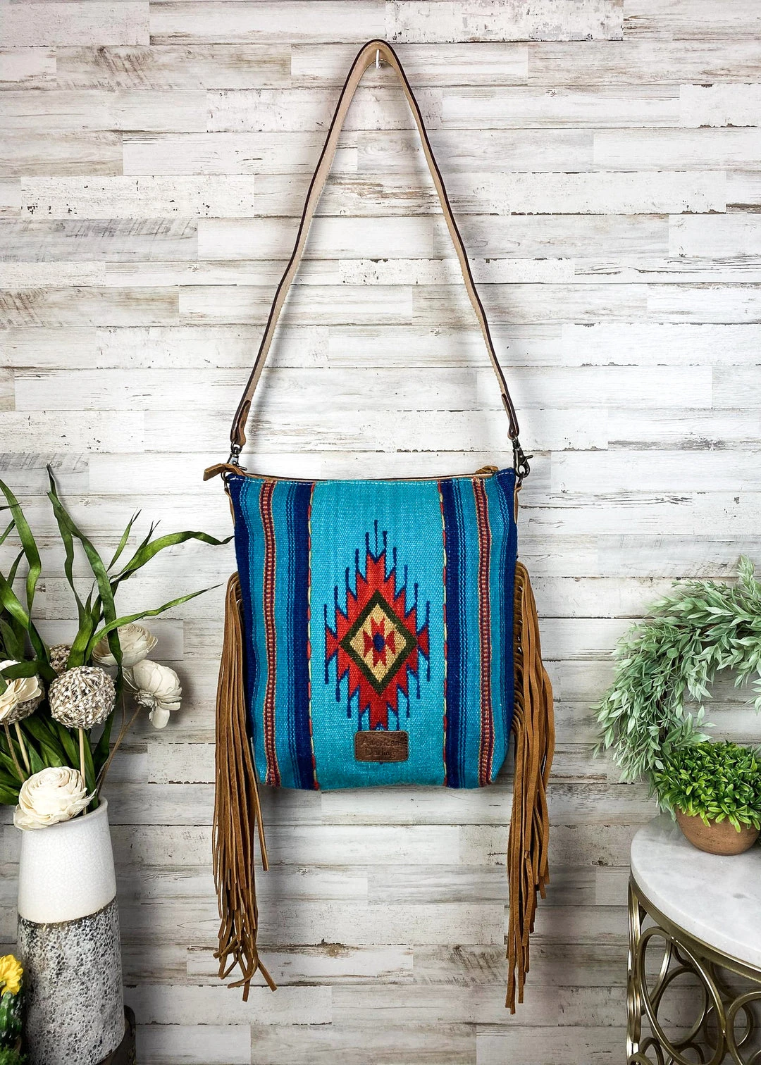 - Elevate your style with the American Darling Santa Fe Blue Saddle Blanket Fringe Crossbody Handbag. This unique handbag features a vibrant blue saddle blanket design with fringe detailing, making it a standout accessory for any outfit.