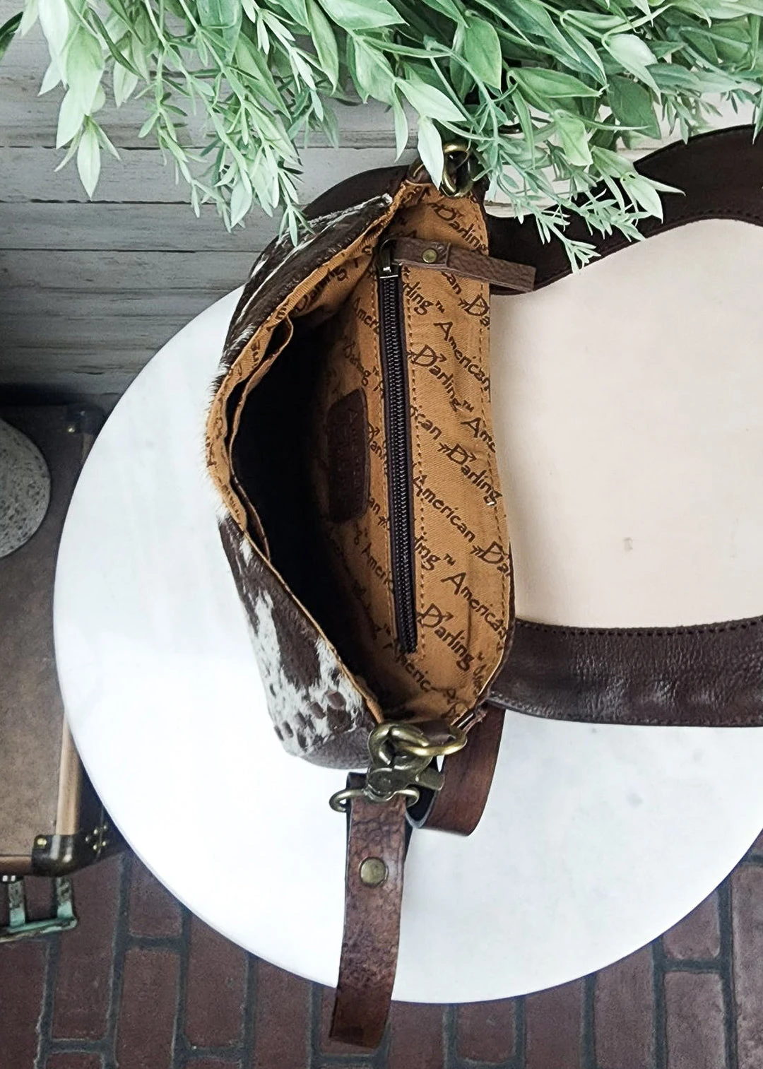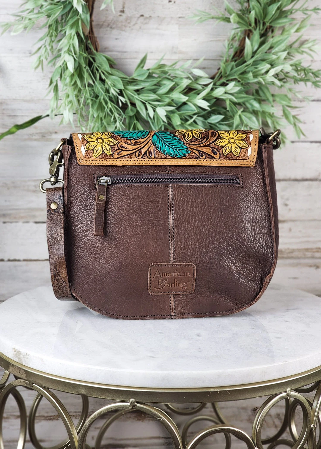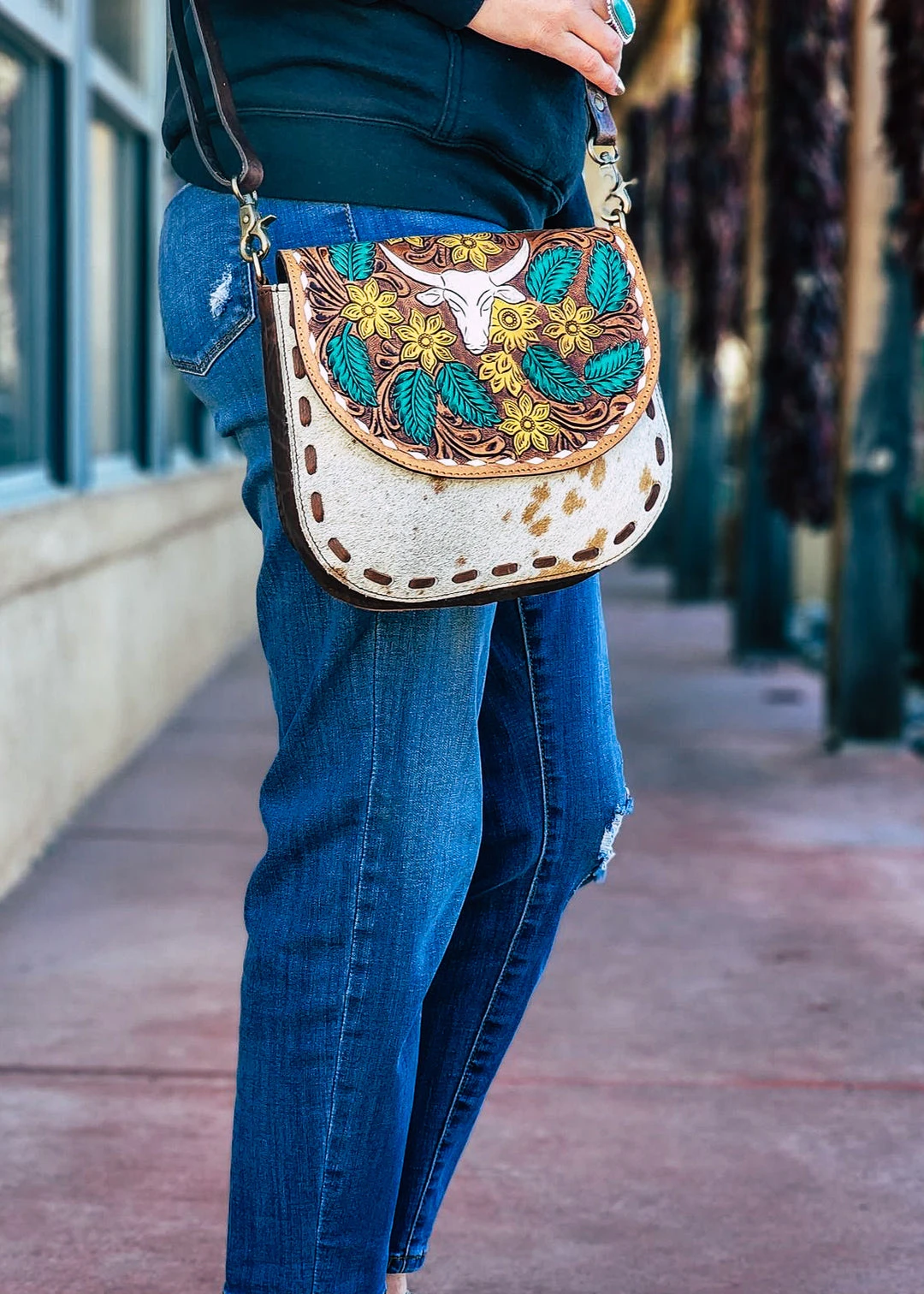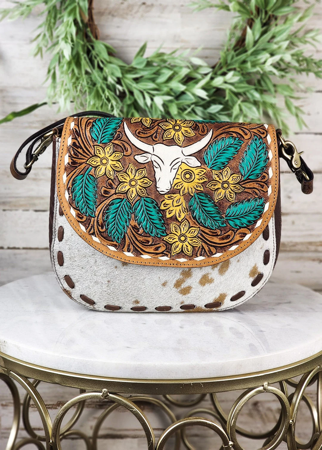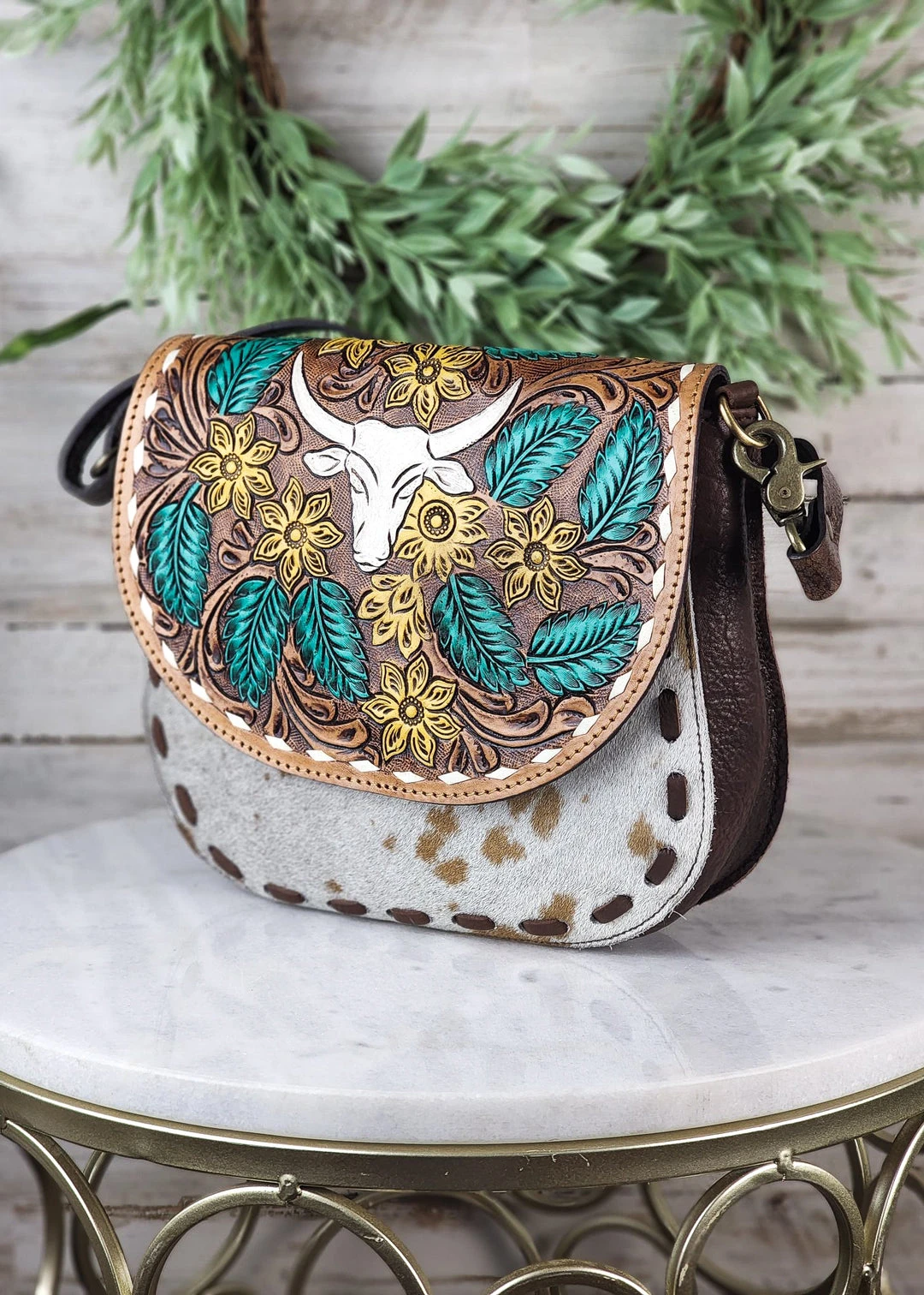 - Elevate your style with the American Darling Steer Skull & Floral Cowhide Crossbody Handbag. This unique handbag combines bold western vibes with elegant floral accents, making it a statement piece for any outfit.