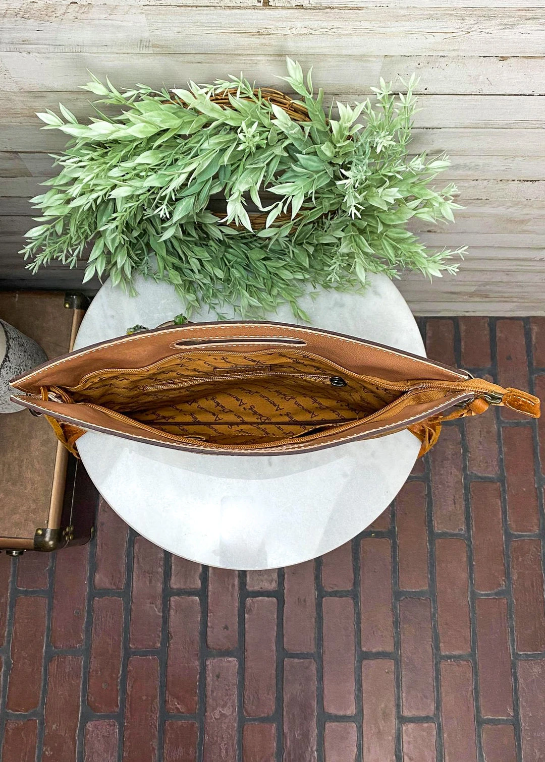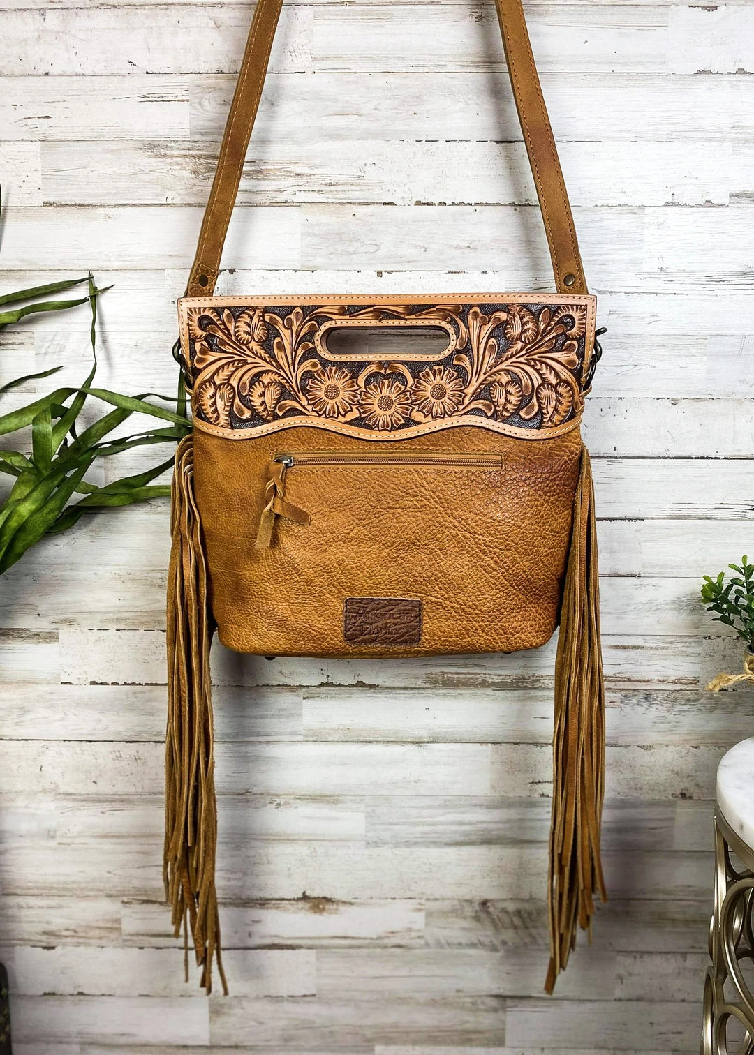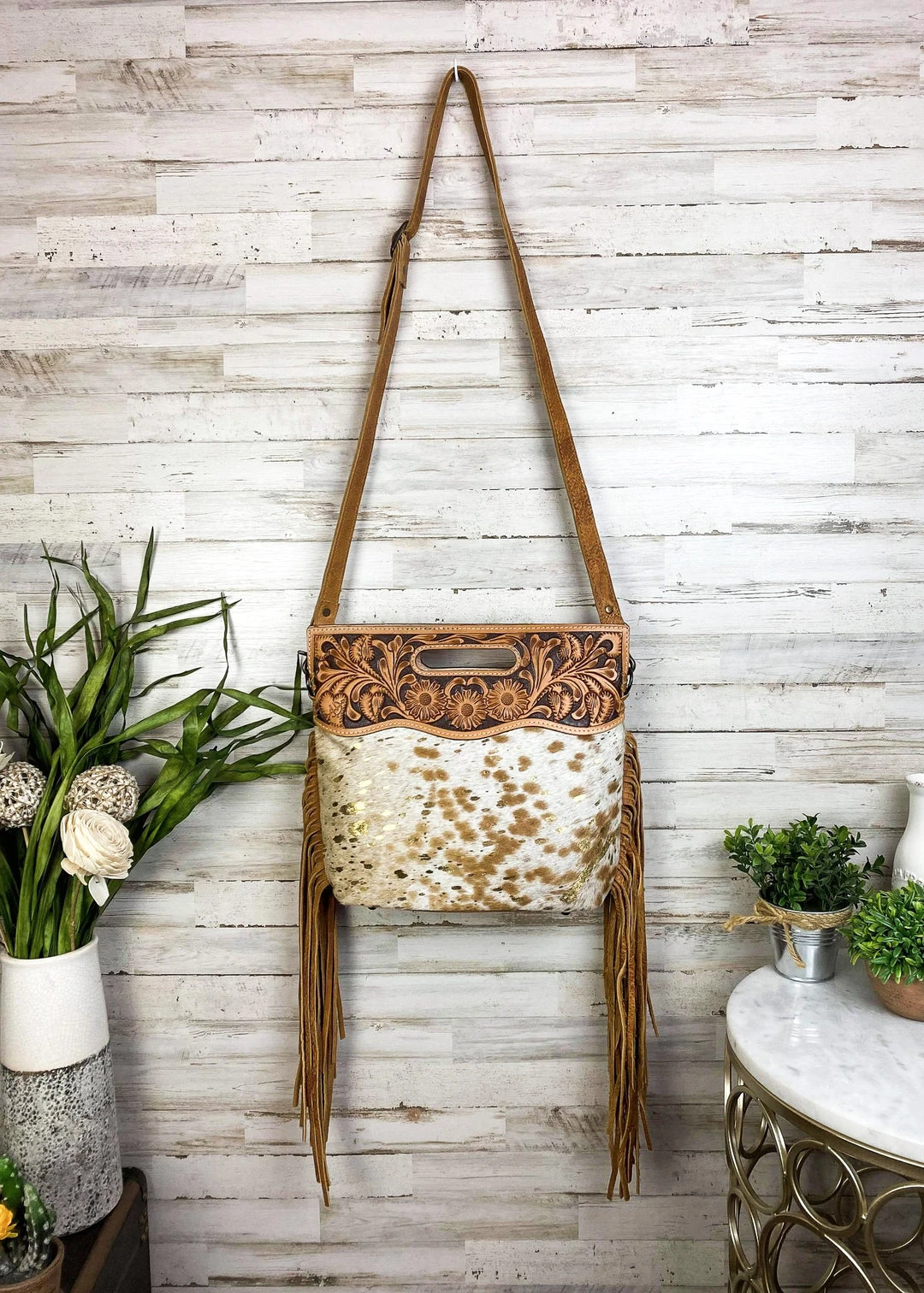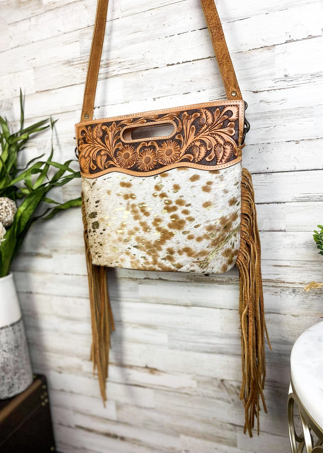 - Elevate your style with the American Darling Sunflower Tooled & Metallic Cowhide Crossbody Handbag. Featuring a unique sunflower design and metallic accents, this handbag is both stylish and functional.