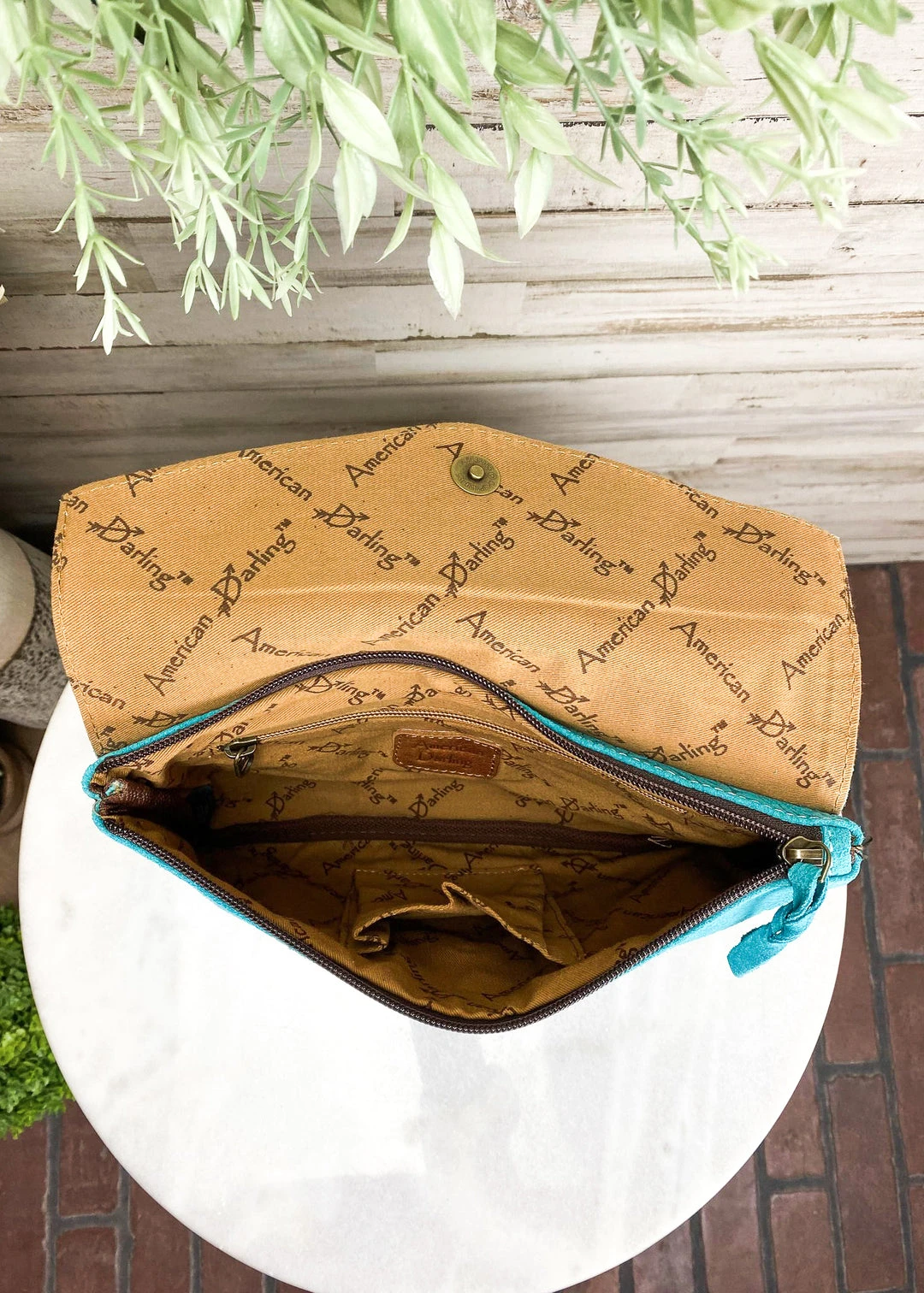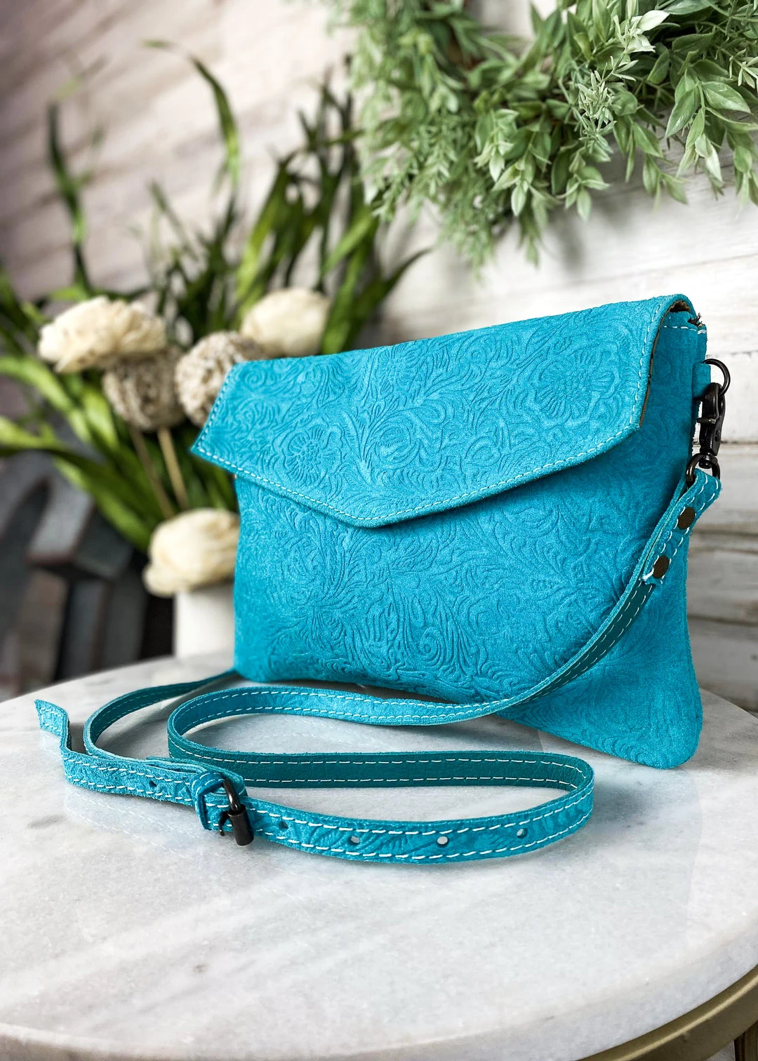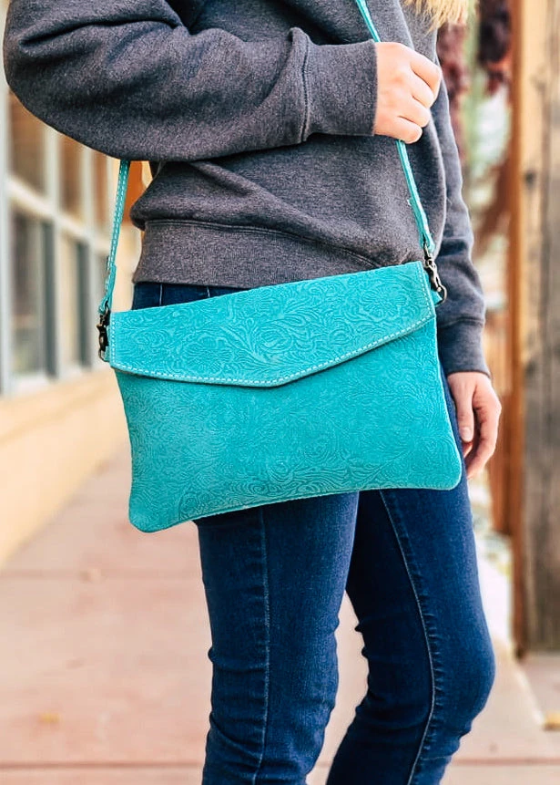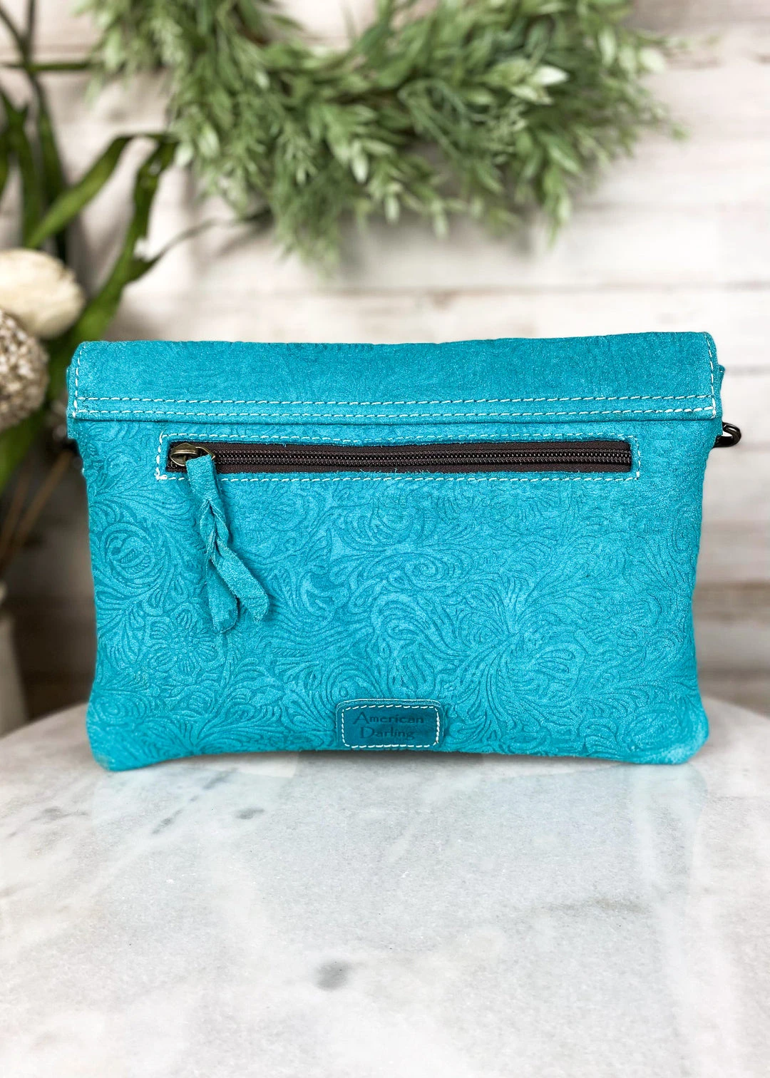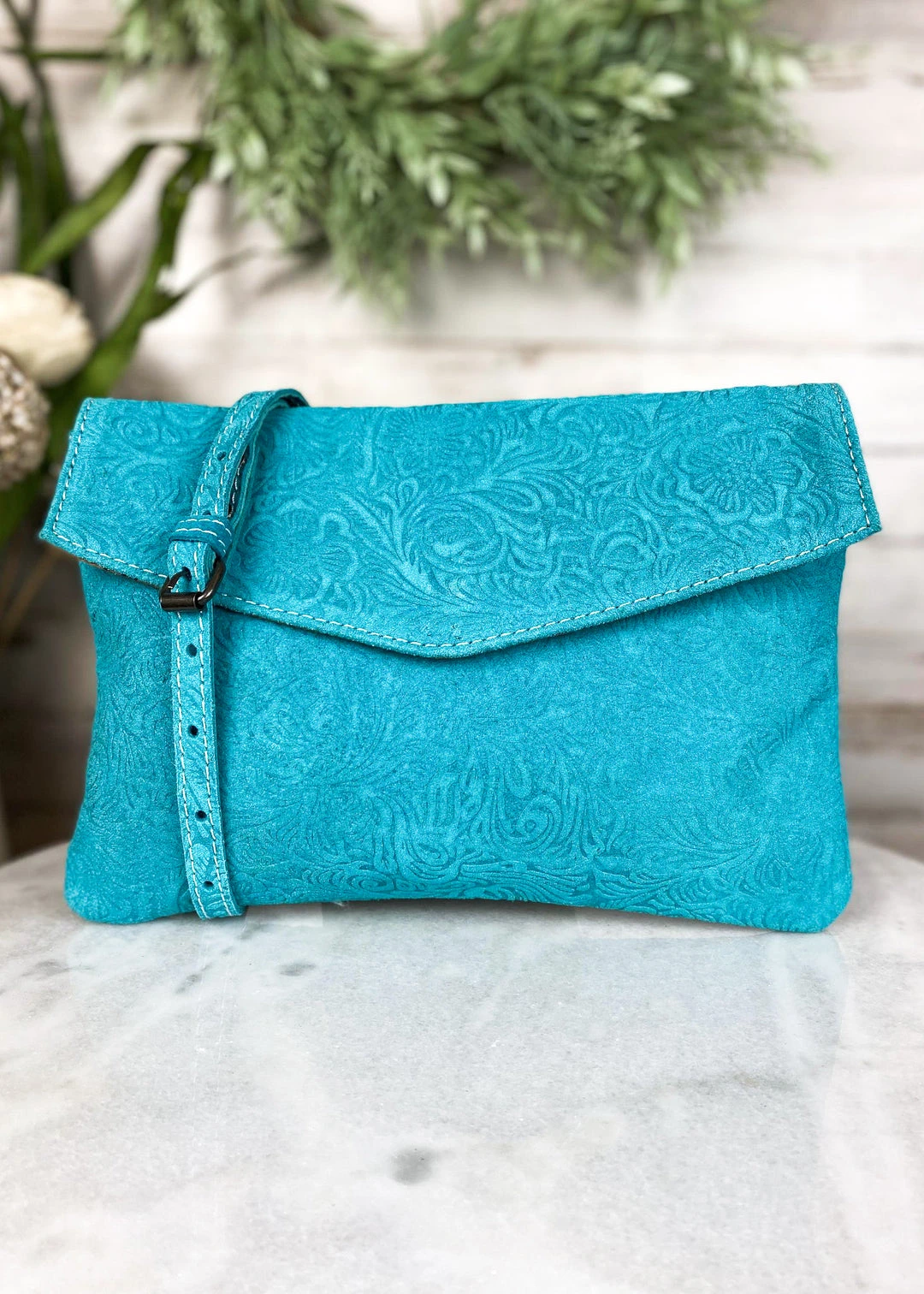 - The American Darling Teal Embossed Envelope Handbag combines style and sophistication with its unique embossed design and vibrant teal color.