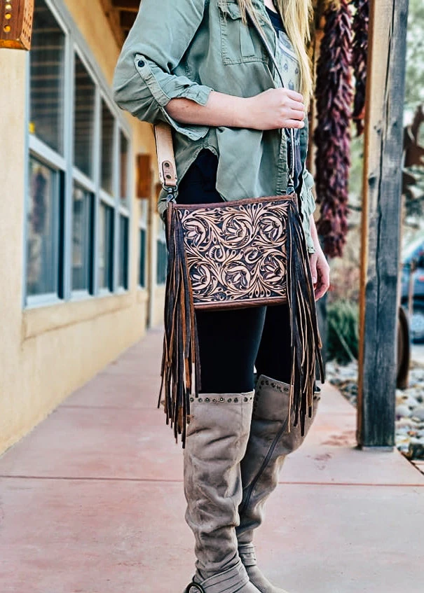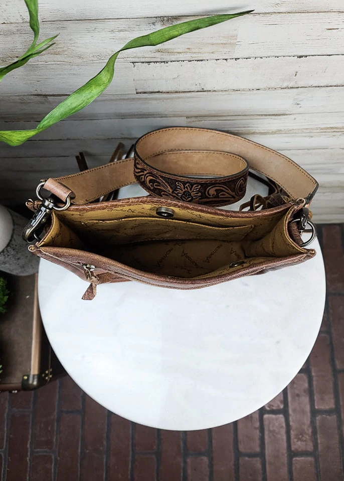 - The American Darling Temple Tooled Small Crossbody Handbag combines timeless design with modern functionality. Its compact size makes it perfect for everyday use, while the tooled detailing adds a unique touch of elegance.