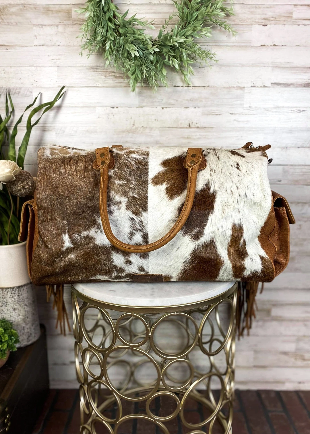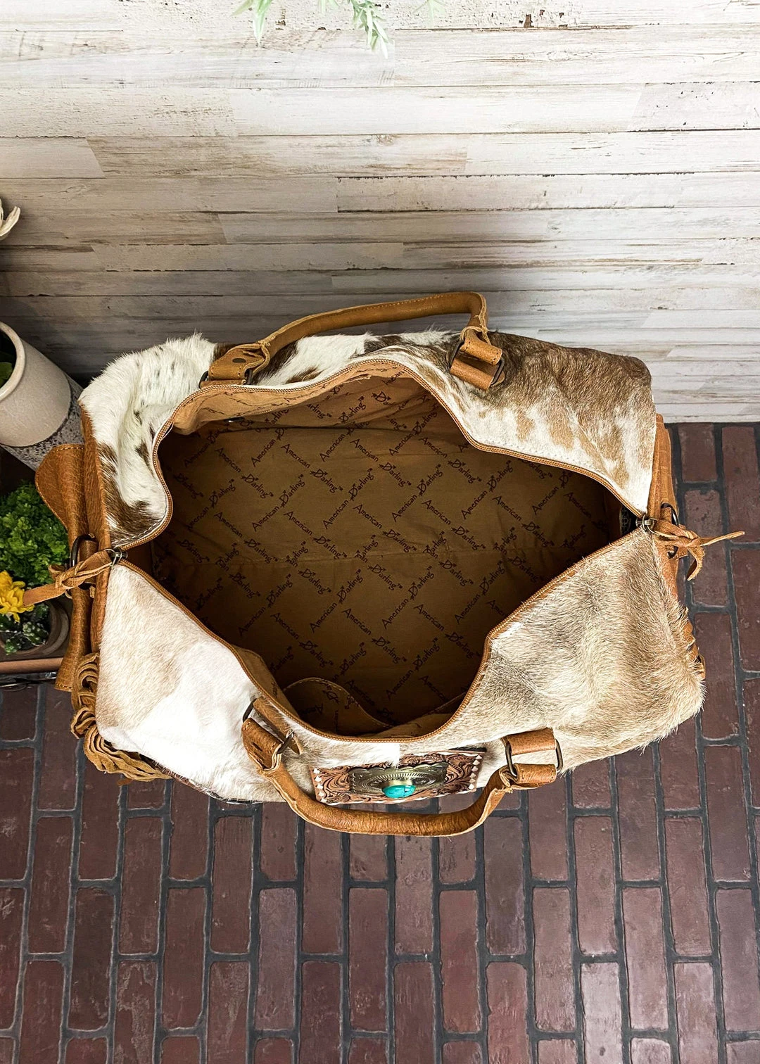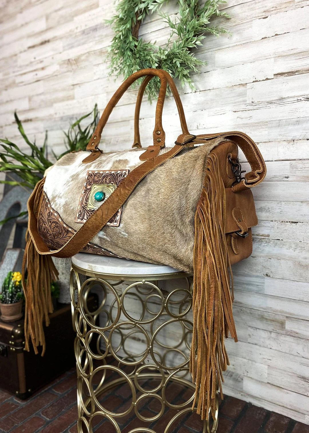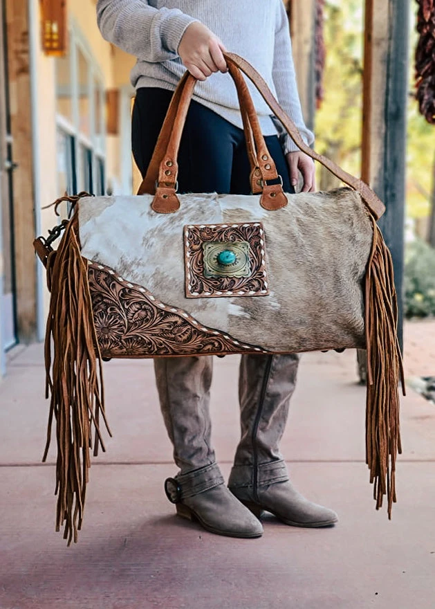- Crafted from high-quality cowhide leather, the American Darling Tooled Cowhide Concho Weekender Bag offers unmatched durability and a timeless, stylish look.
