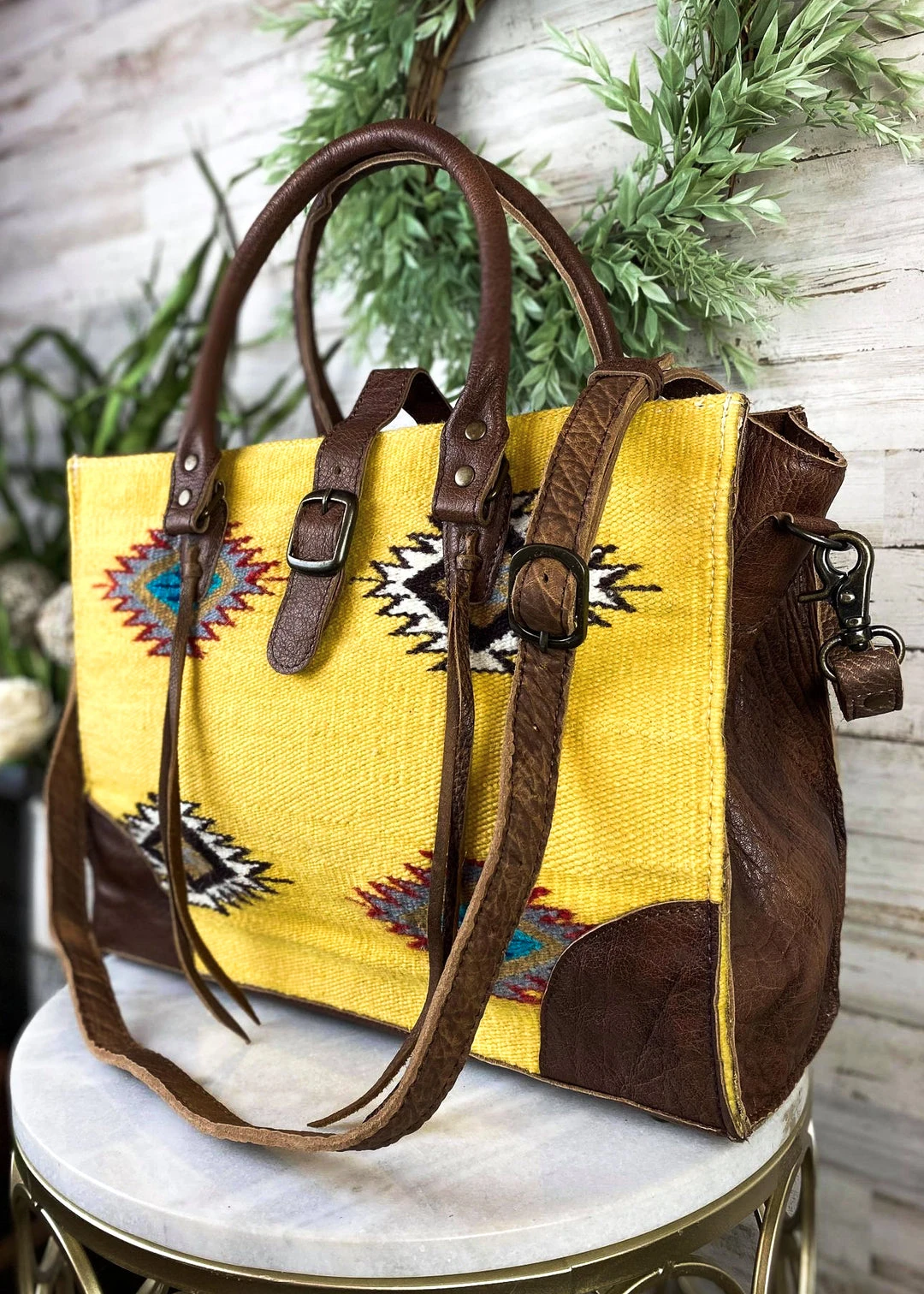 - Elevate your style with the American Darling Yellow Aztec Buckle Handbag. Featuring a vibrant yellow color and unique Aztec buckle design, this tote bag is both trendy and practical.