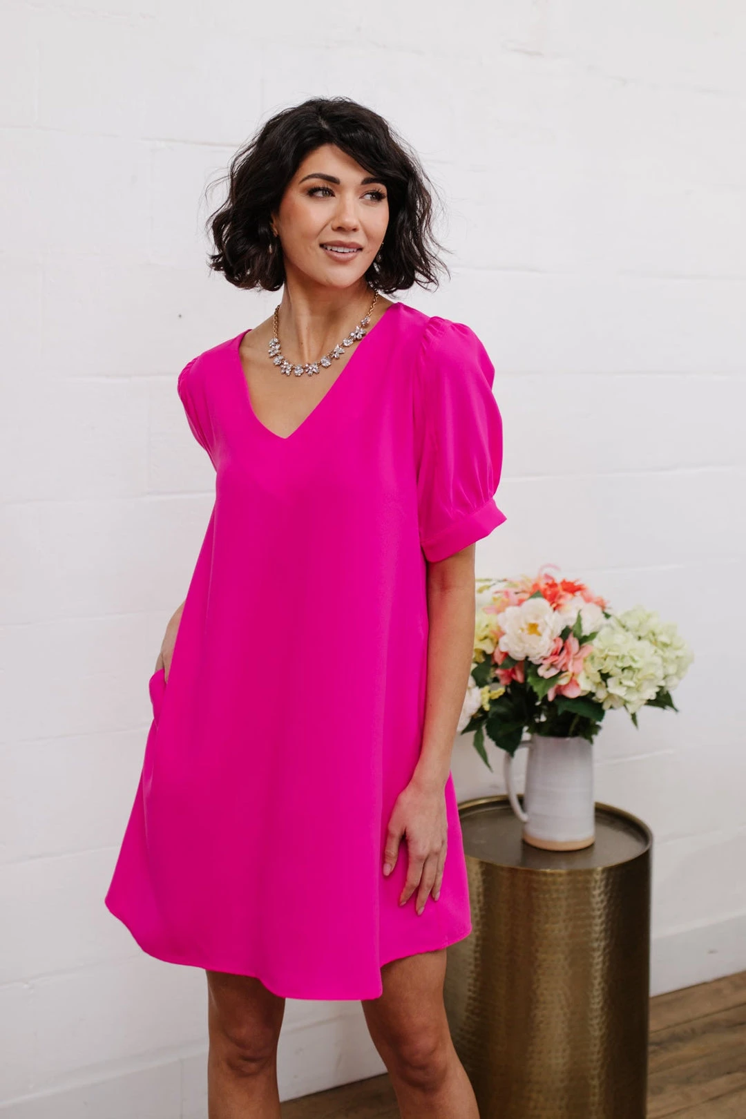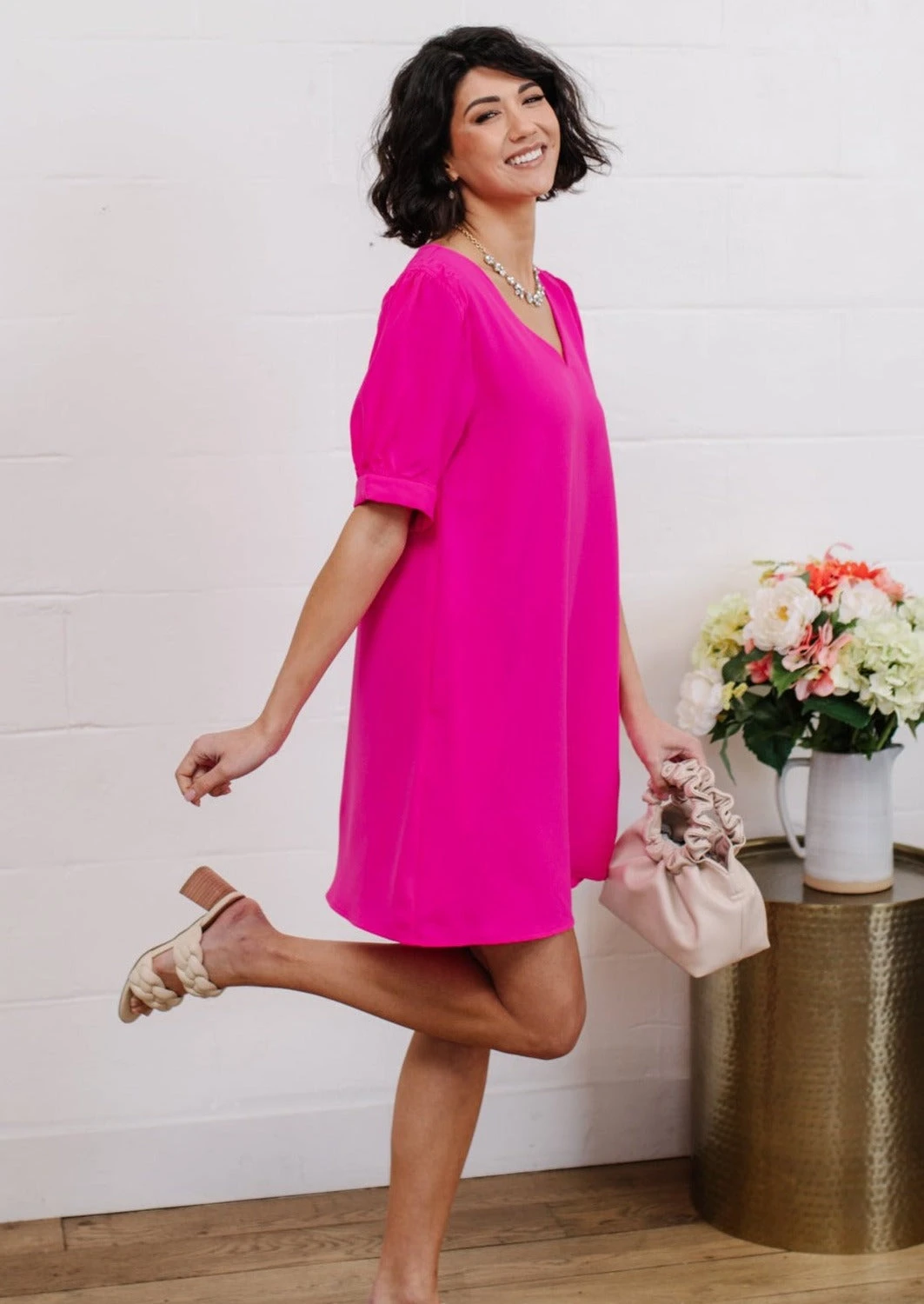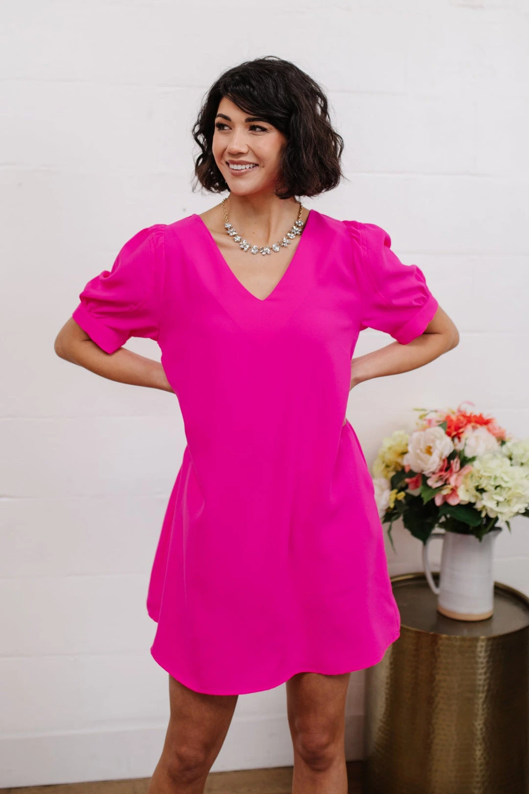 Look and feel adorable in the Adore Me Dress! The neon pink brings this beautiful design to life, featuring an A-line silhouette, V-neckline, and adorable puff sleeves. Stand out in this stunning dress paired with white heels, and a white bag for a complete look!