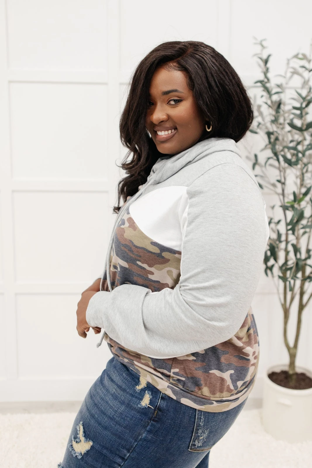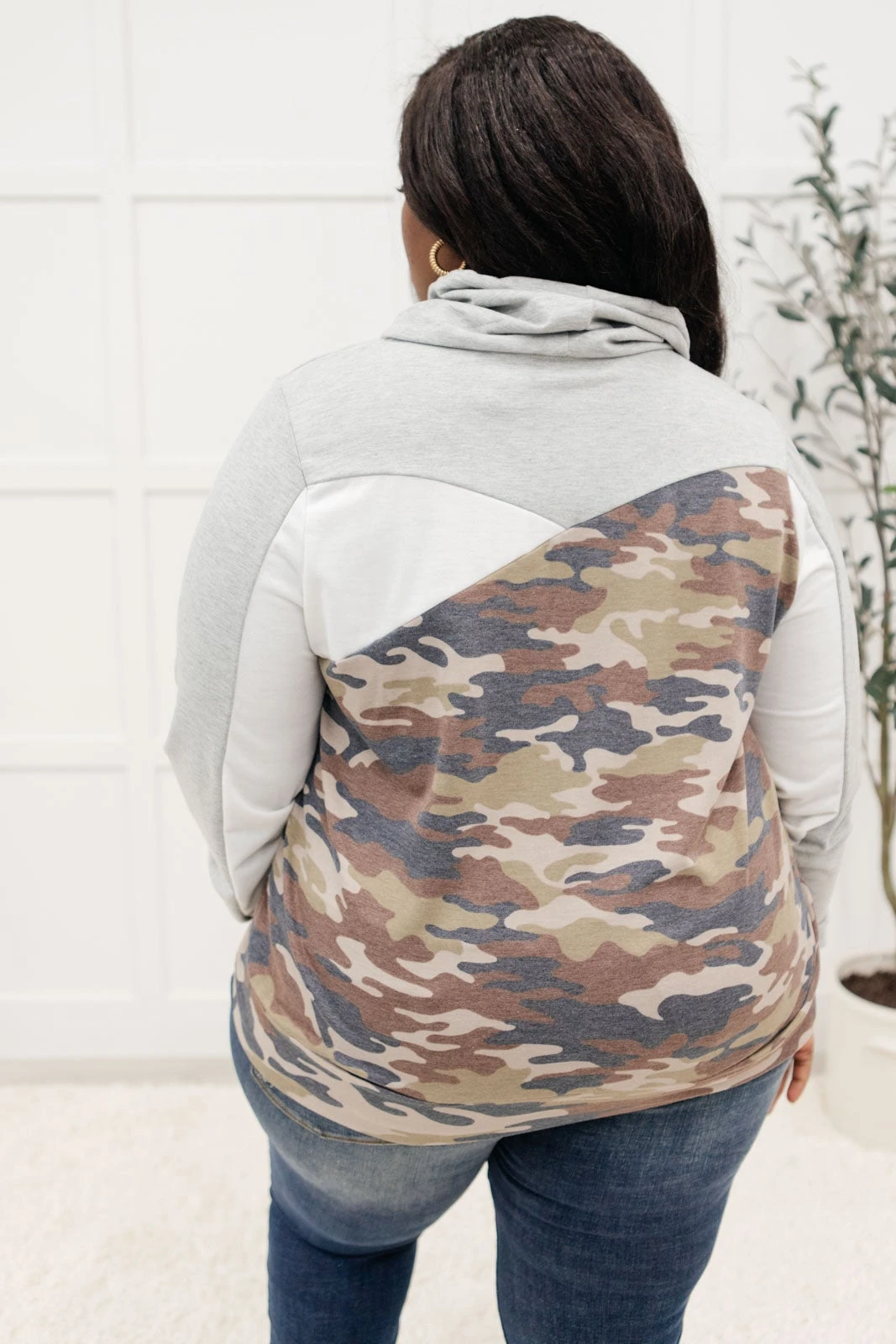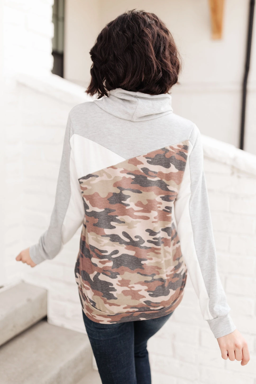 Keywords: Camo, Gray Top, Loungewear, Cowl Neck, Color Block