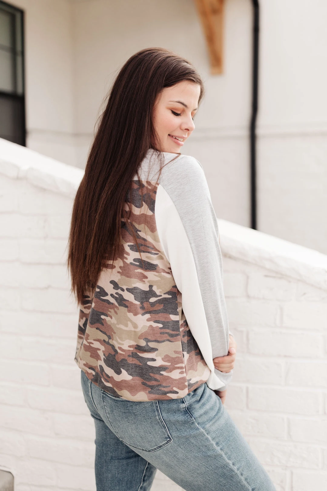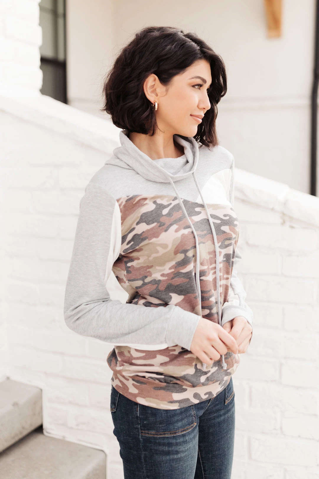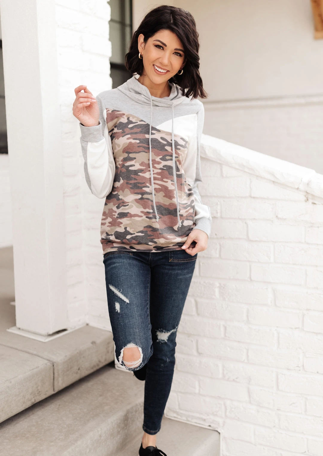Take this cute camo top on your next adventure! It features a functional drawstring color blocking detail, and long sleeves. This piece is great for lounging around the house, running errands, or grabbing a quick lunch with your bestie!