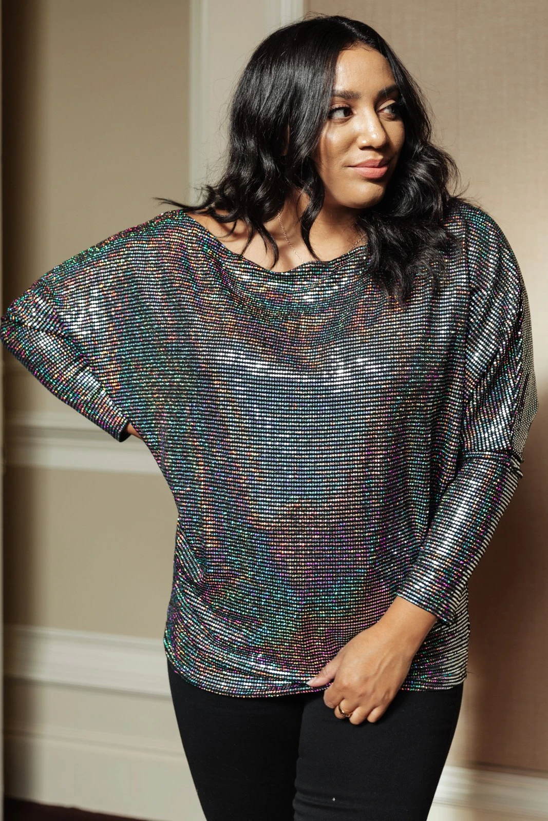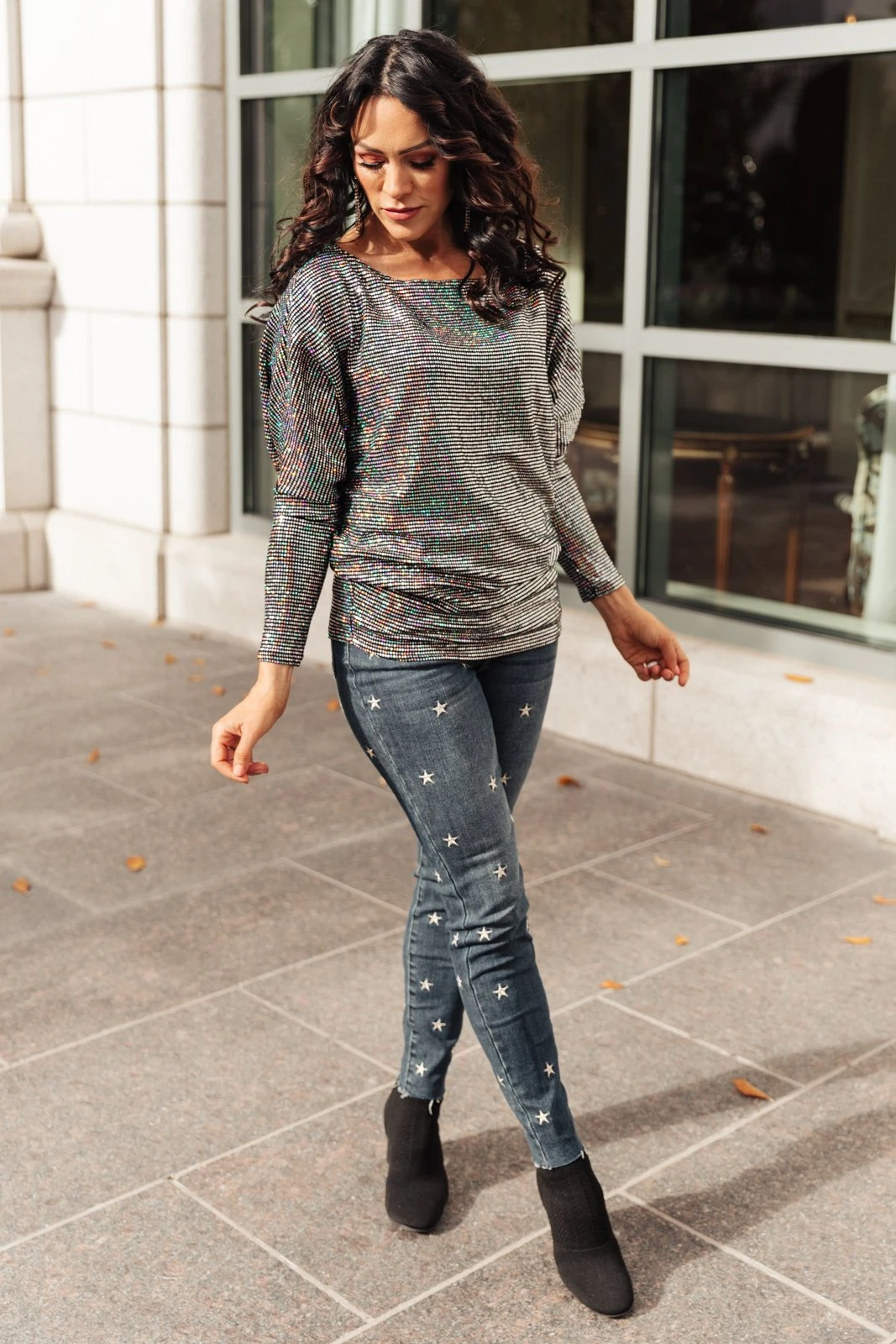 The All About The Bling Top is certainly worth all the attention you’ll be getting this holiday season! So effortless to Dress up your favorite pair of jeans or elevate an evening look! Featuring sequins that cover the entire top, dolman sleeves and a wide cut neckline. Pair it with your favorite pants and wear on or off the shoulders!