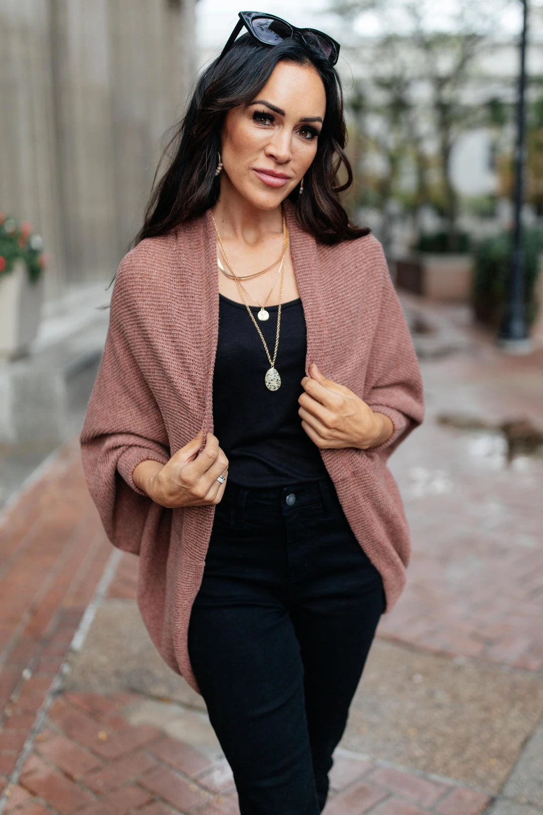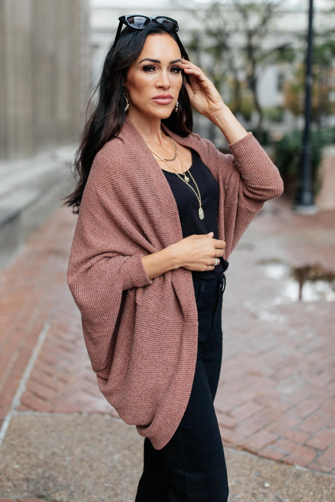 Keywords: Cardigan, Red Top, Mauve Top, Sweater, Fall