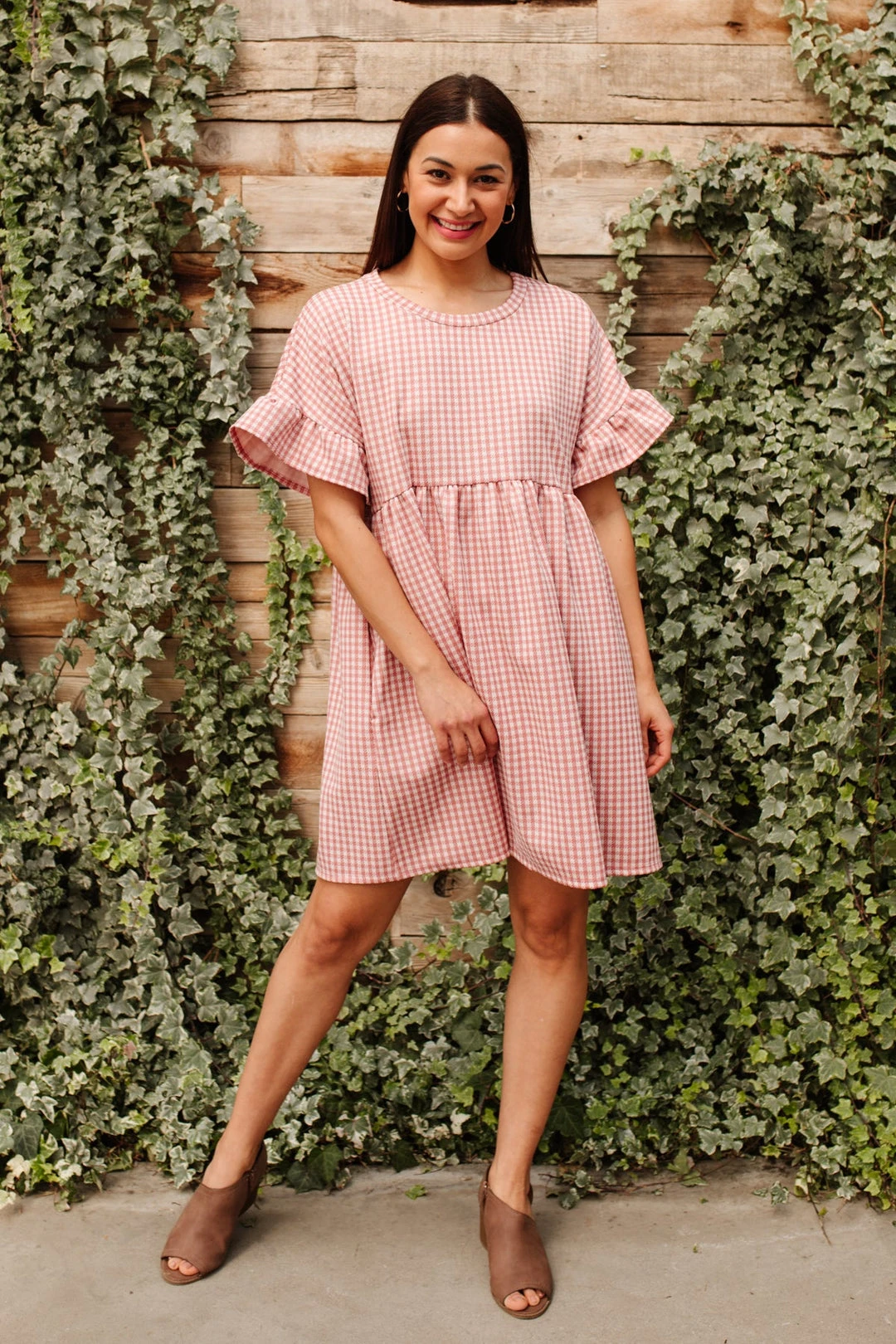 Keywords: Checkered pattern, Short sleeve dress, Pink Dress, Gingham