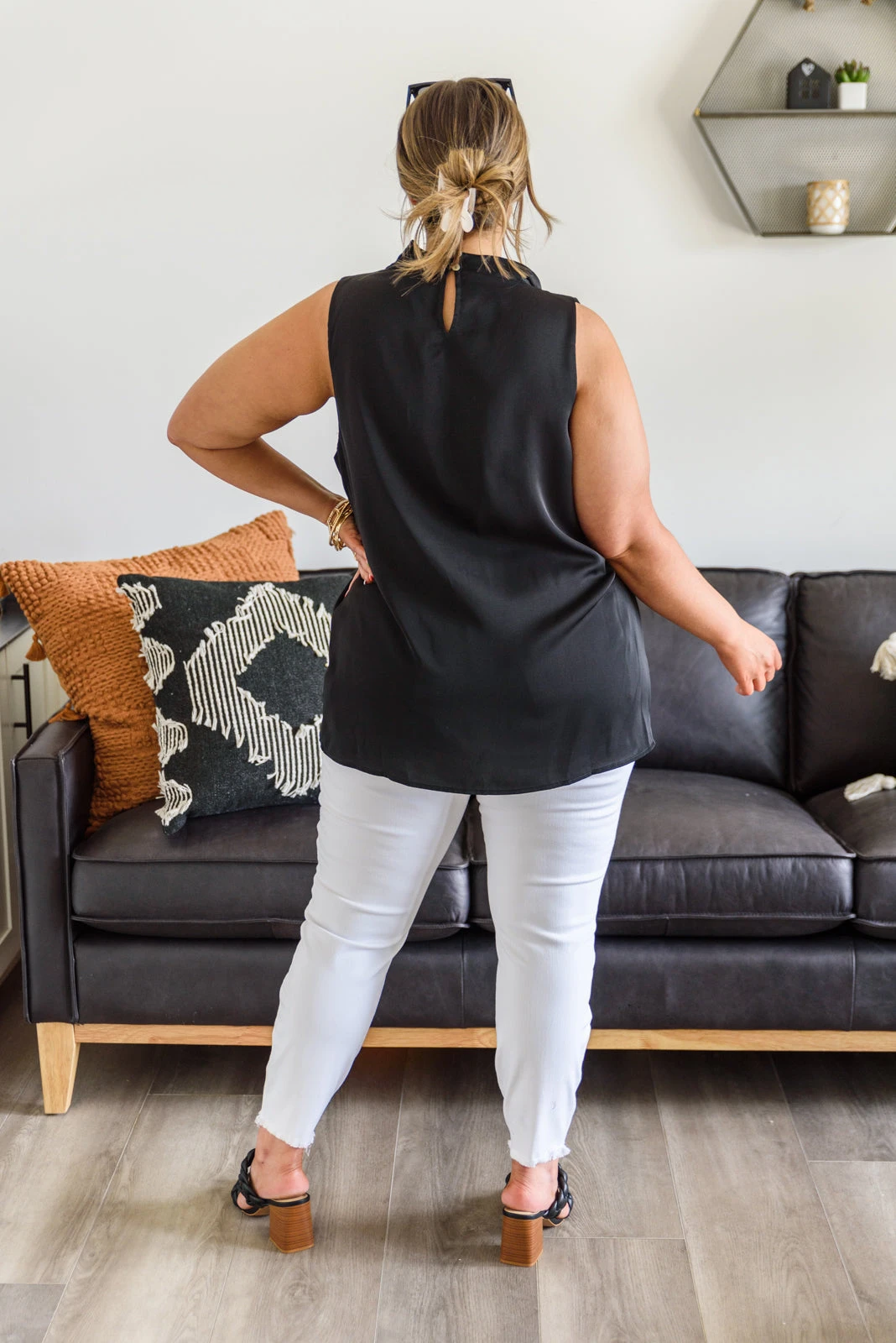 Simple and chic, the Meet Me At My Place Top will add interest to any outfit! A perfect sleeveless cut meets a slouchy high neck and finishes with a flowy bodice for the perfect timeless and classy top! Pair with a blazer, denim and heels and feel confident as ever!