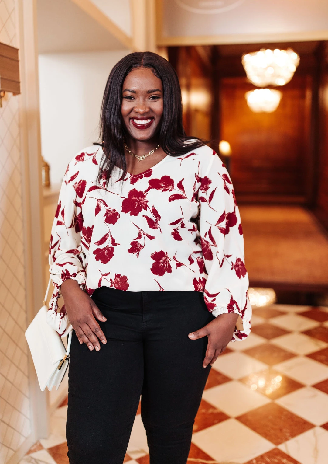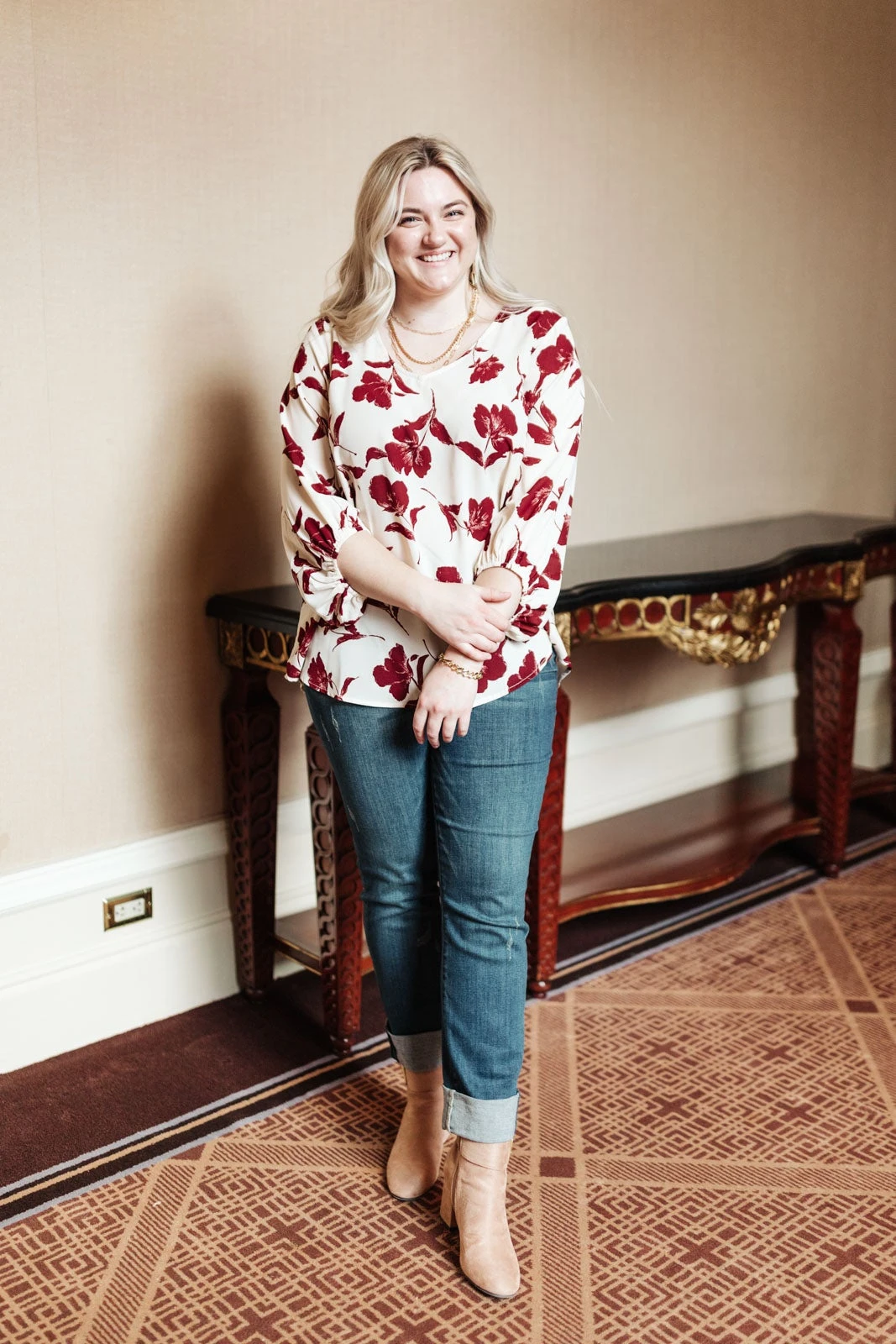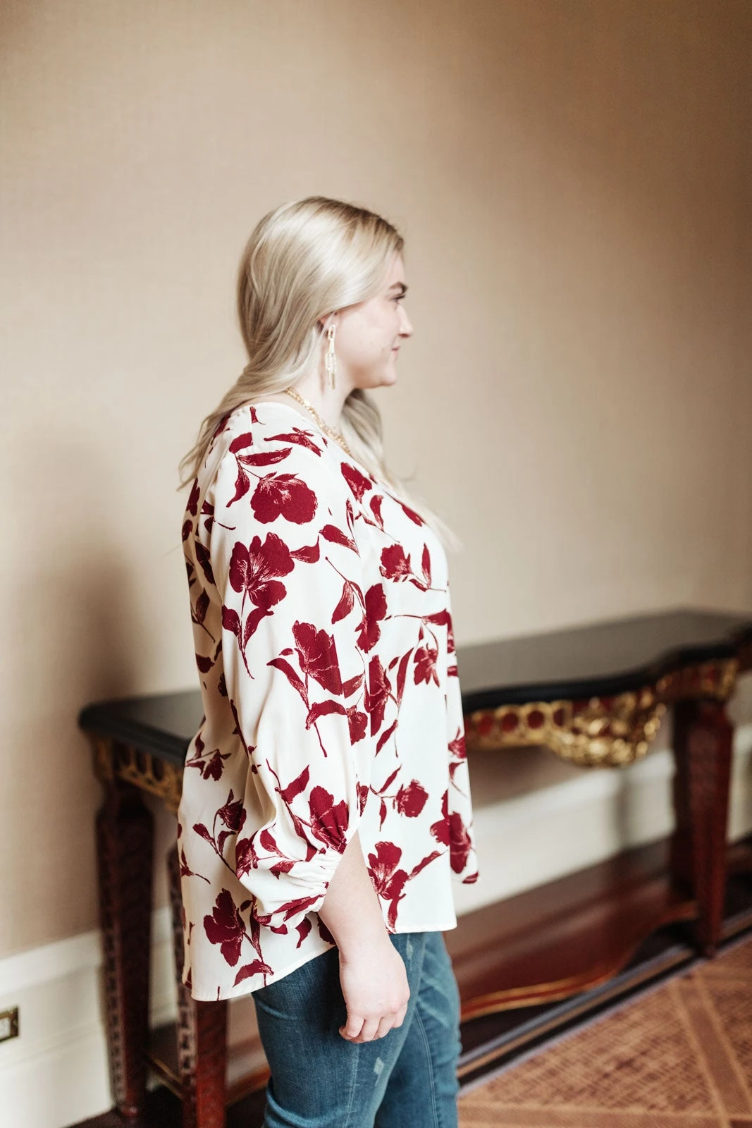 Keywords: Blouse, Red Floral, Creme, Long Sleeve