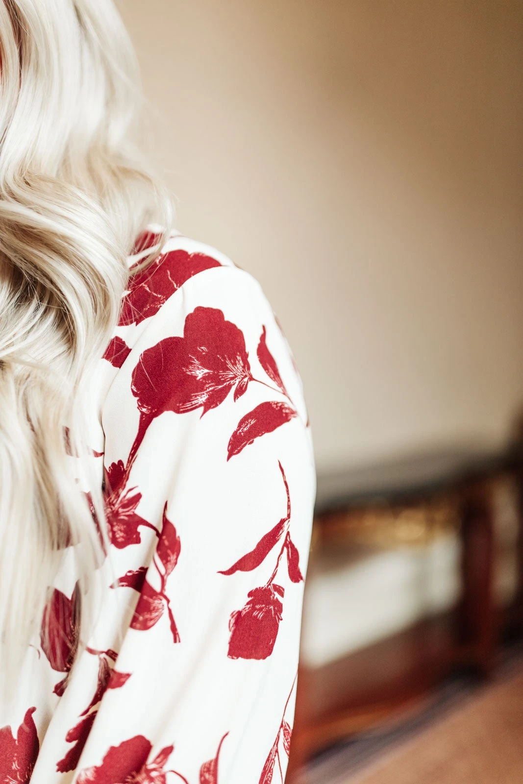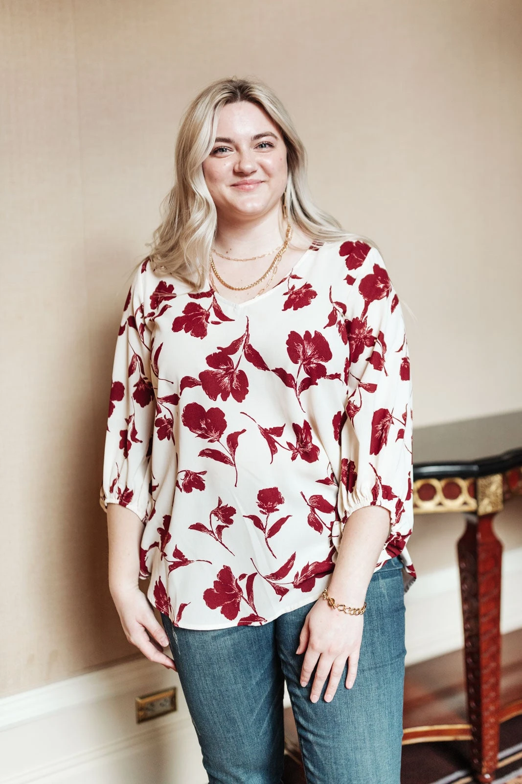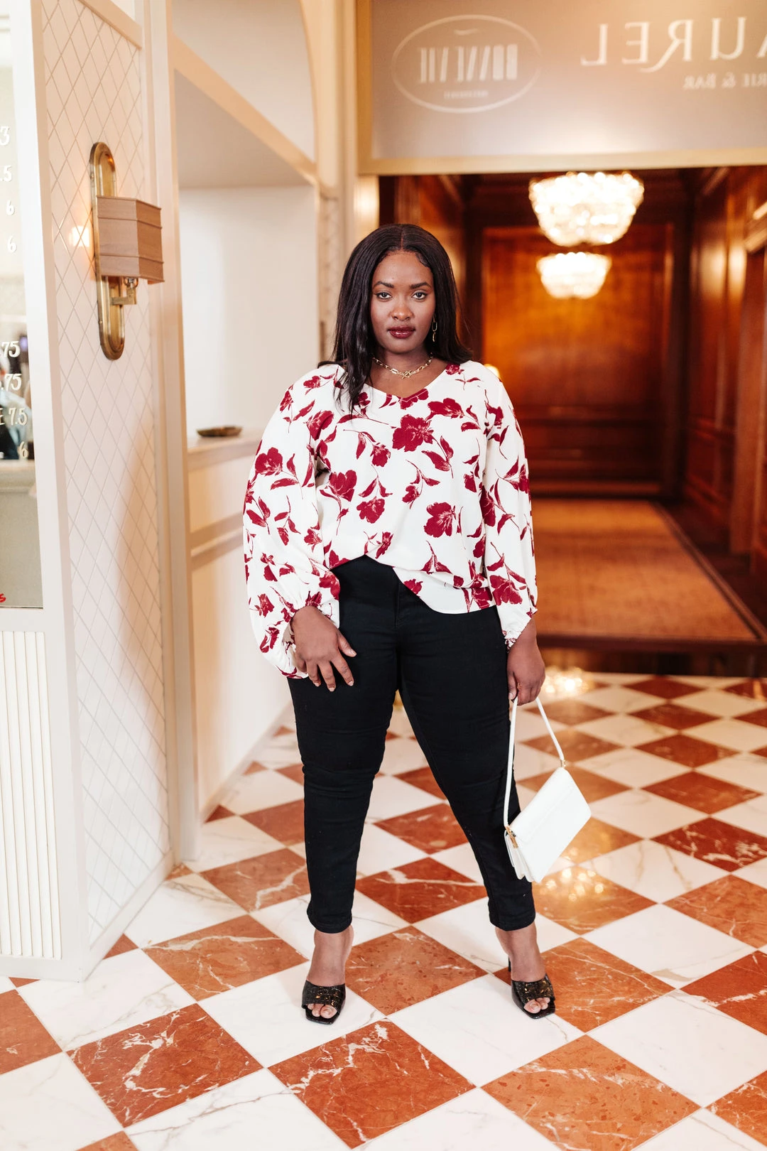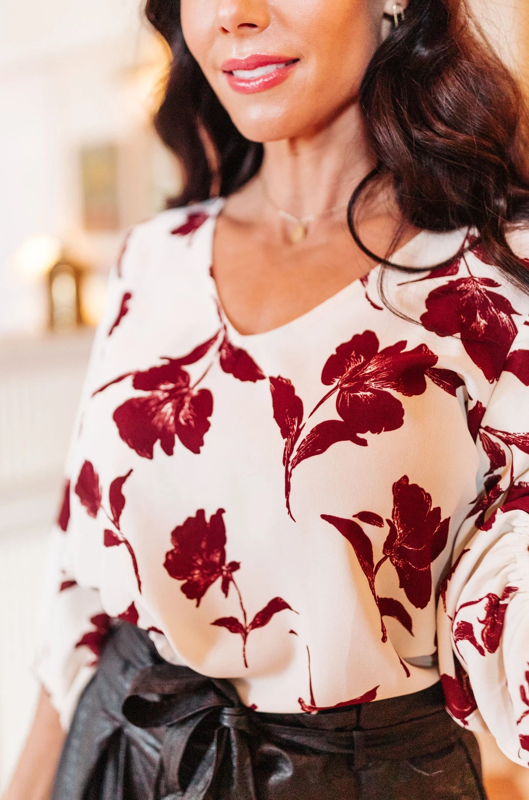 Keywords: Blouse, Red Floral, Creme, Long Sleeve