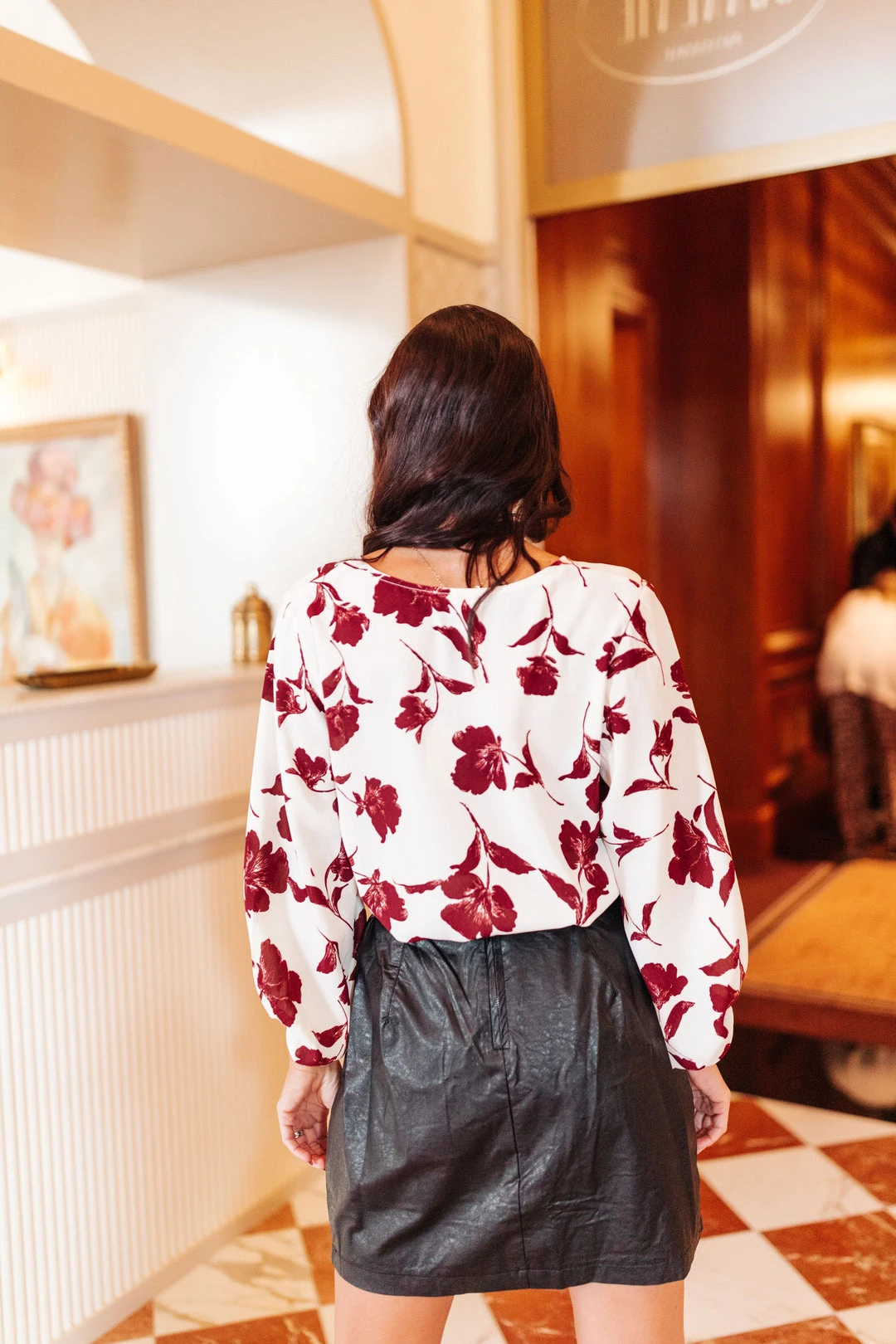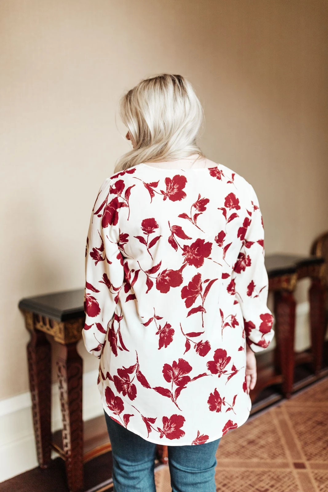 Call up your friends and get some fresh air with our Blooming Company Top! This gorgeous flowy top is composed of lightweight fabric and a beautiful red floral print throughout. This top has a v-neckline, slighty sheer, long sleeves with elasticated cuffs. Pair with a black skirt and heels for a dressed up look!