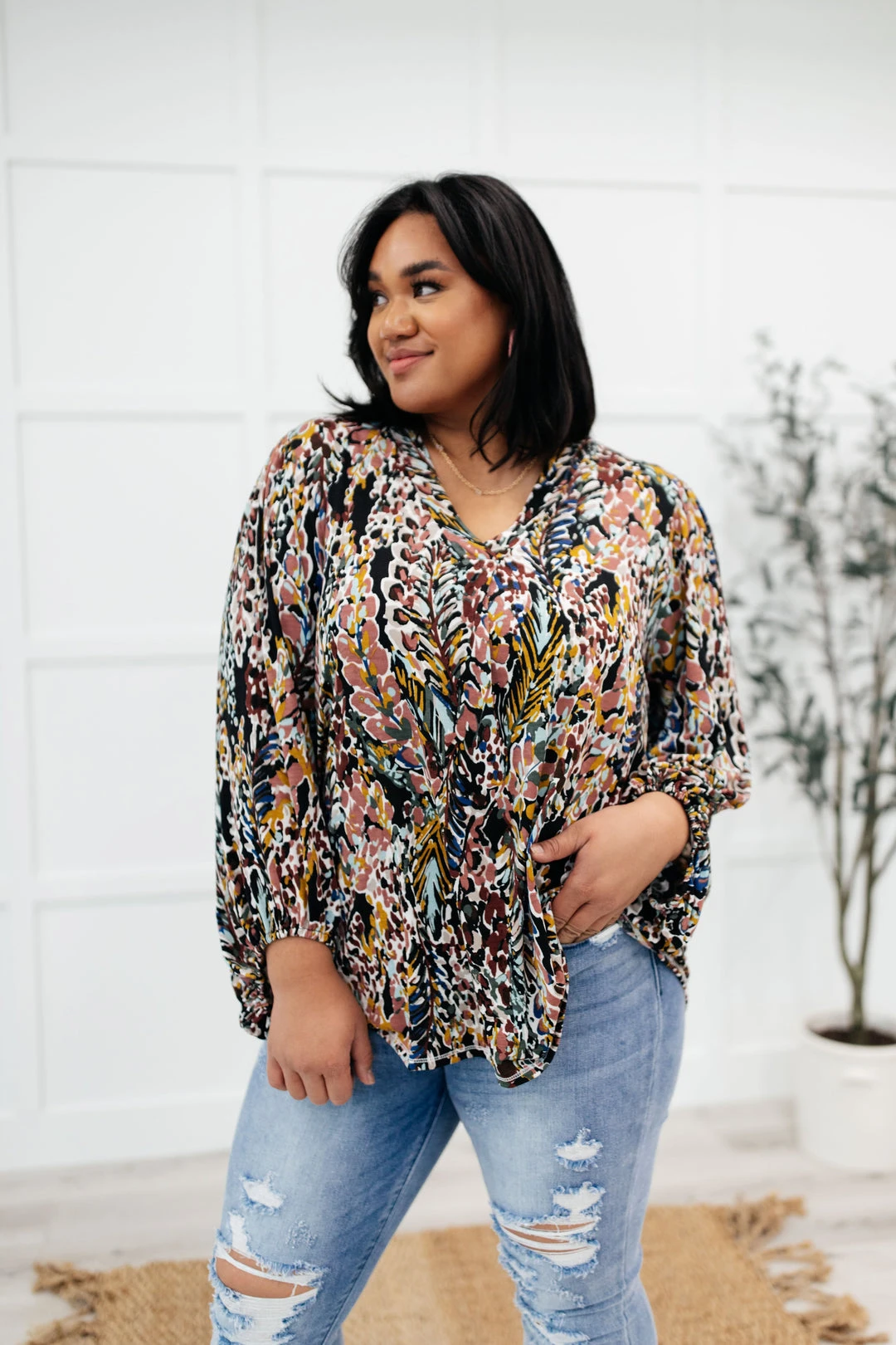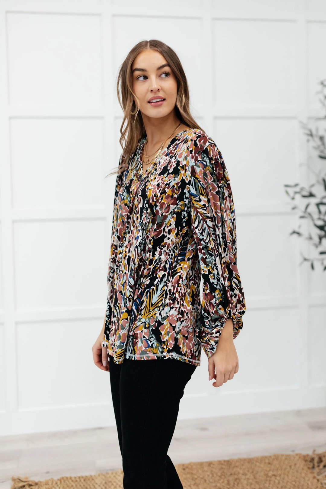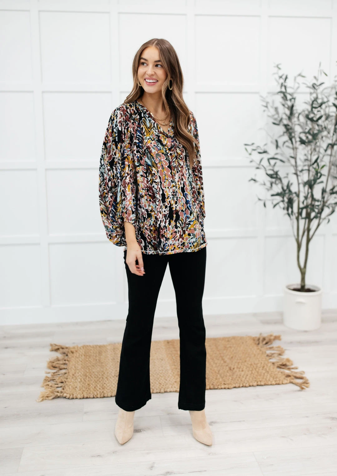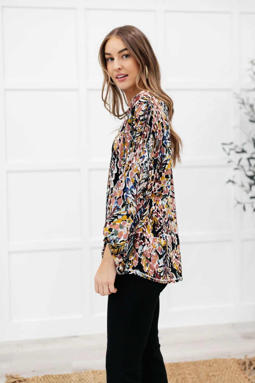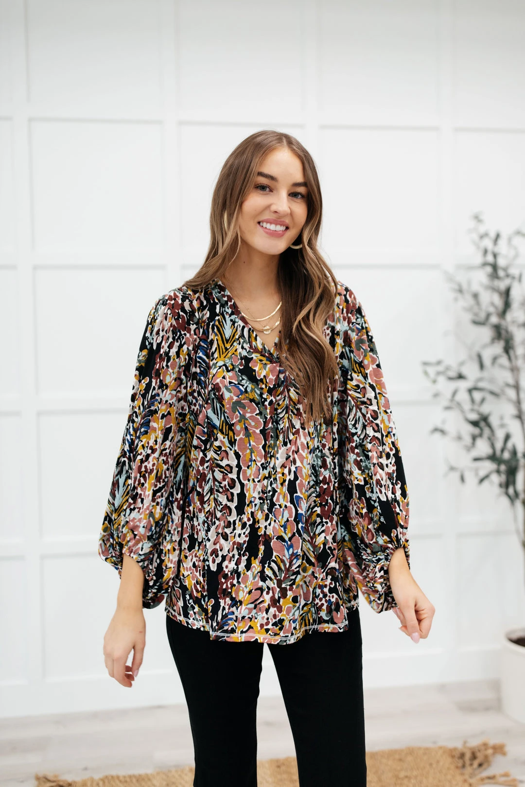 Add a touch of whimsical with the Blossom Bliss top! Featuring a lightweight chiffon with a floral print throughout, a v-neckline and billowing long sleeves. This is an absolute must for your upcoming early spring closet!