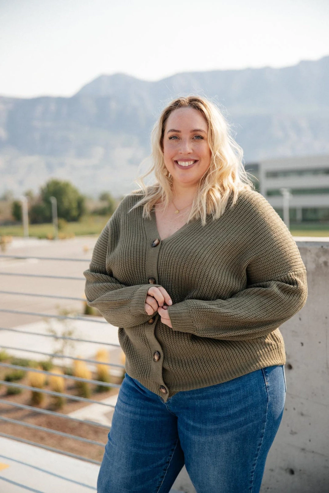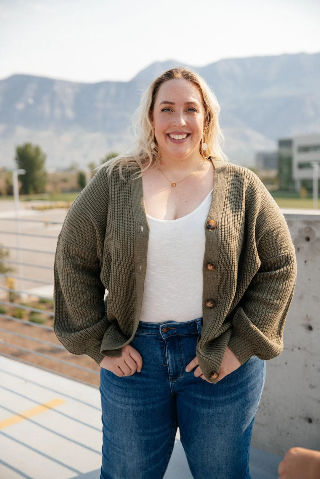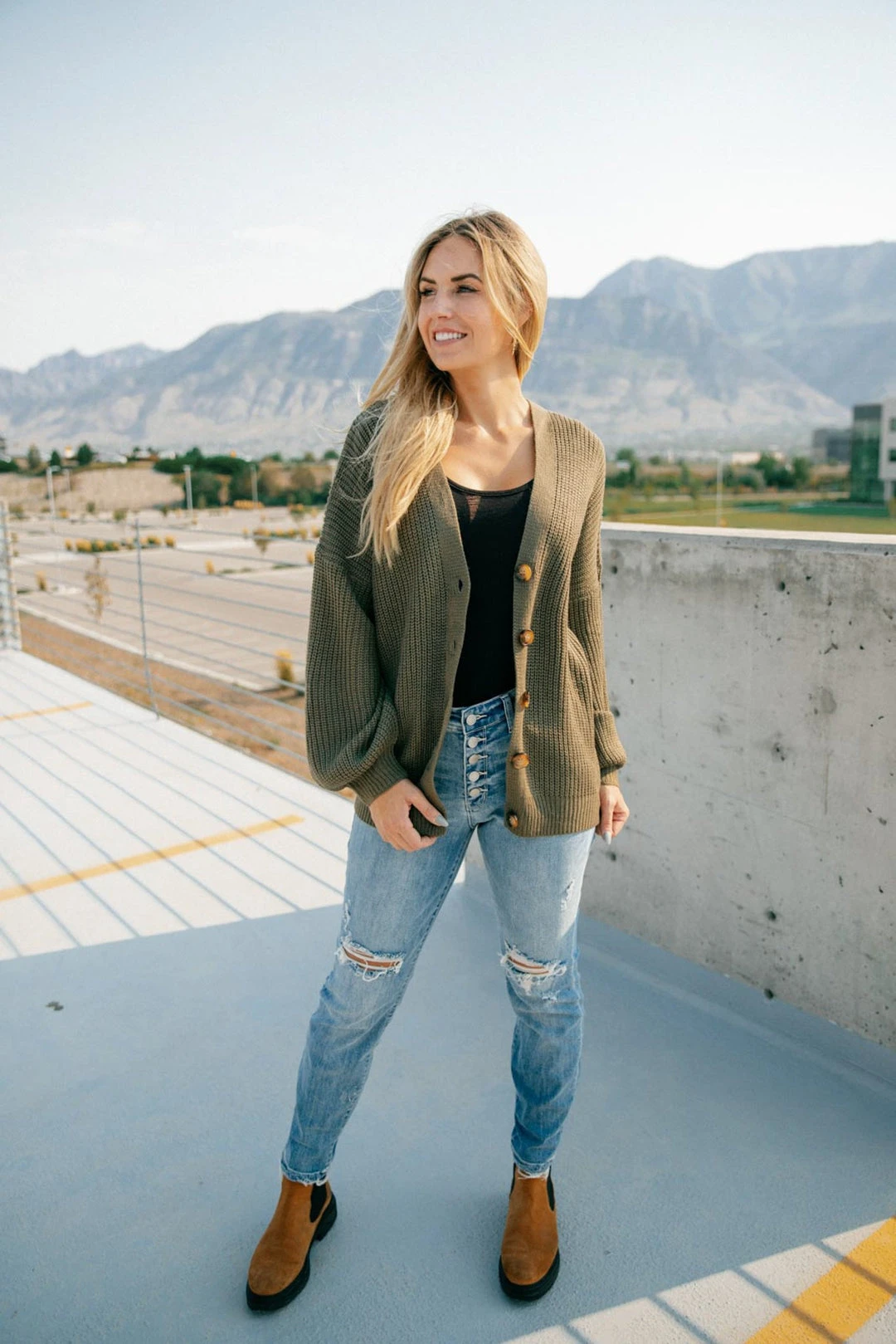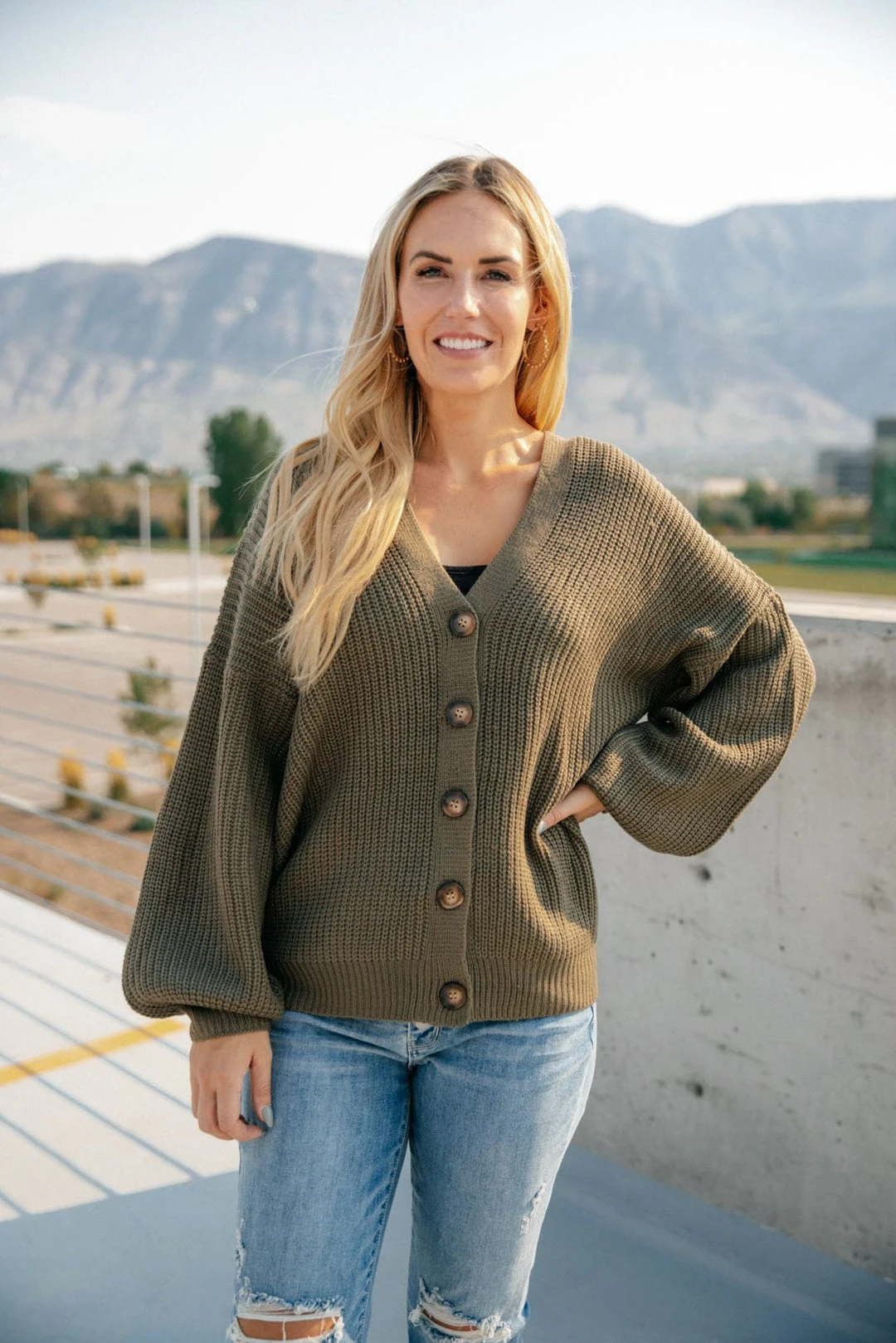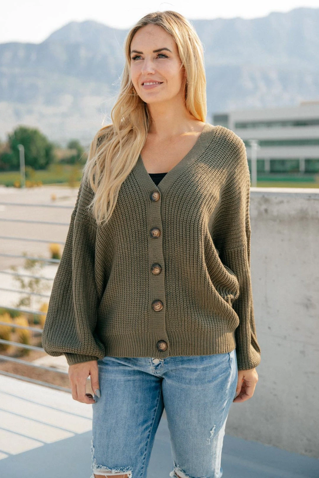 The Buttoned Up Babe Sweater is a beautiful olive green knit sweater with large functional buttons. Wear this sweater buttoned up on its own, or open with a layering tank!