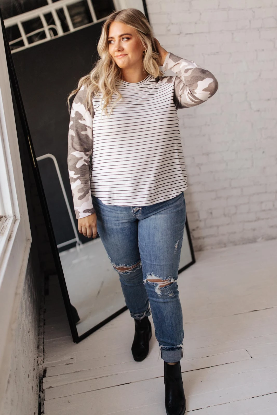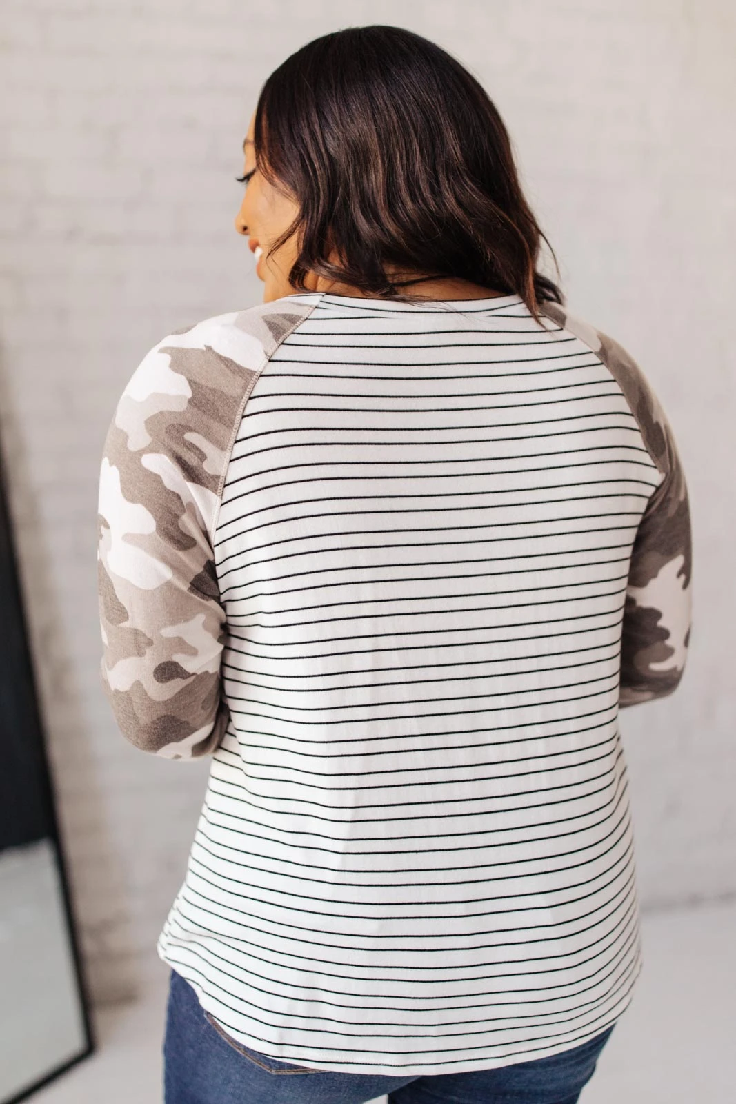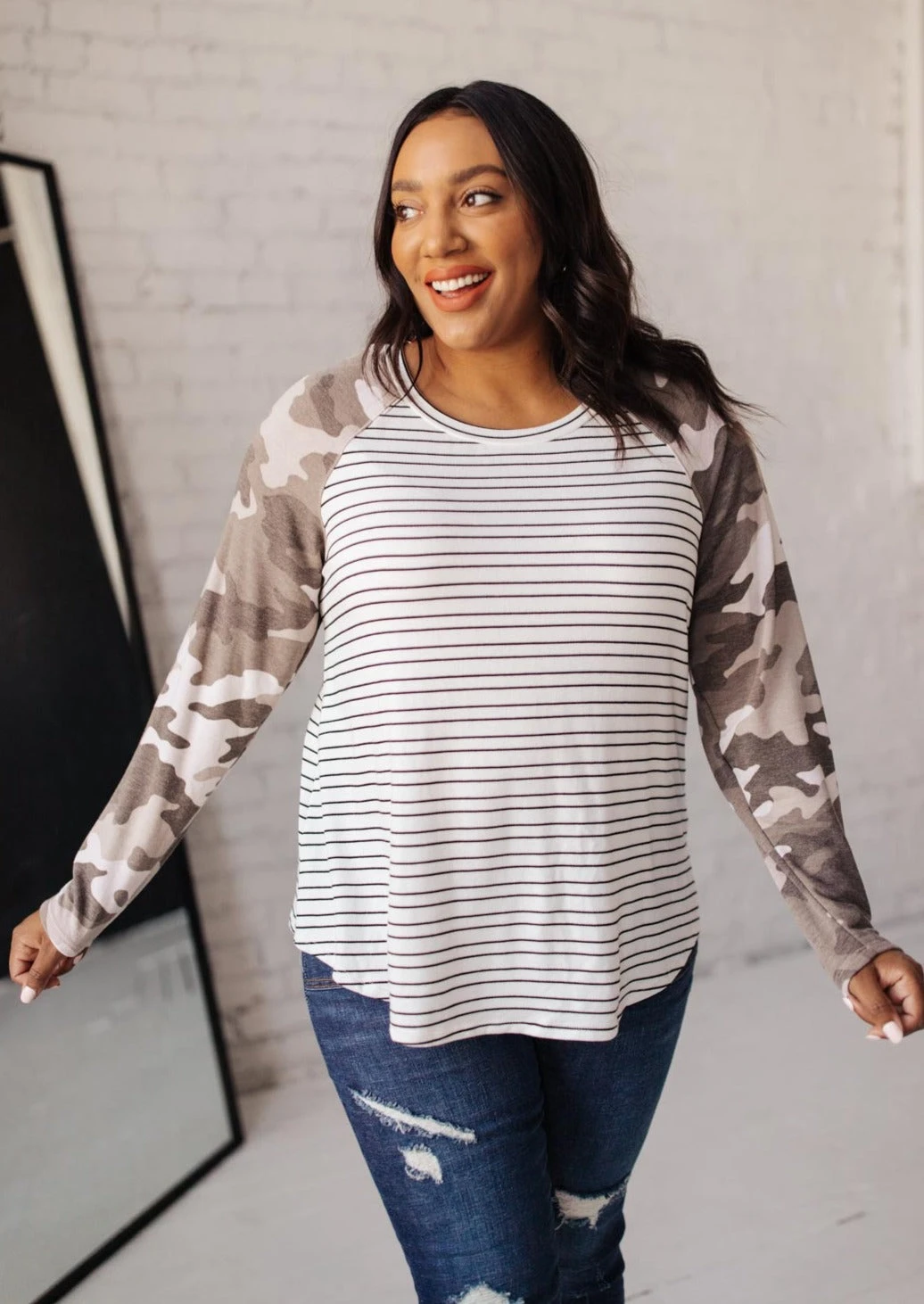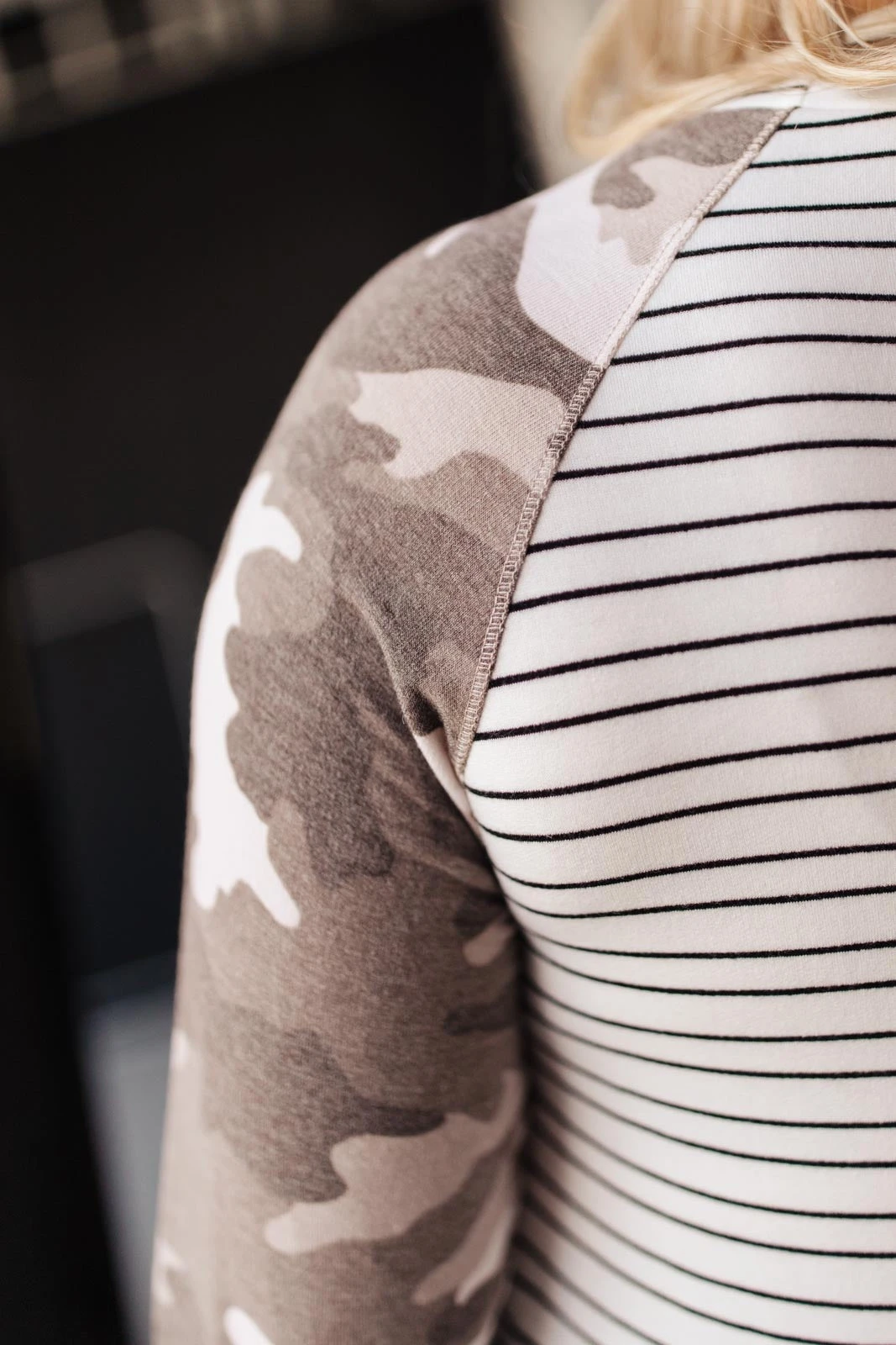 The Camo & Stripes Raglan Top is made of a soft stretchy fabric that you’ll love wearing. This top perfectly mixes two prints for a fun vibe! Pair this top with joggers or jeans.Â