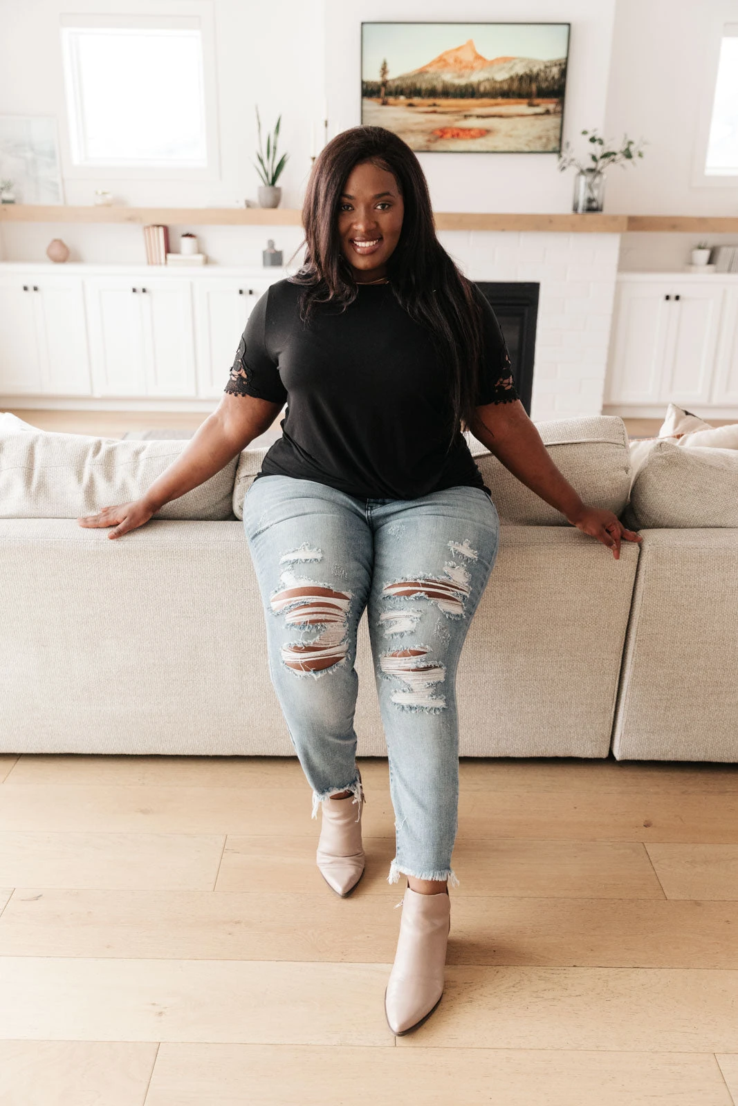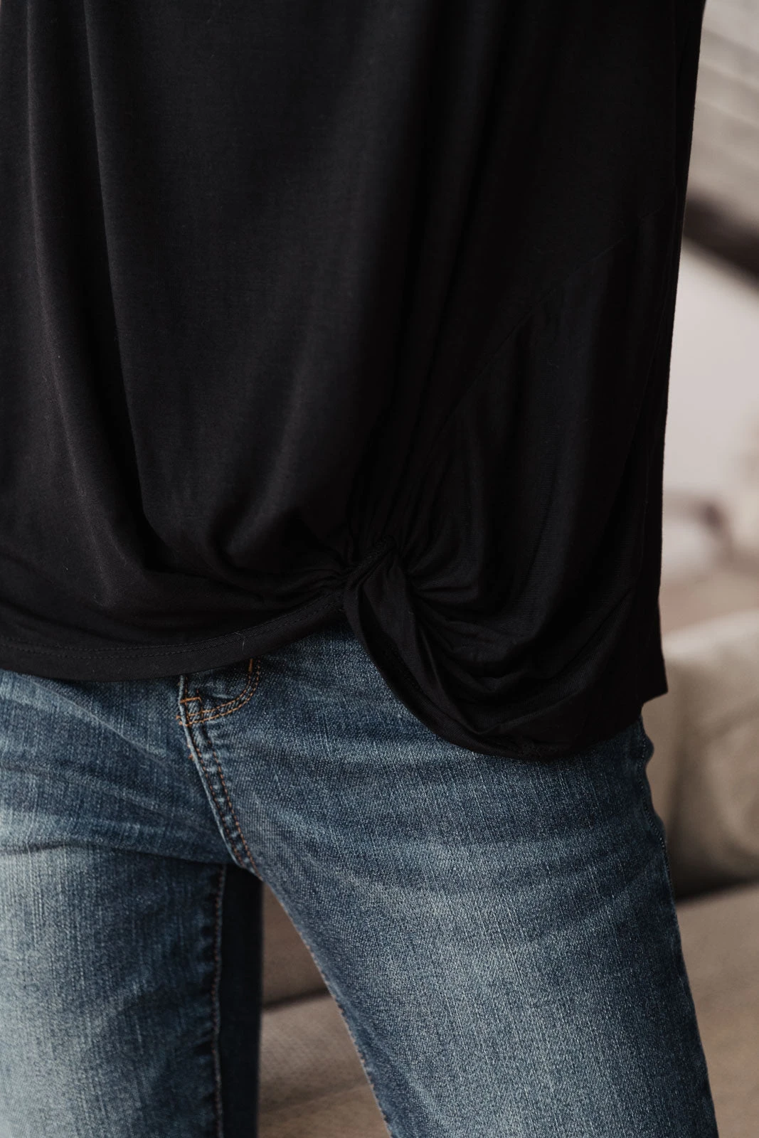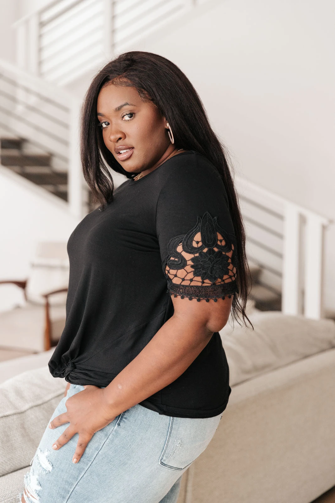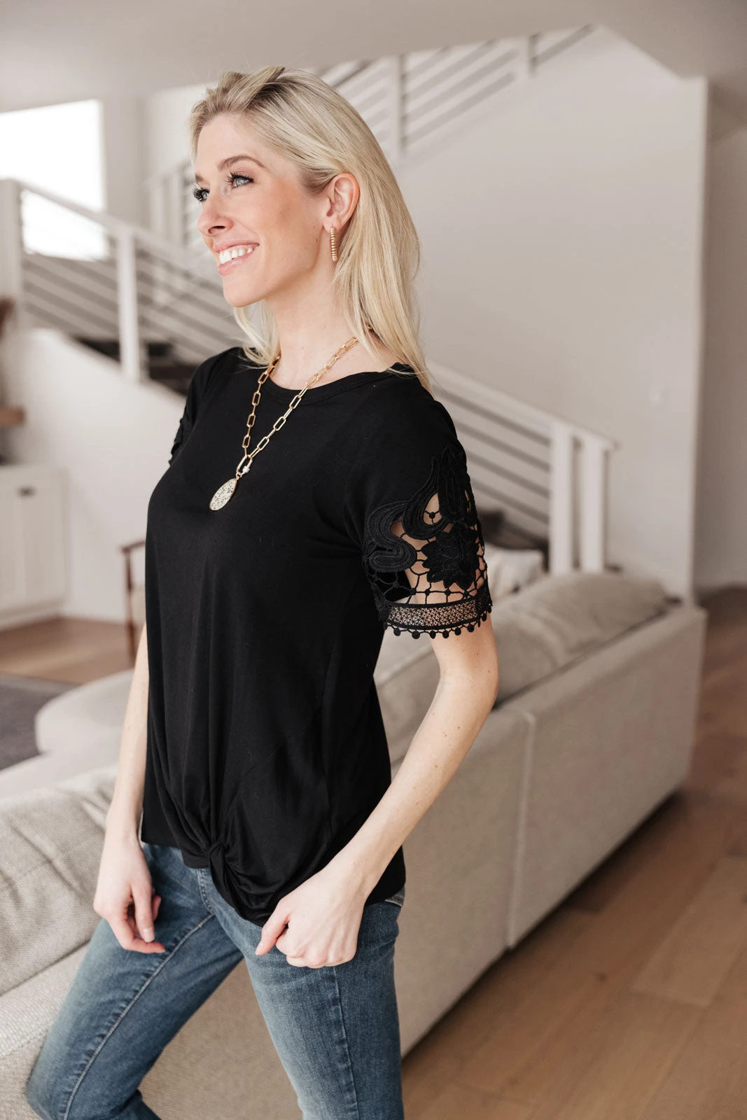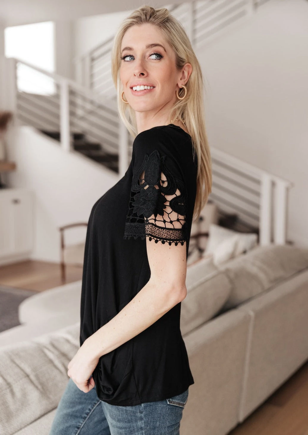 The Chloe Lace Twist Top is truly lovely! With a lace panel detailing on the sleeves and faux tie detail, this top will make you feel elegant and chic. We love this shirt styled on its own for a statement look you will feel so confident in.