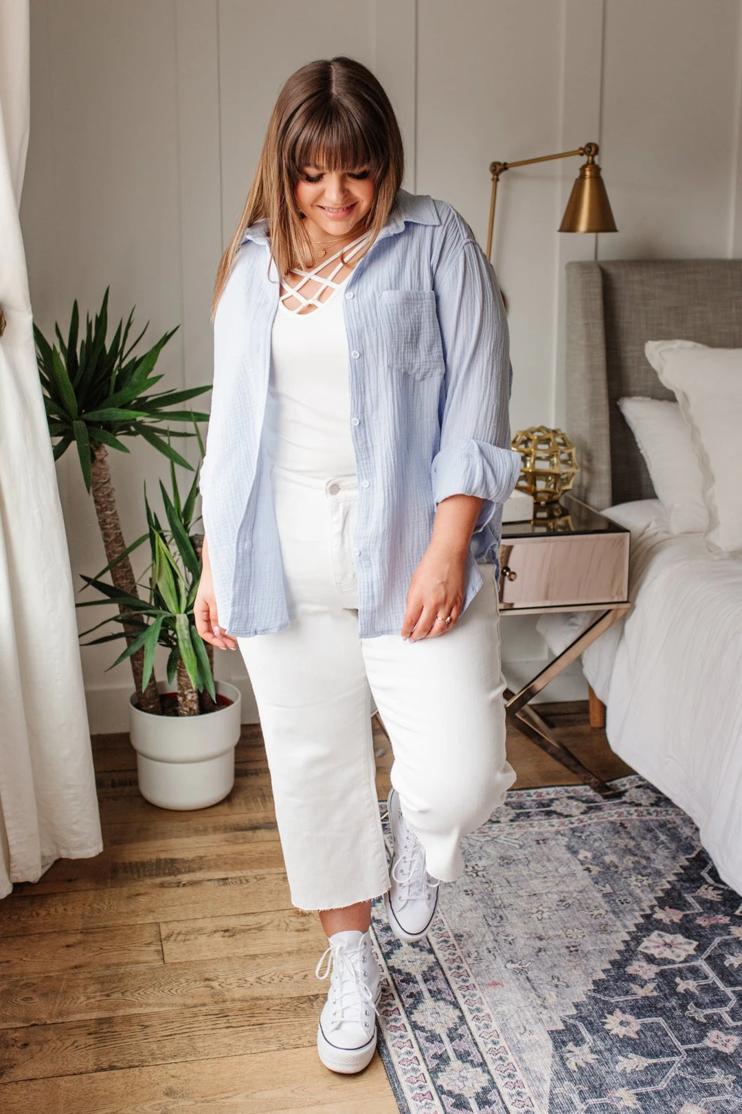 Stay cool in the Ciara Hi-Waisted Cropped Wide Leg Jeans! These adorable jeans feature a stretchy white denim, hi-waist, cropped length, and wide leg silhouette. Perfect for those hot summer days! Style with a colorful blouse and sandals for fool proof look!