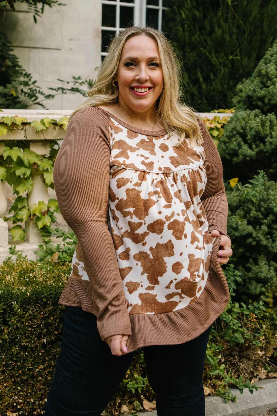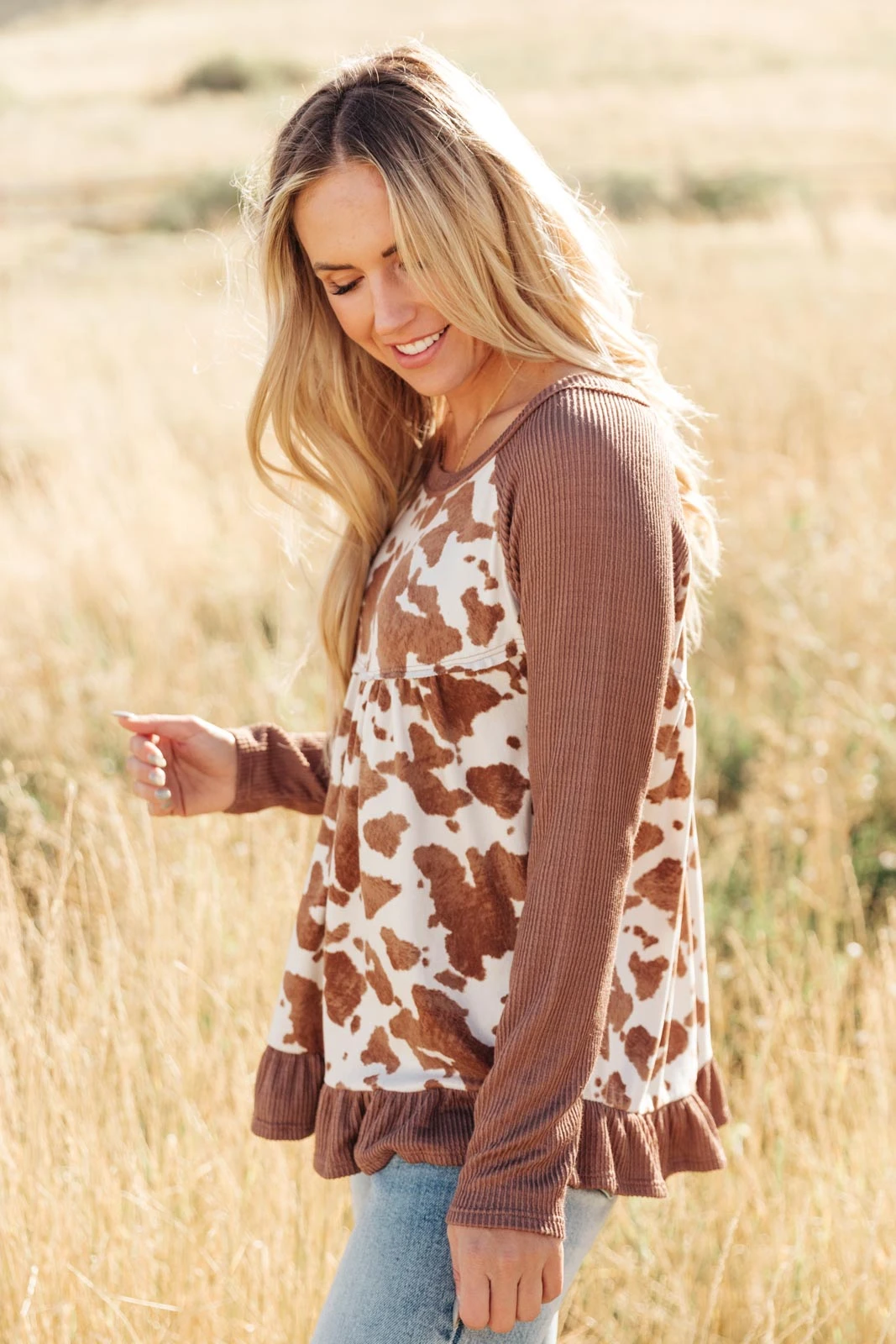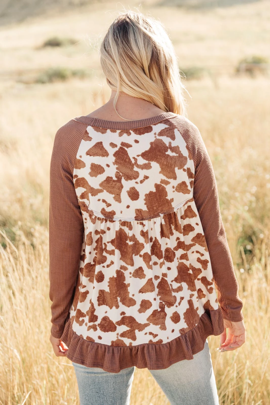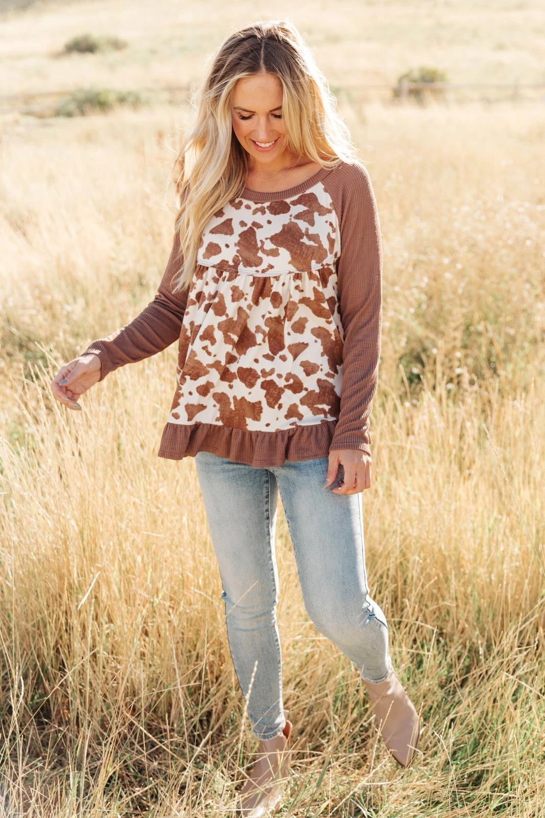 Keywords: Cow Print, Brown Top, Long Sleeve Top