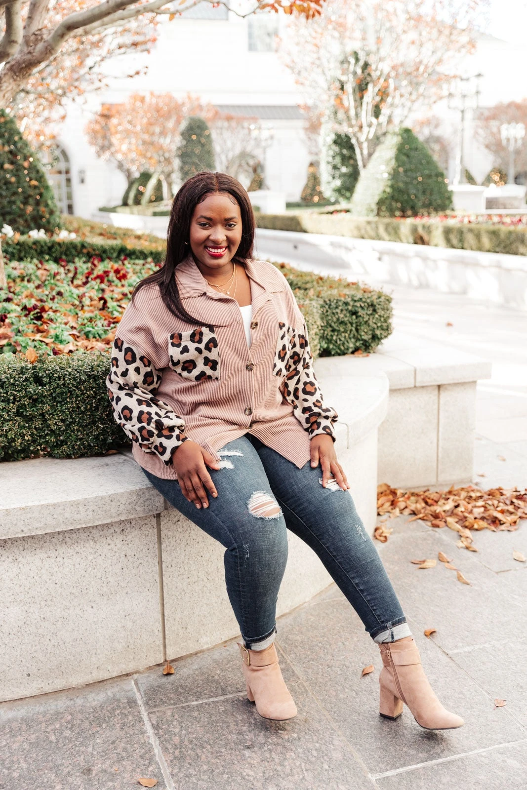 You’ll look purrr-fectly chic in the Take On Me Shacket! This beautiful layering piece has a classy animal print sleeve with a ribbed knit body. It’ll look beautiful over a bodysuit and jeans!