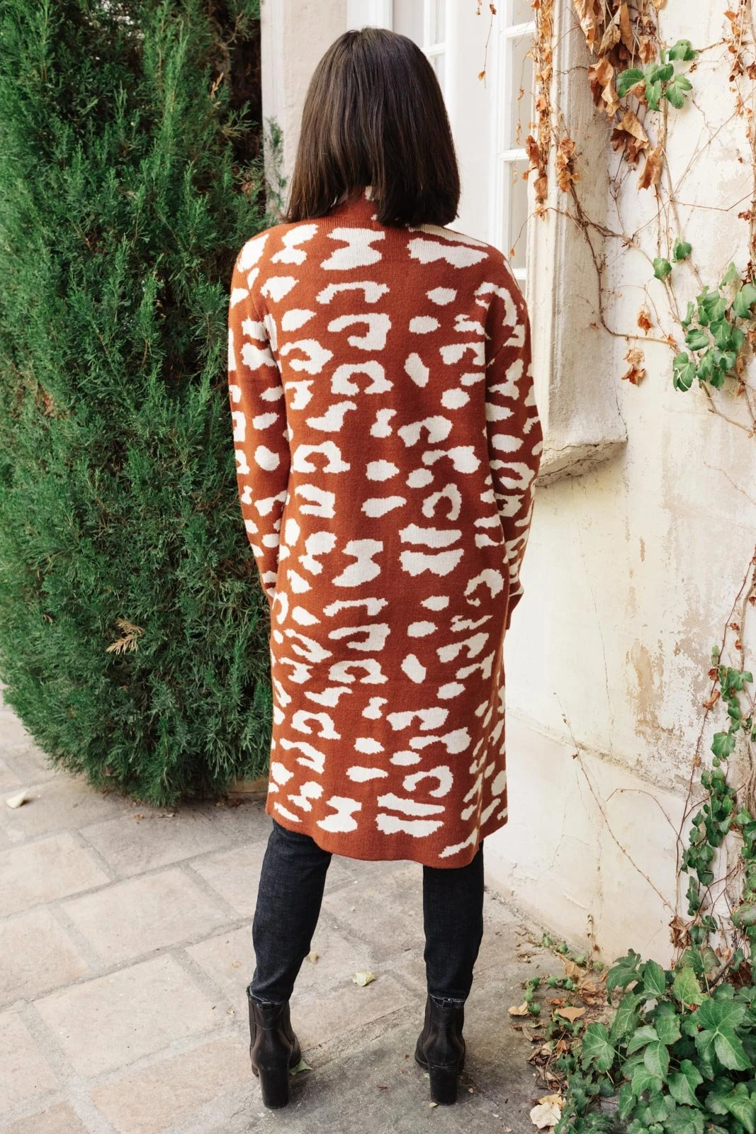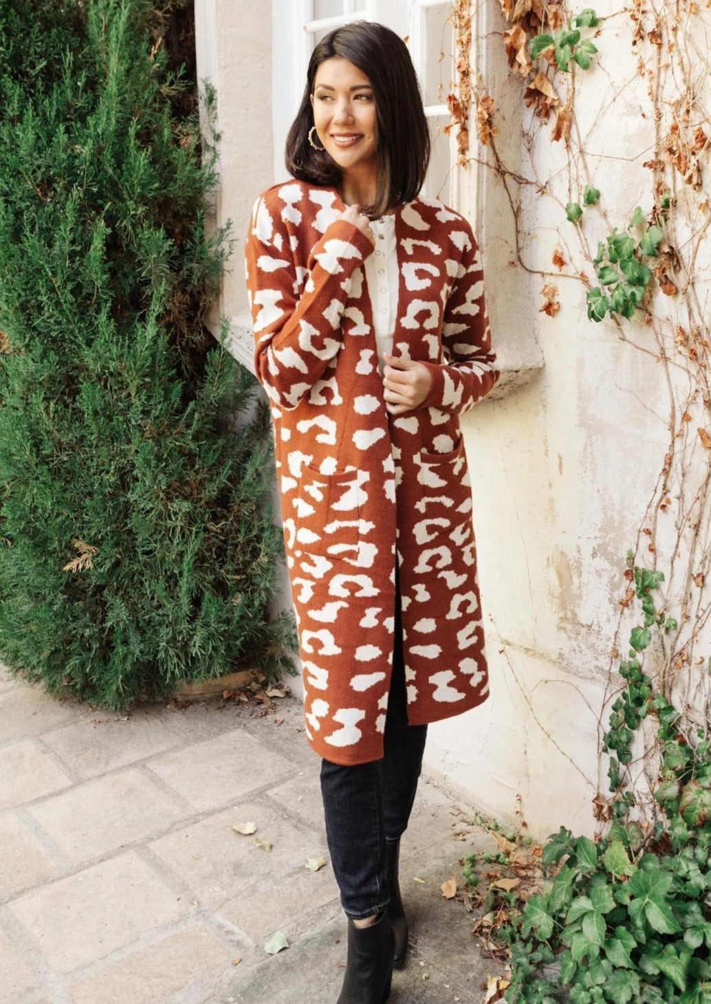 Walk on the wild side with The Ginger Feline Cardigan! This animal print cardigan is an extra long length that makes it oh so cozy! The burnt orange is the perfect way to add a pop of color to your outfit. We love styling this cardigan with jeans and a blouse, or dressed down with joggers and a bodysuit.