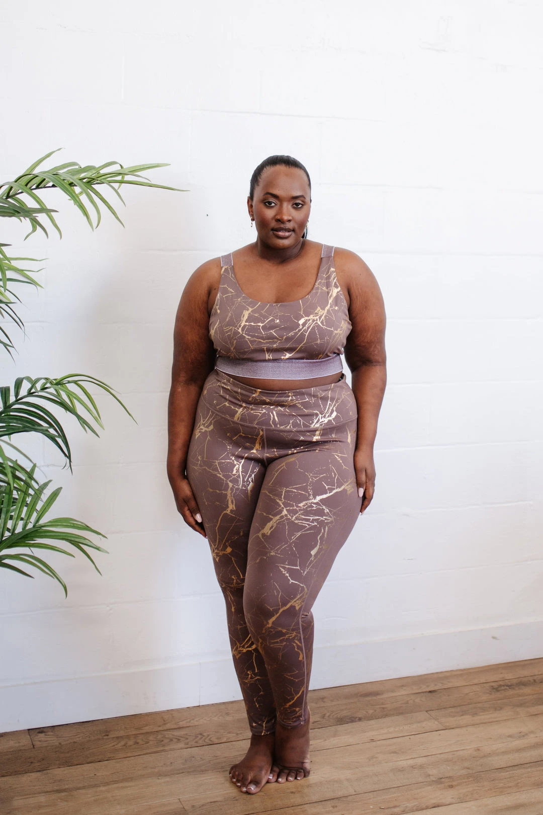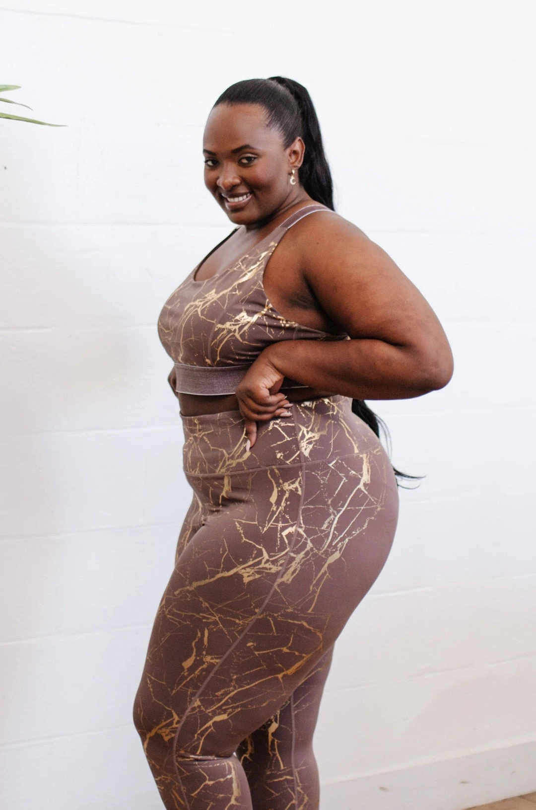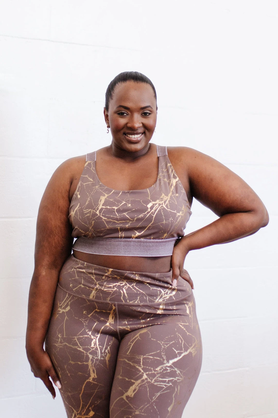 The Cocoa Kisses Sports Bra is your most important workout buddy! In a cocoa brown, decorated in a dreamy gold marble print, you will have the gym fit of your dreams!