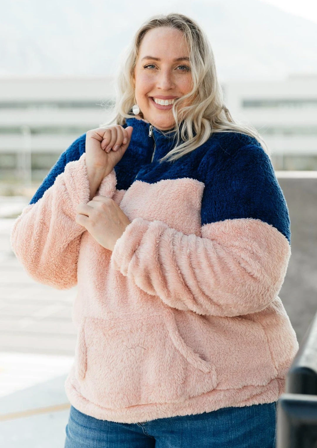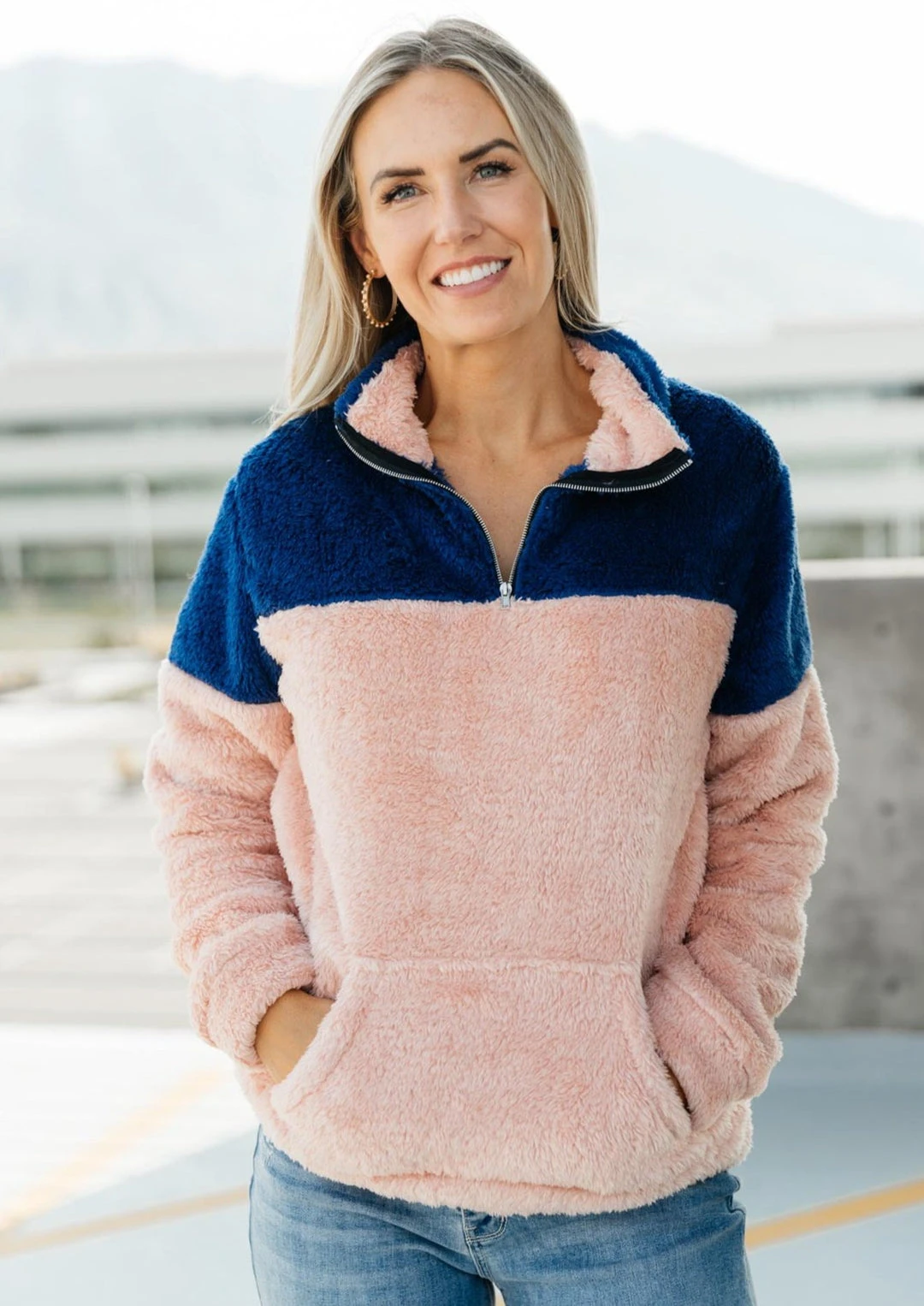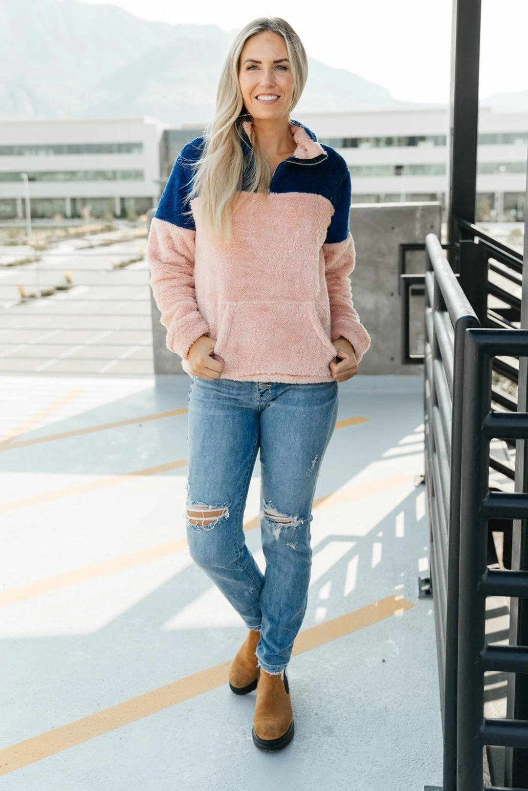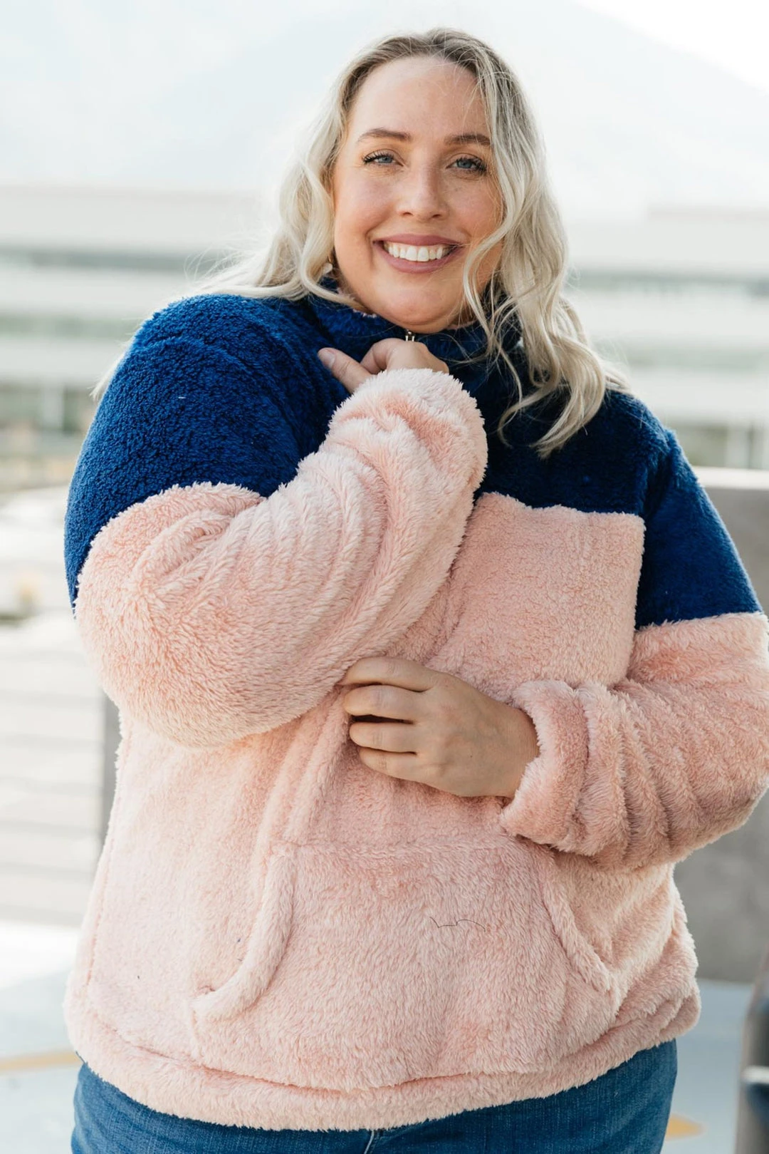 The Cozy Dreams Pullover is a color blocked, ultra soft pullover. This comfy top has a hoodie pocket and zipper neckline. Pair it with jeans and boots for a cozy fall look.
