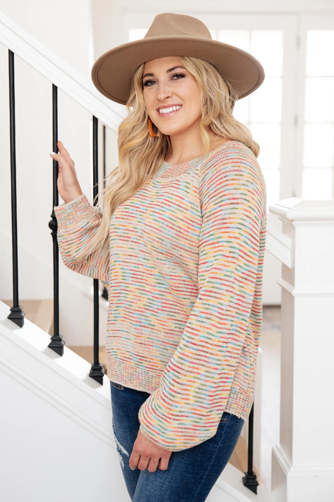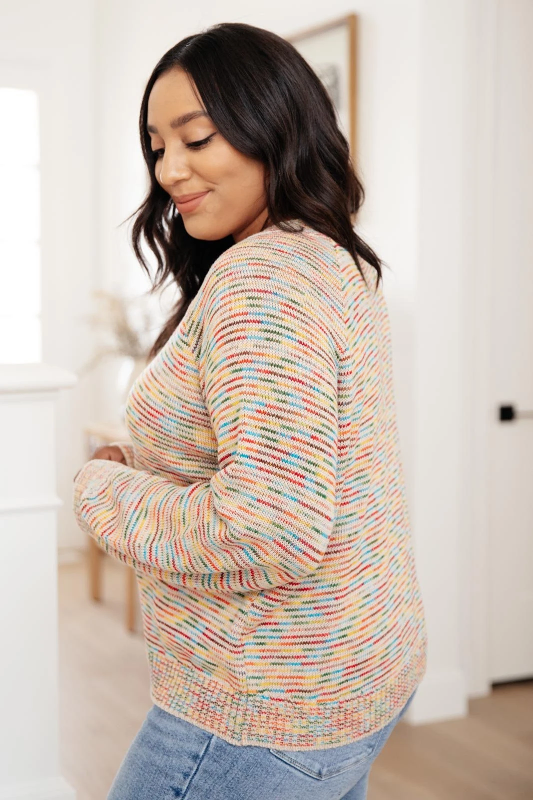 We can’t get enough of the Cozy In Color Sweater! This sweater has a comfortable fit and adorable details in the matching wrist and neckline. We love the neutral base with mismatched stripes of color. Pair this sweater with jeans and boots.