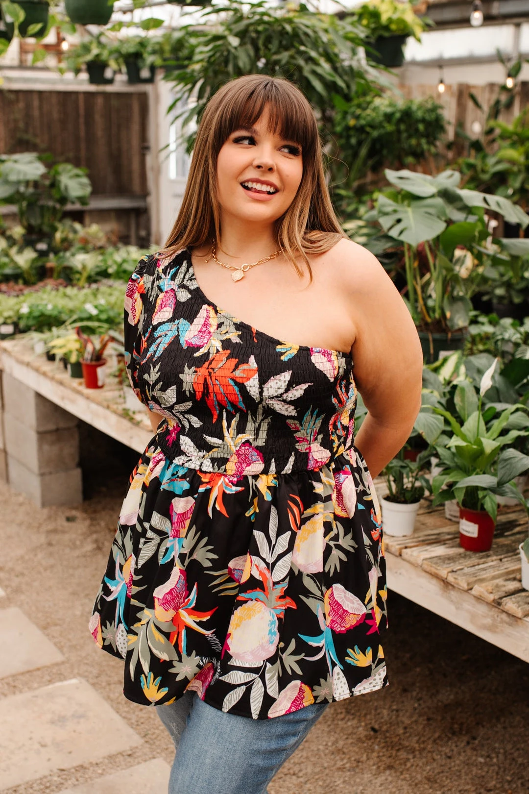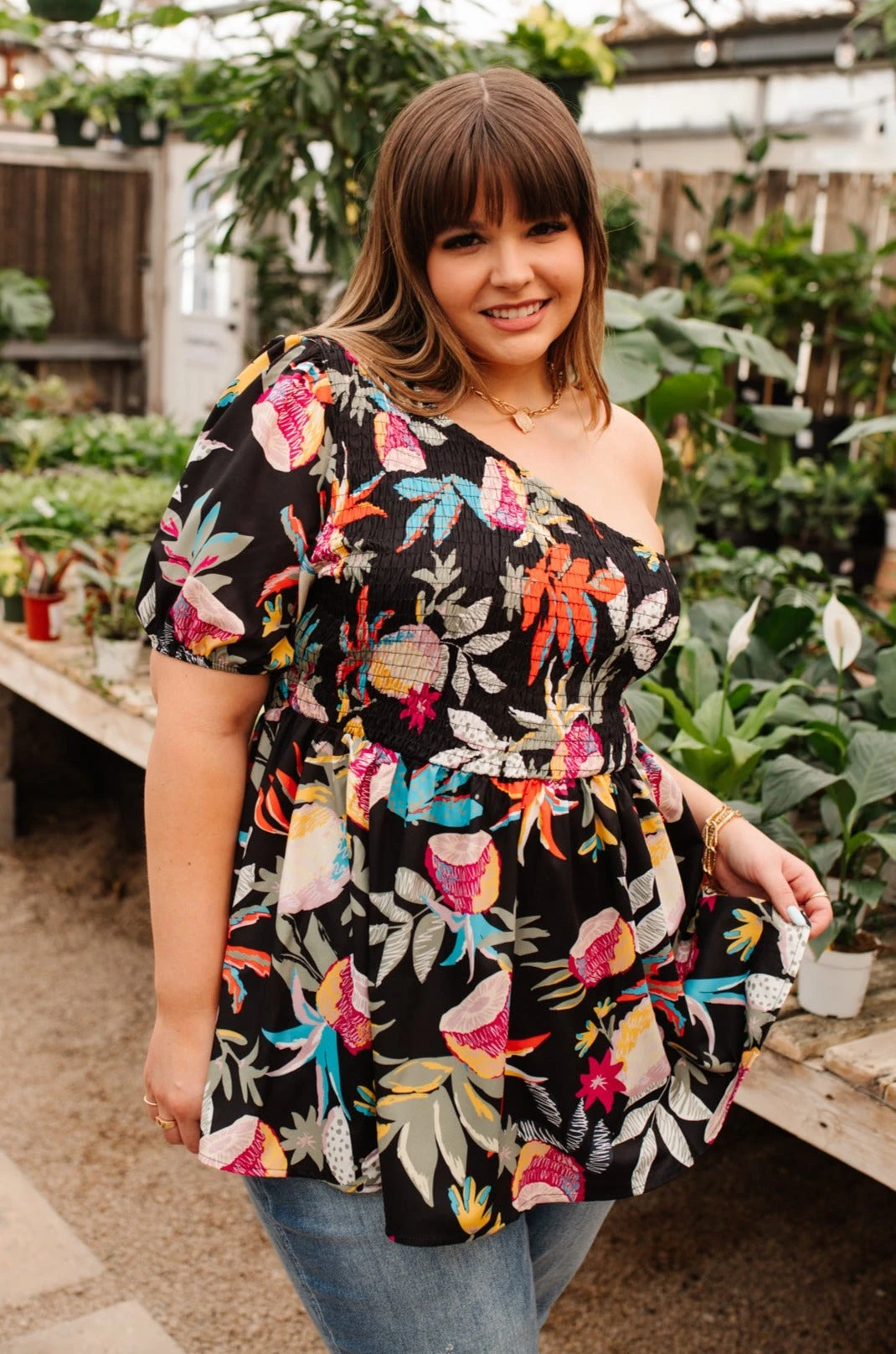 Say goodbye to your basic summer tops with the Day Trip Blouse! An adorable one shoulder silhouette falls into a shirred bust, and peplum style bodice, with a puff sleeve elasticated at the cuff. Style this bold top with white skinnies, sunnies, nude sandals, and bright accessories for a fun resort inspired look!