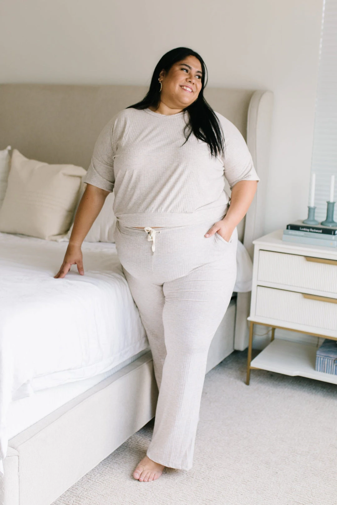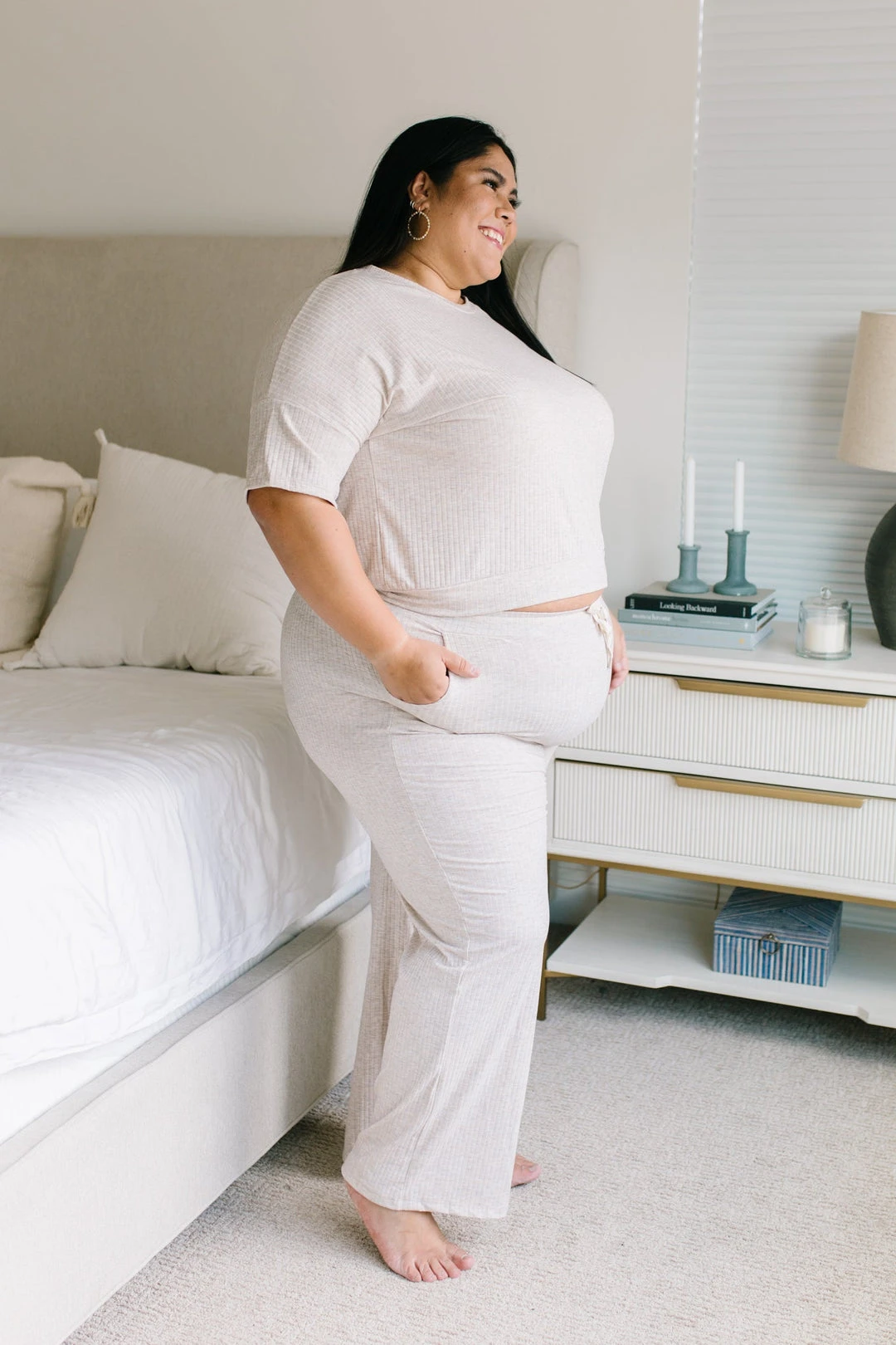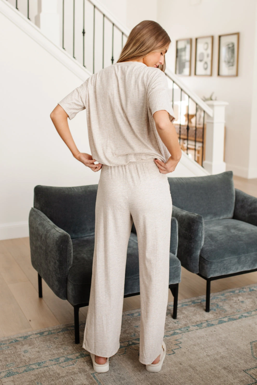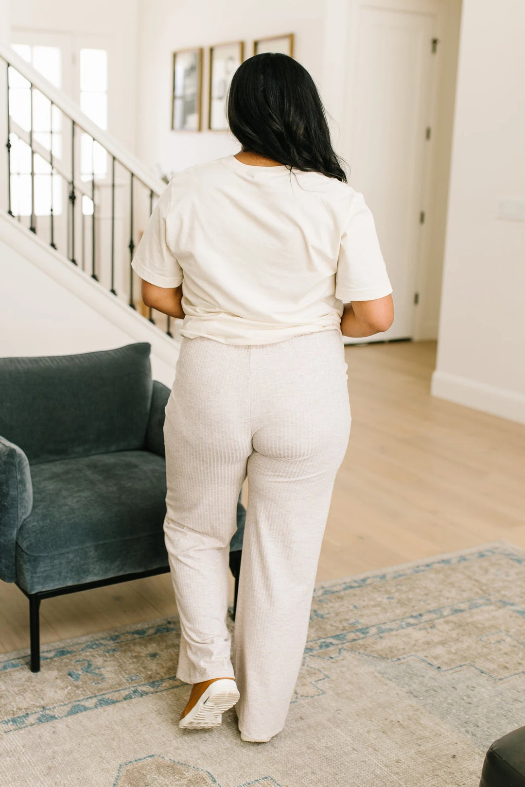 These comfy cozy pants make a great combo with movies and the couch! A soft ribbed fabric shapes an elastic high waist with tie detail, side seam pockets, and straight leg silhouette.