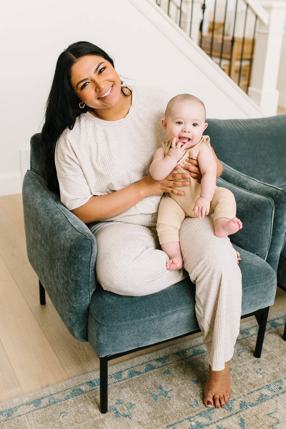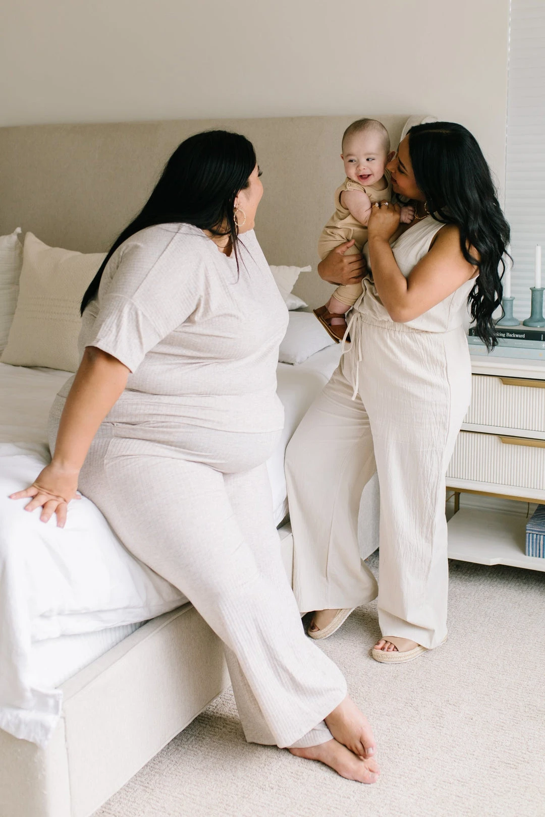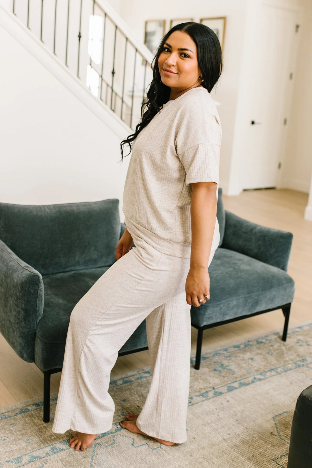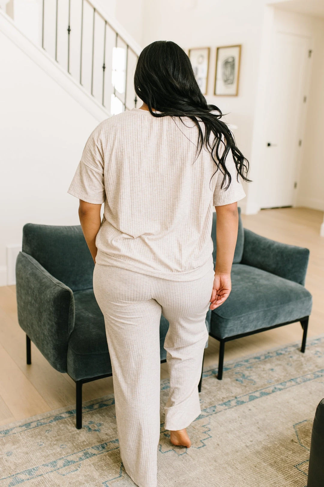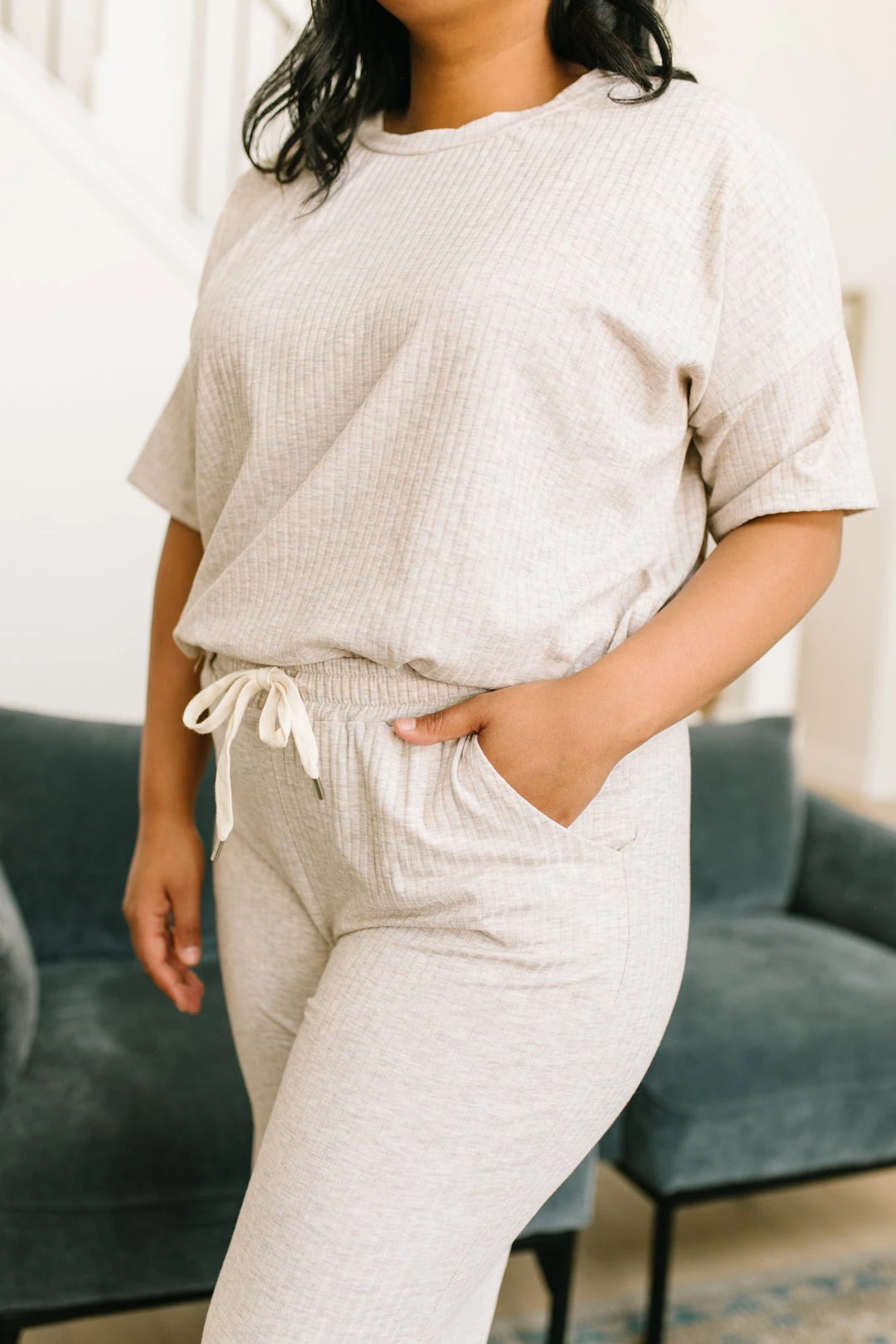These comfy cozy pants make a great combo with movies and the couch! A soft ribbed fabric shapes an elastic high waist with tie detail, side seam pockets, and straight leg silhouette.