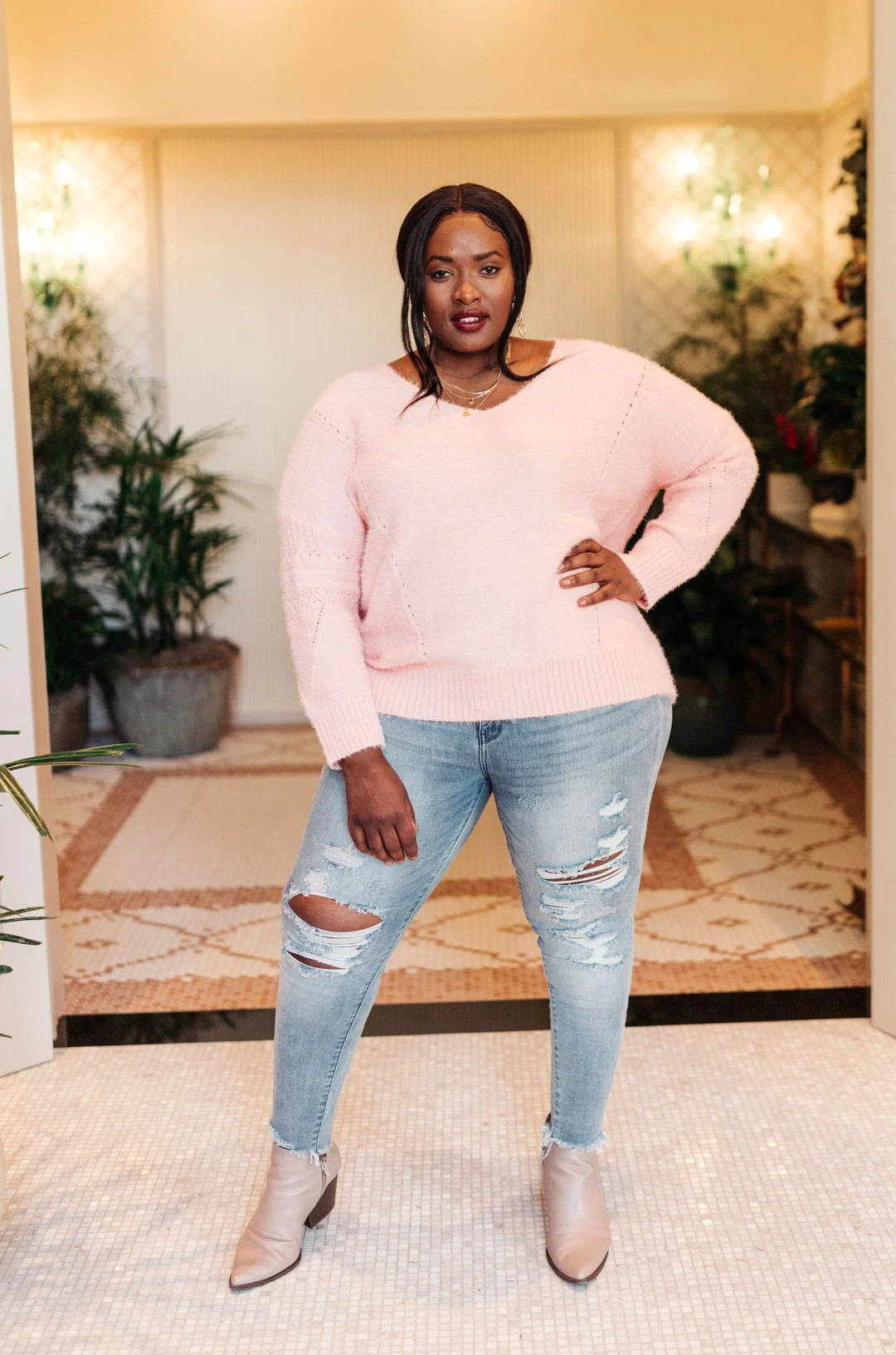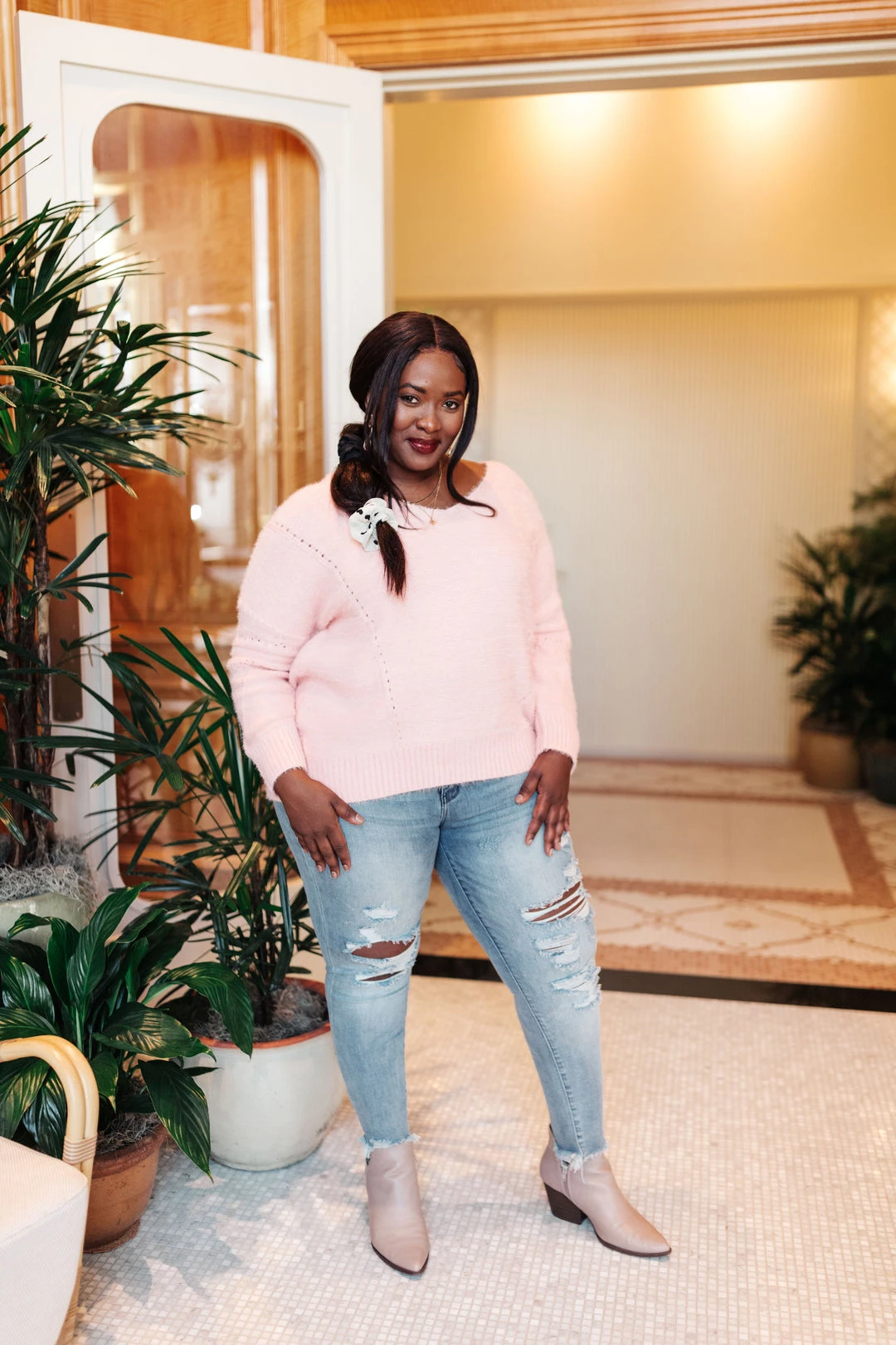 The Dream State Top In Pink is kitten-on-a-cloud soft! Pink knit sweater, fuzzy eyelash knit composition that shapes a rounded neckline and a slouchy bodice. Long sleeves with open keyhole detailing along the sleeves and front. Pair with light wash denim and boots!