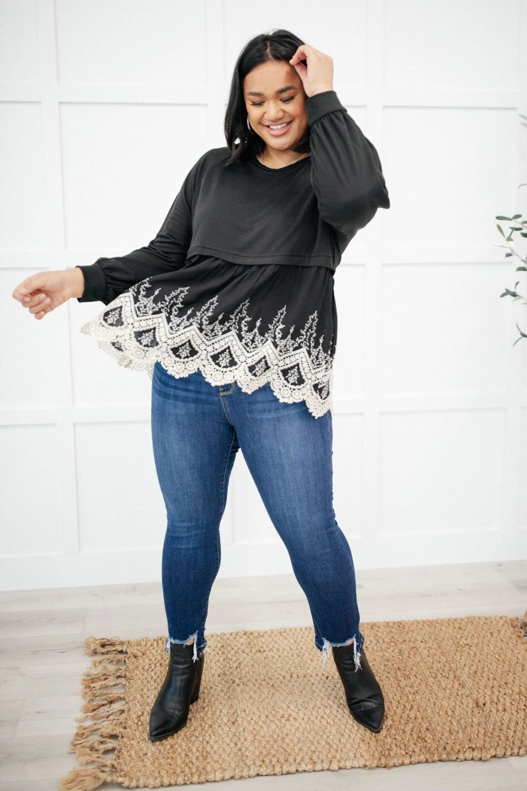 The top of our dreams has finally hit the shelves! This gorgeous top features a lace hem detail and balloon sleeves. The relaxed, casual fit will have you stay comfortable yet chic all day long! Pair it with your favorite skinnies.